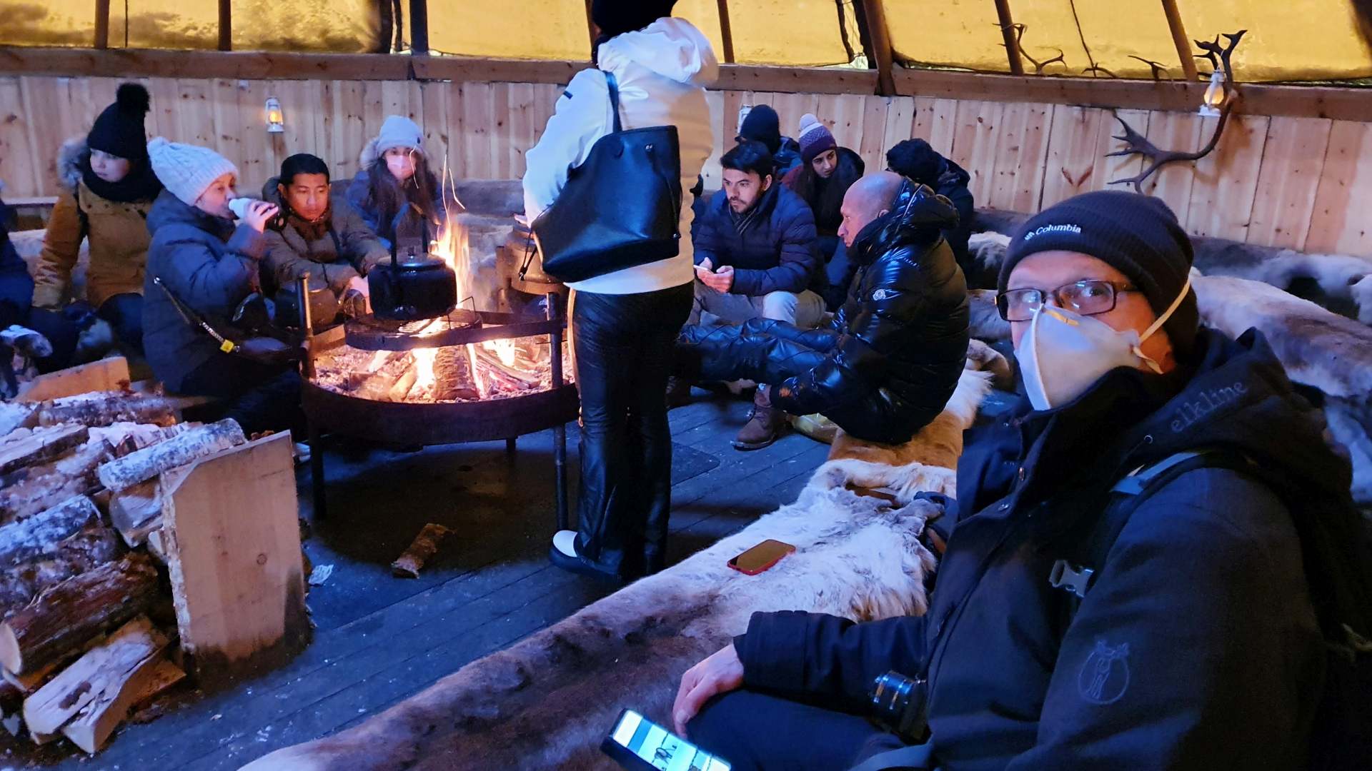 Die Tiere sind nett, die Leute natürlich auch, die Suppe gehaltvoll, wir nehmen alles mit Humor und flüchten erst beim kulturellen Teil, der uns Lieder und die Geschichte der Sami vermitteln soll. Nicht wegen der Kultur, sondern wegen Covid. Das Lavvu – das Zelt der Samen – füllt sich zum Schluss mit derart vielen Menschen, dass wir Omnikron geradezu herumfliegen sehen.