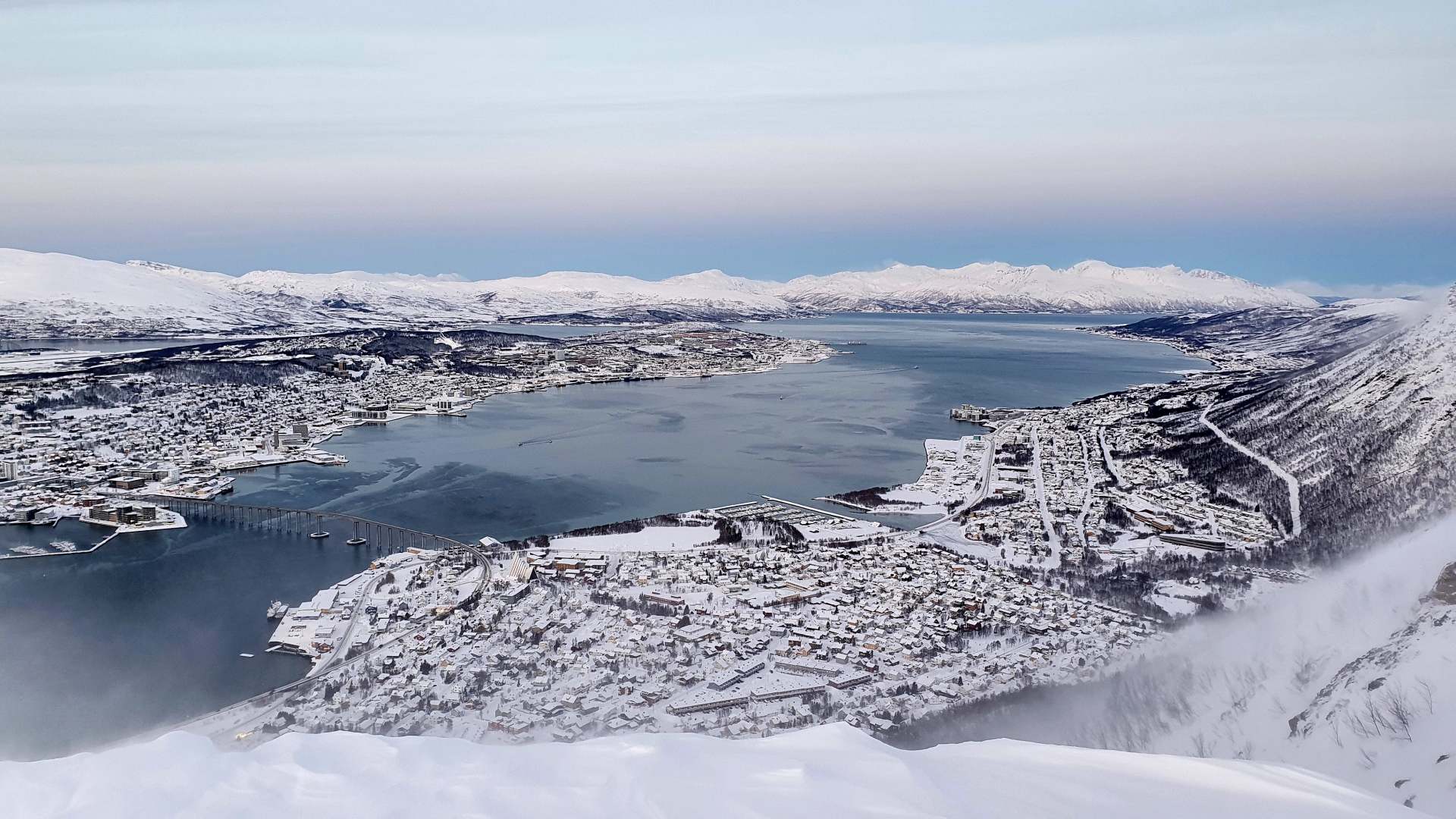 Nach einer kleinen Runde über ein Schneefeld und dem Blick über Tromsø inmitten der Fjordlandschaft treten wir den Heimweg an. Den Wind scheinen wir dabei mitzunehmen, die Schneeverwehungen türmen sich wieder und in der Ferne wirbeln kleine Schnee-Tornados über die Berge.