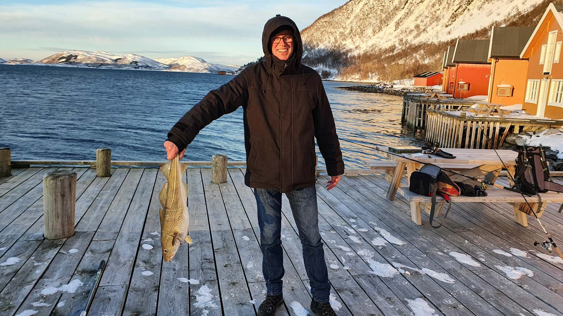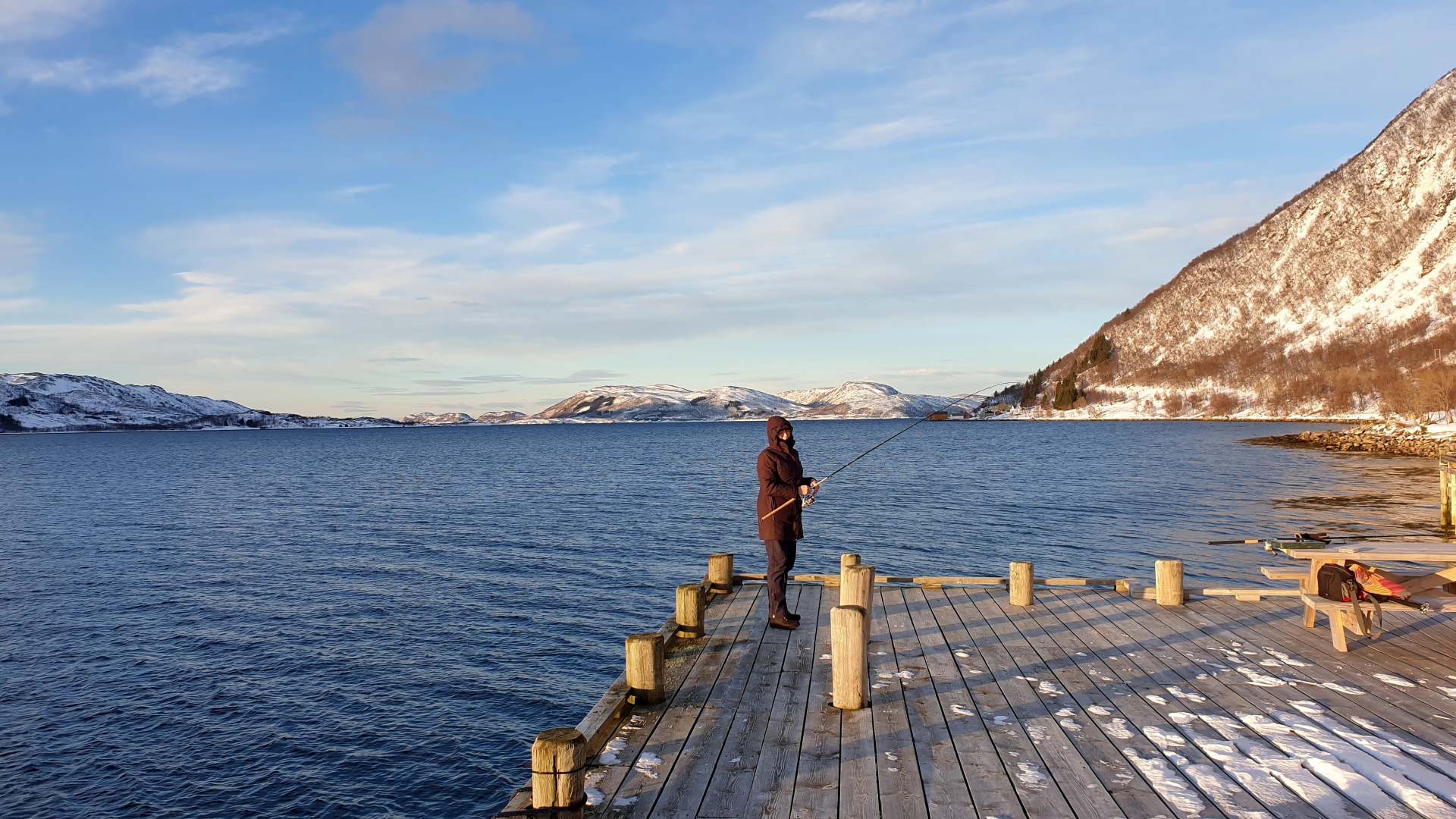 Unser Versuch, das Museum und Aquarium Polaria in Tromsø zu besuchen, scheitert. Der Streckenabschnitt, der durch die Berge führt, ist bis mindestens 12.00 Uhr gesperrt. Wir drehen um, ziehen uns wärmere Sachen an und laufen mit unserem Angelgeschirr zum Steg von Lauklines. Der Eigentümer der Ferienanlage hatte uns vor einigen Tagen erlaubt, von dort aus zu angeln.