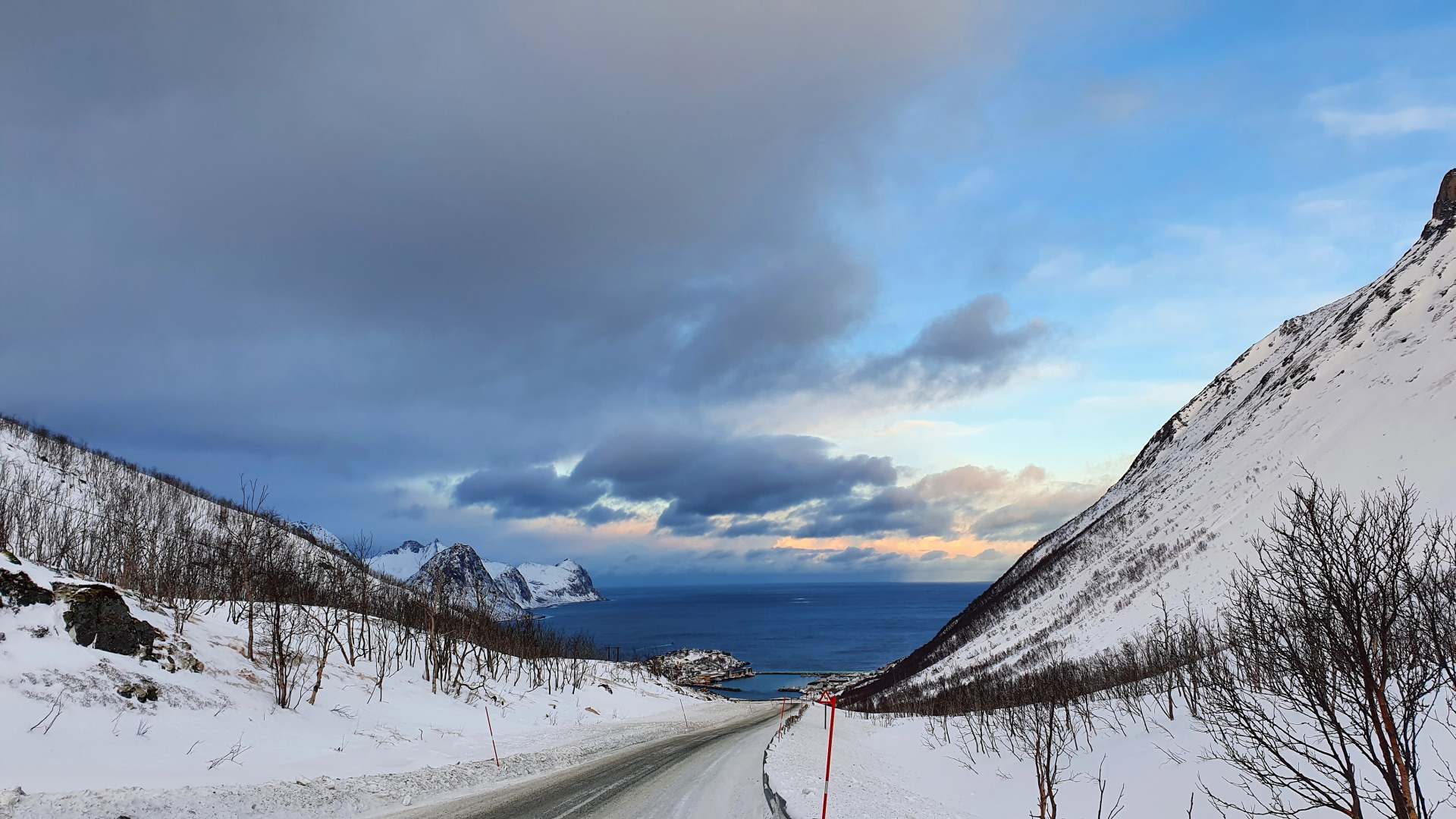 Anschließend machen wir uns auf nach Sommerøy, einer kleinen Insel, die durch eine Brücke mit unserer großen Insel Kvaløya verbunden ist. 34 Kilometer und 37 Minuten Fahrtzeit, wir müssen auf die gegenüberliegende Fjordseite. Für das Wetter sind das ungefähr 30 Kilometer zuviel. Es wird dunkler und als wir ankommen, beginnt es zu schneien. Der Wanderweg, den wir suchen, bleibt im Schnee verborgen. Uns bleibt bei dem ungemütlichen Wetter nur die Rückfahrt in unsere gemütliche Hütte.