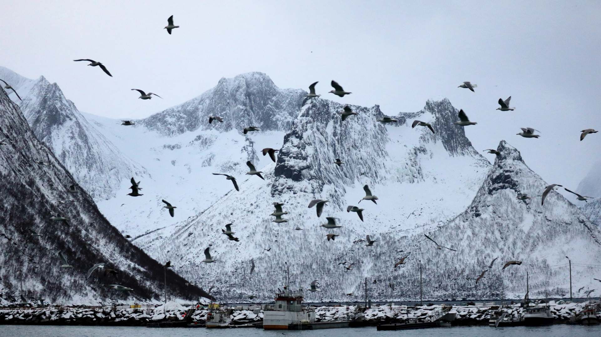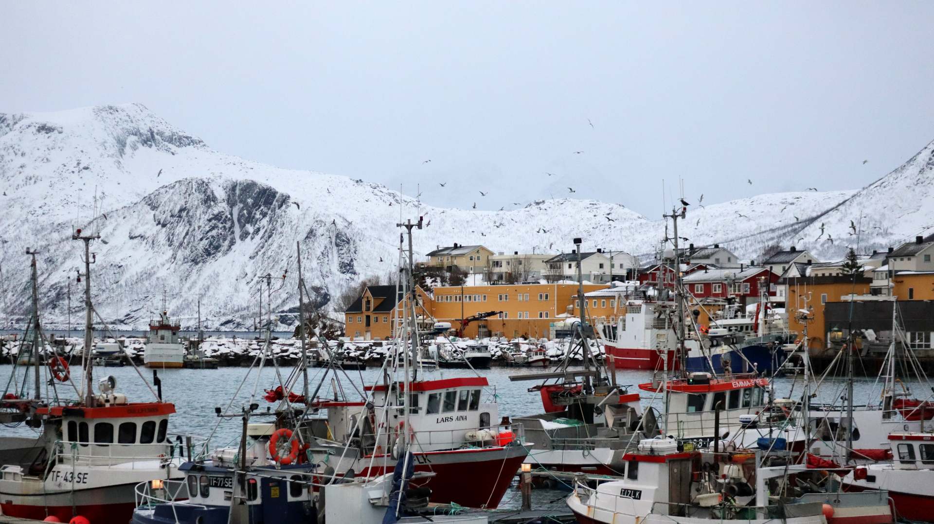 Doch die Wolkendecke verdichtet sich schnell und ruckzuck umgibt uns ein Grau, das nur durch die bunten Häuser und Schiffe unterbrochen wird. Zwei Fangschiffe sind vor kurzem entladen worden. Eine Fischgeruchwolke liegt über dem Ort, Fischabfälle schwimmen im Wasser und eine Unmenge Vögel kreisen über das für sie verlockende Hafenbecken. Meist natürlich Möwen, doch wir entdecken auch eine Handvoll Adler.