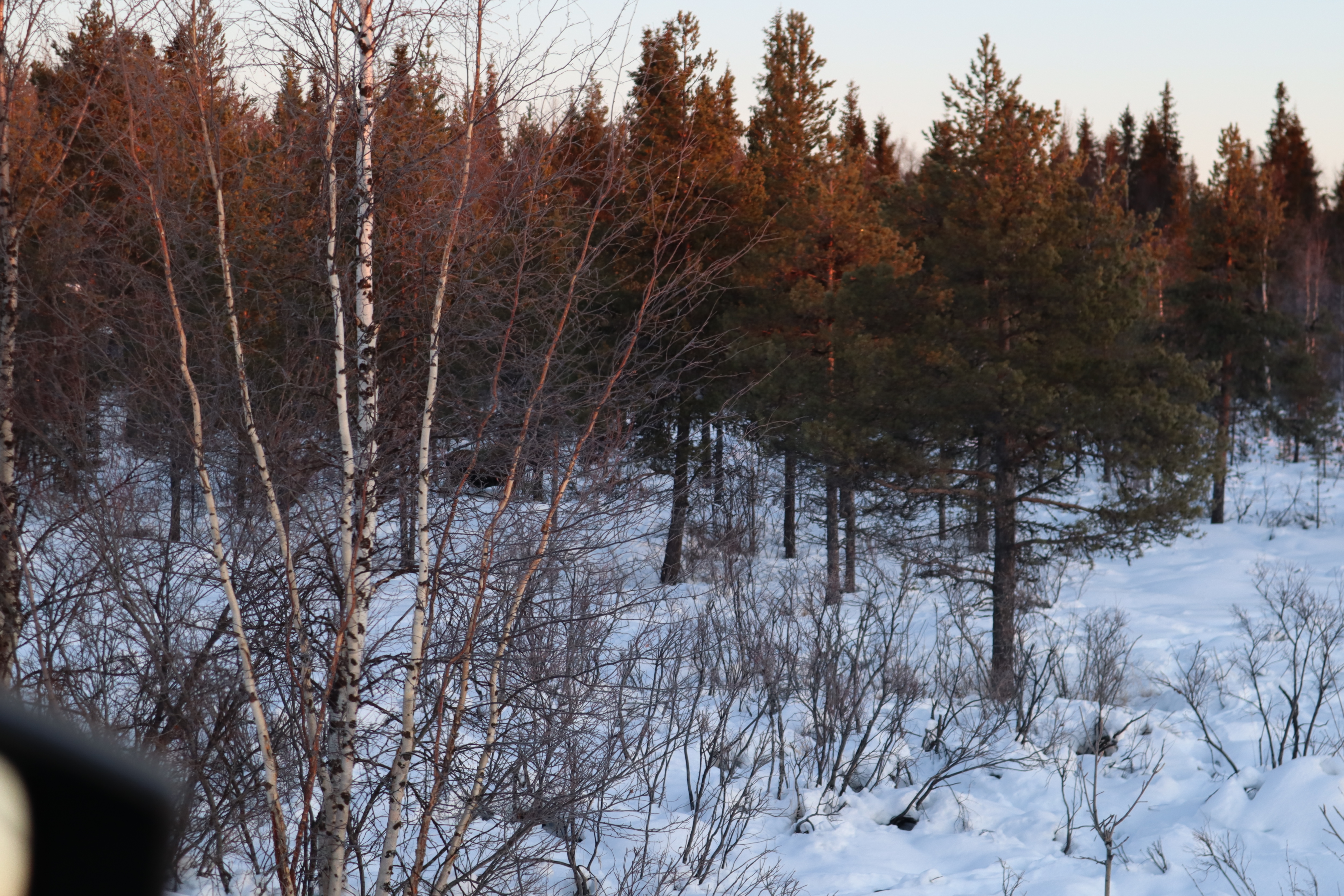 Um 10.00 Uhr dann eine Überraschung: Fritz entdeckt in der Ferne einen Elch, der über einen zugefrorenen See spaziert. Welch ein Glück! Murphys Gesetz: Meine Kamera habe ich nicht bereit und in meiner Aufregung tippe ich beim Smartphone dreimal auf den Umkehrmodus und focussiere statt Elch mich selbst. Ein einziges Foto gelingt.