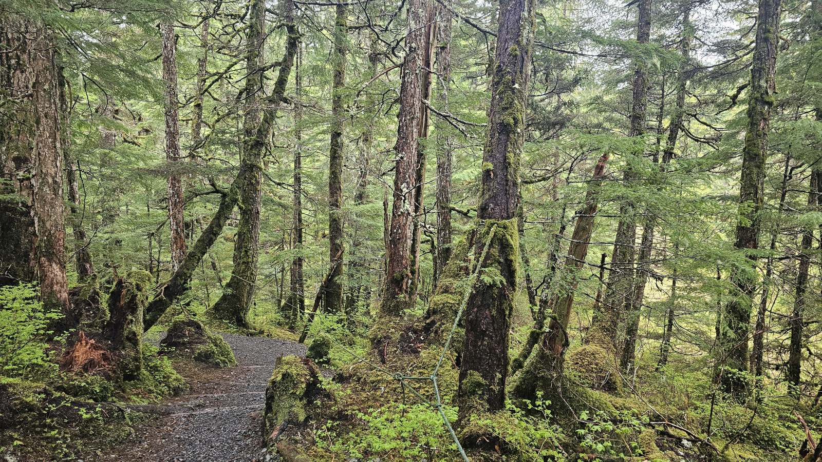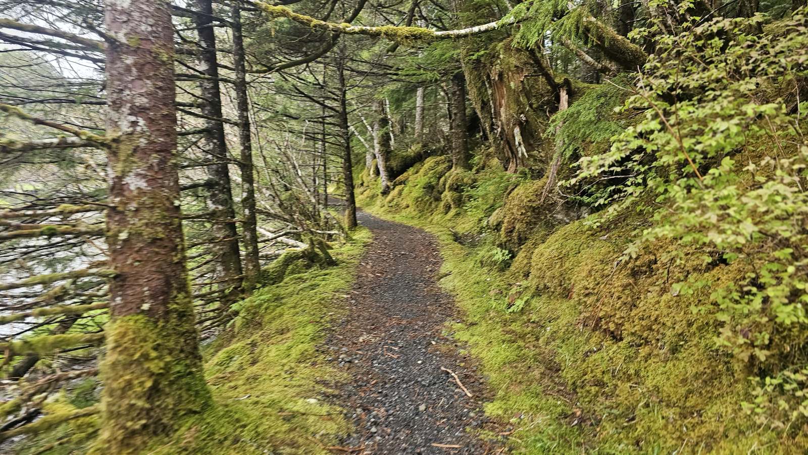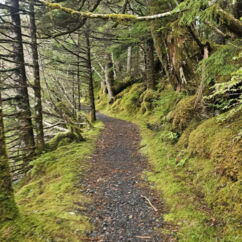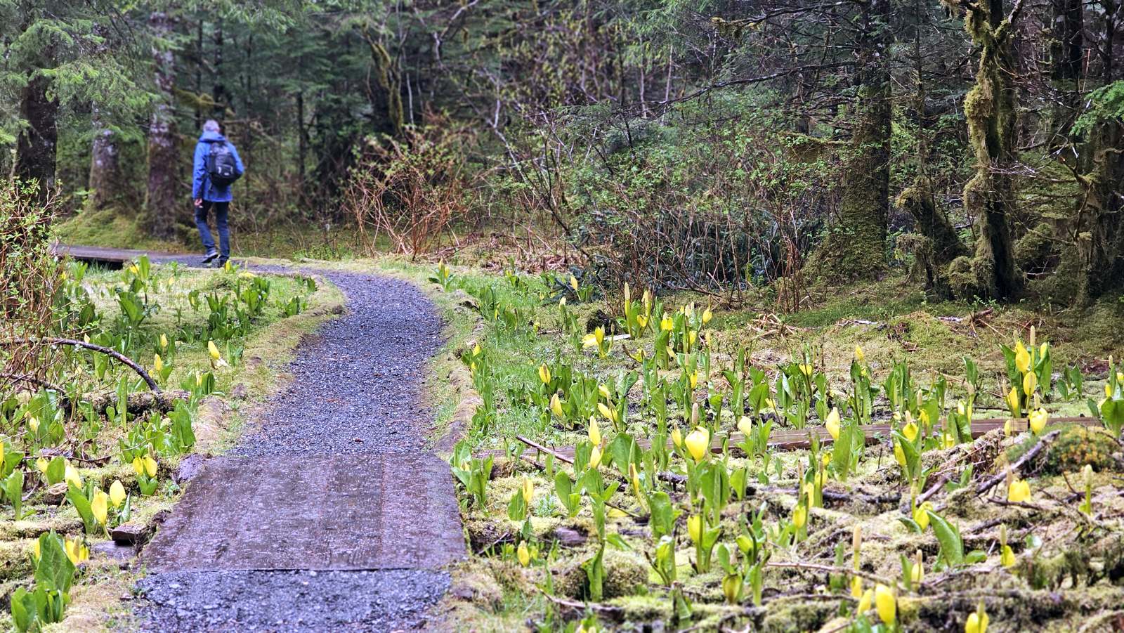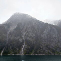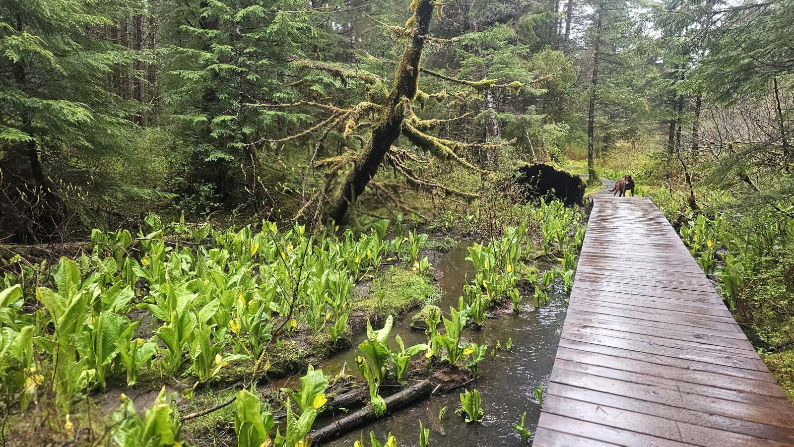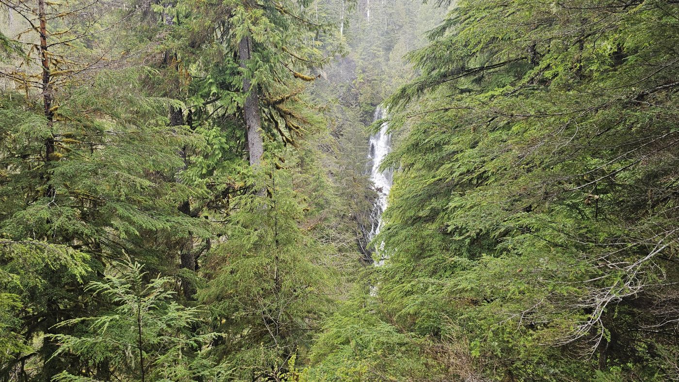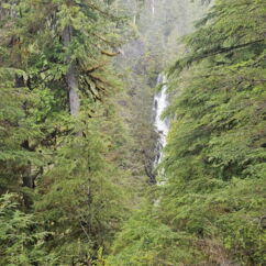 Mit Transferbooten werden wir heute im Hafen von Wrangell abgesetzt. Wir haben eine dreistündige Wanderung zu einem Wasserfall auf dem Wanderweg Rainbow gebucht. Über Holzstufen überwindet unsere Gruppe die 120 Meter Höhenunterschied, vorbei an Blaubeeren, Himbeeren, Wald-Erdbeeren, Farnen, Flechten und kleinen Pilzen. Ausschließlich sechs Baumarten sind hier zu finden.