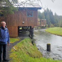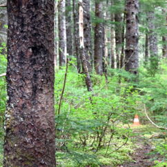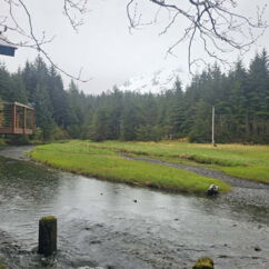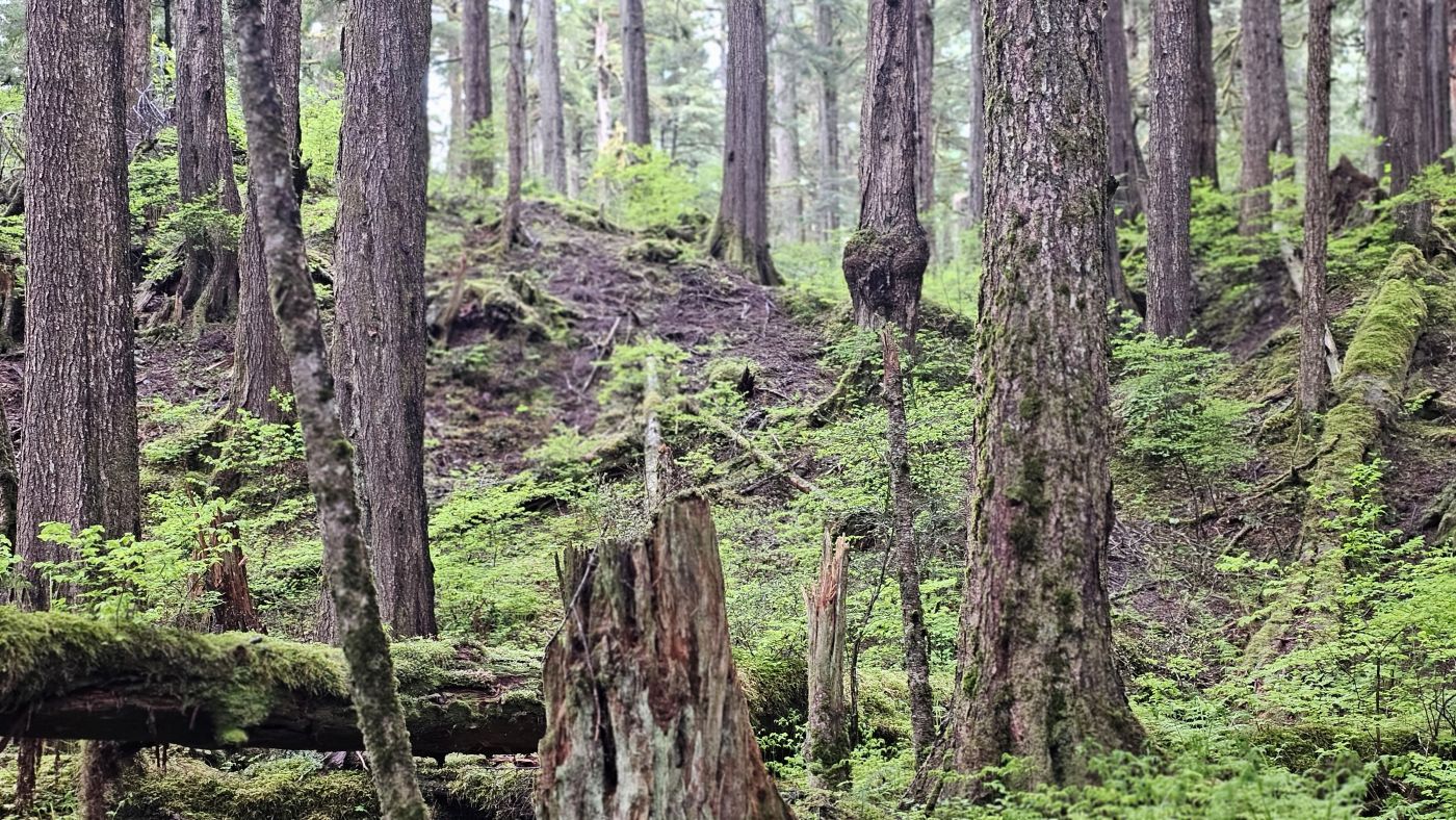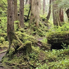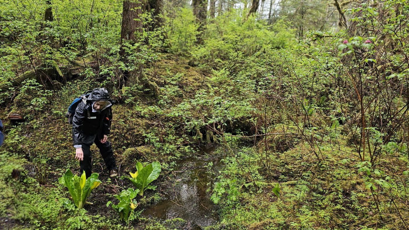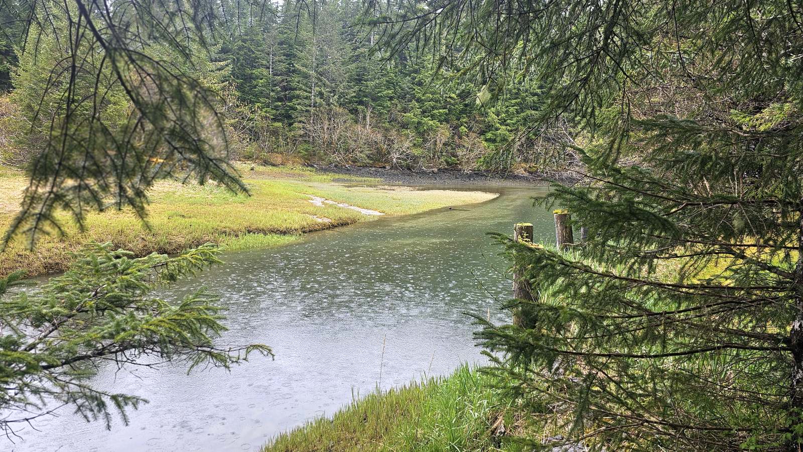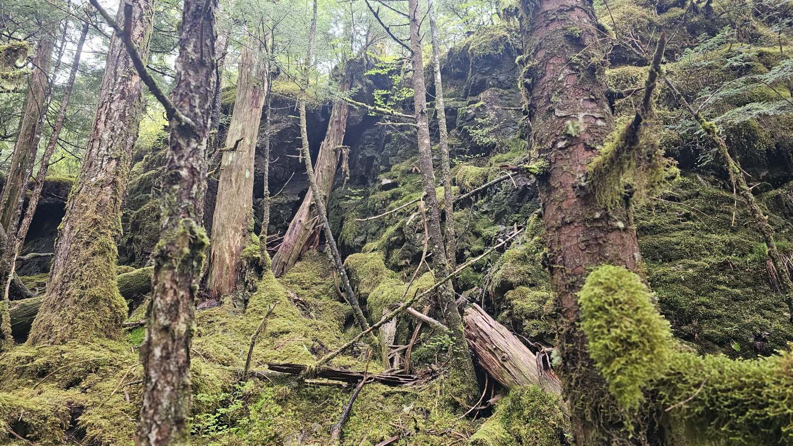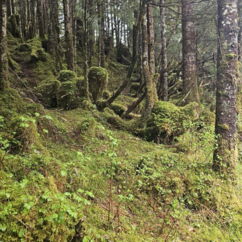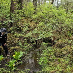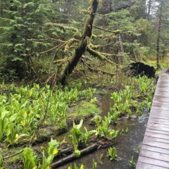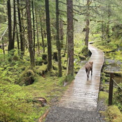 Mit Transferbooten werden wir heute im Hafen von Wrangell abgesetzt. Wir haben eine dreistündige Wanderung zu einem Wasserfall auf dem Wanderweg Rainbow gebucht. Über Holzstufen überwindet unsere Gruppe die 120 Meter Höhenunterschied, vorbei an Blaubeeren, Himbeeren, Wald-Erdbeeren, Farnen, Flechten und kleinen Pilzen. Ausschließlich sechs Baumarten sind hier zu finden.