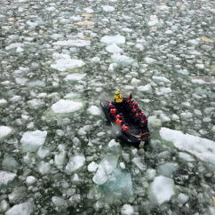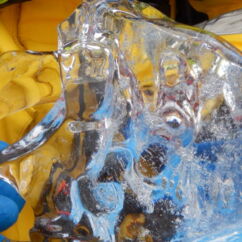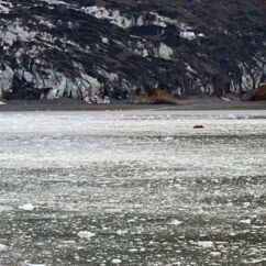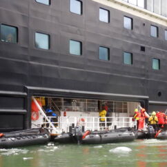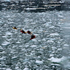 Auf der Schiffseite des Anlegers, bzw. des Ausstiegs hat sich das Eis rasch zu einer großen Fläche zusammengeschoben. Die Zodiaks kommen anfangs kaum zum offenen Wasser durch und am schlimmsten sind die vier Kajaks dran. Sie liegen teilweise auf dem Eis auf und sind oft knapp vor dem Kentern. Erst nachdem die Roald Amundsen sich etwas dreht, löst sich die Eisformation und damit auch das Problem.