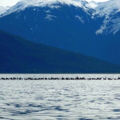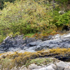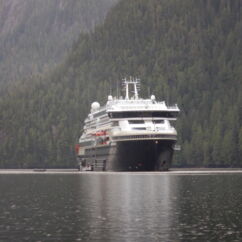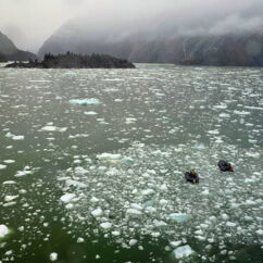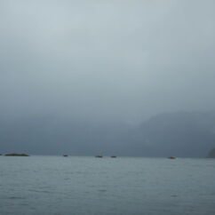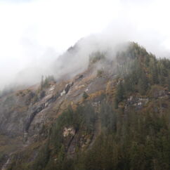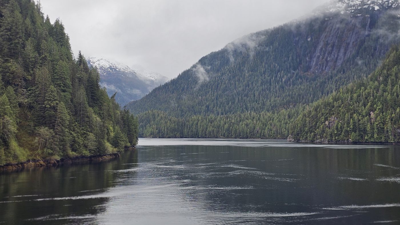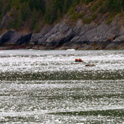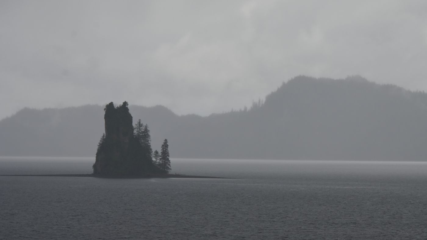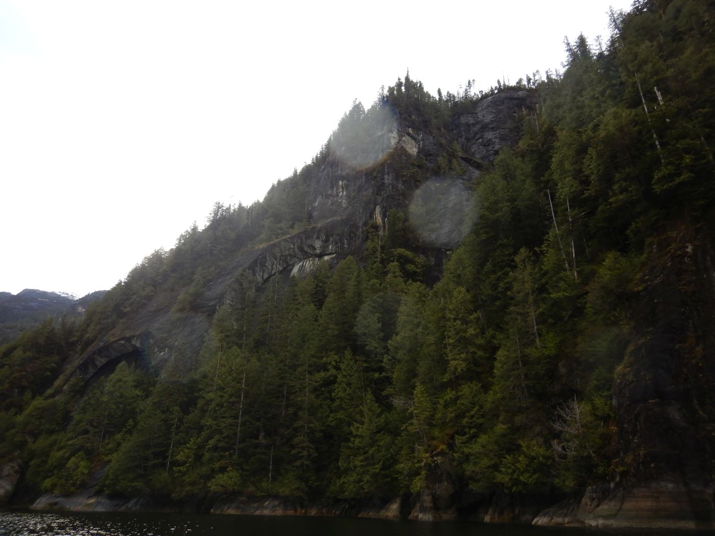 Der erste Ausflug in den Zodiaks führt in den Misty-Fjord. Das Wetter wechselt hier schnell von sonnig zu neblig oder Regen. Als unsere Gruppe unterwegs ist, bietet das Wetter keine Sonne. Die Felsformationen sind eindrucksvoll und auch die vier Baumarten, die sich ohne viel Erde auf den Felsen festkrallen. Tiere fehlen, wir treffen lediglich auf zwei kleine Enten.
