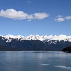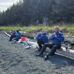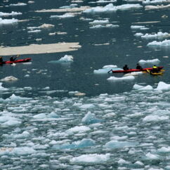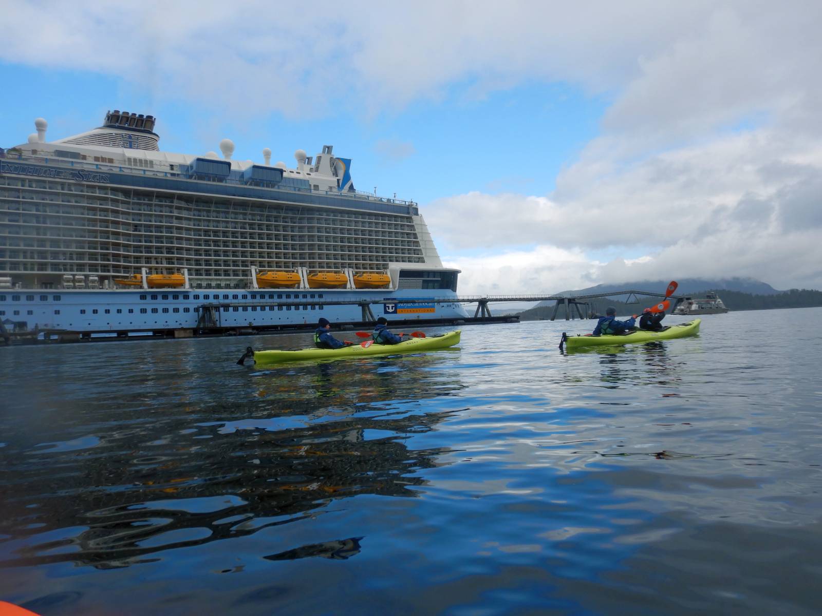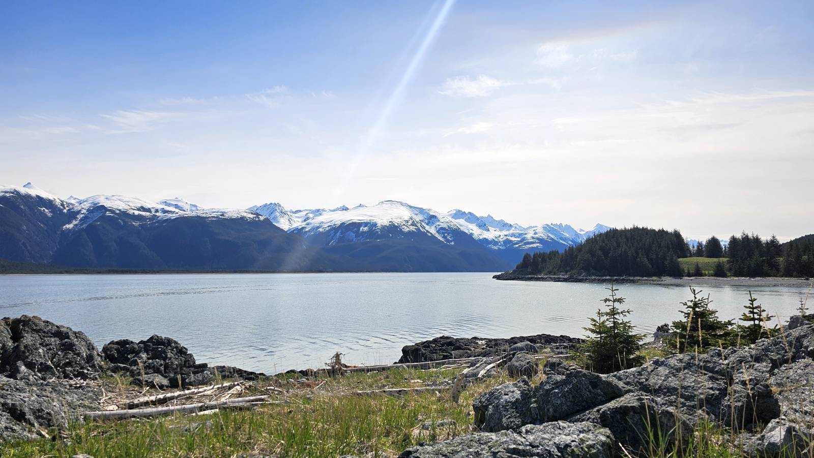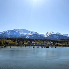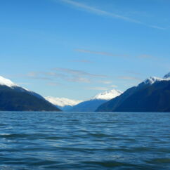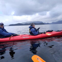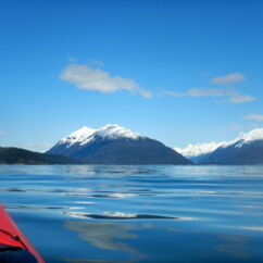 Bei stahlendem Sonnenschein starten wir unsere erste Kajaktour in Haines. Die zwei Guides betreuen nur unser und ein weiteres Doppelkajaks, so dass wir ziemlich relaxt den Fjord hinunterpaddeln. Wir treffen auf einen Seehund und sehen später noch einen Adler über den Ort kreisen.