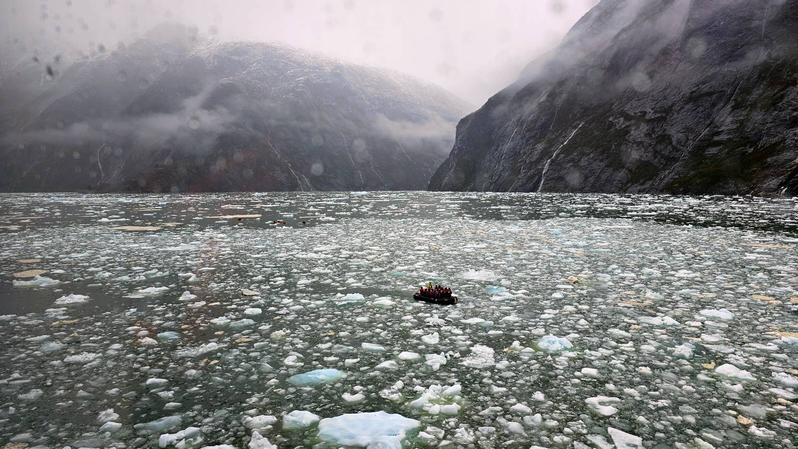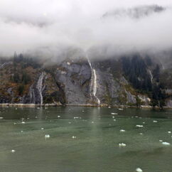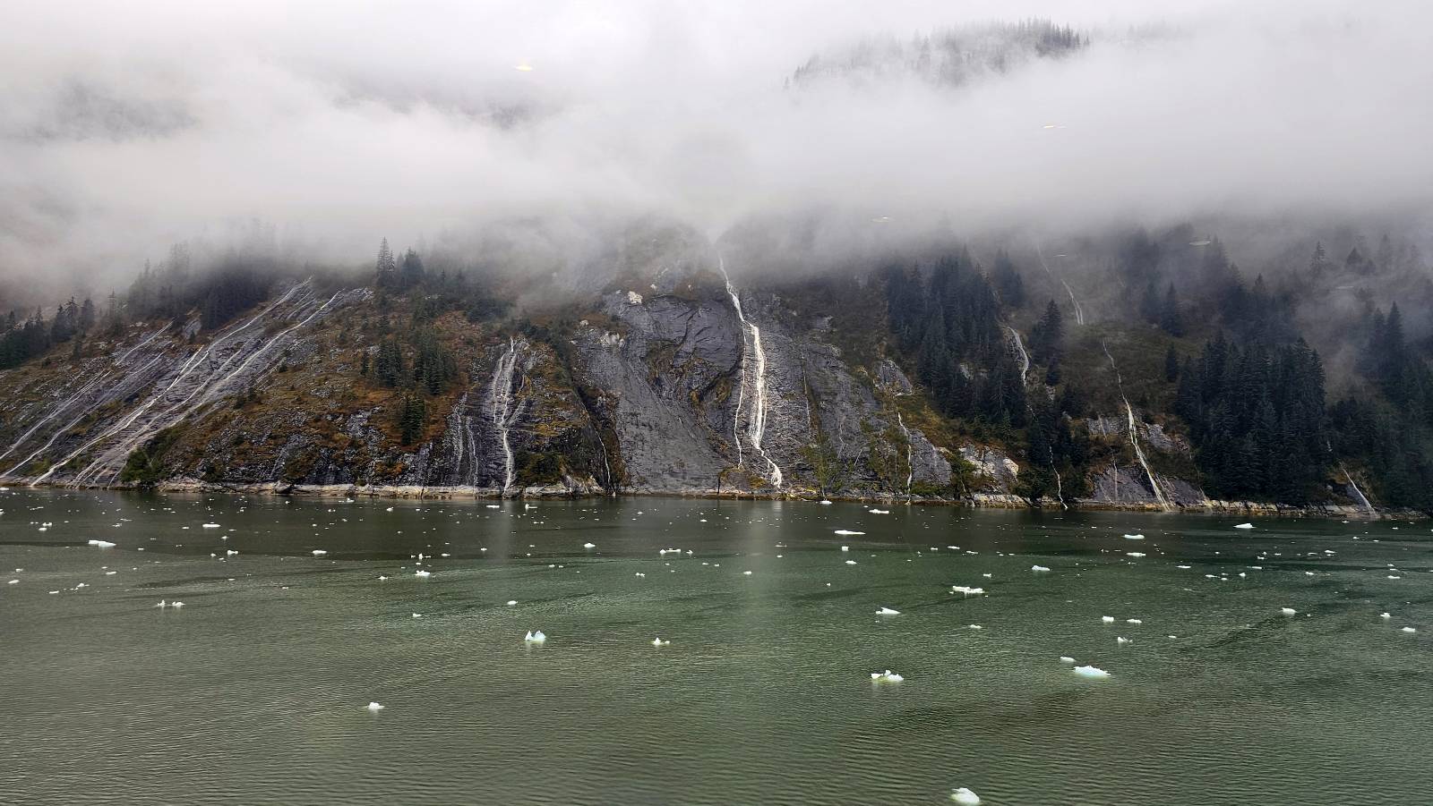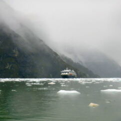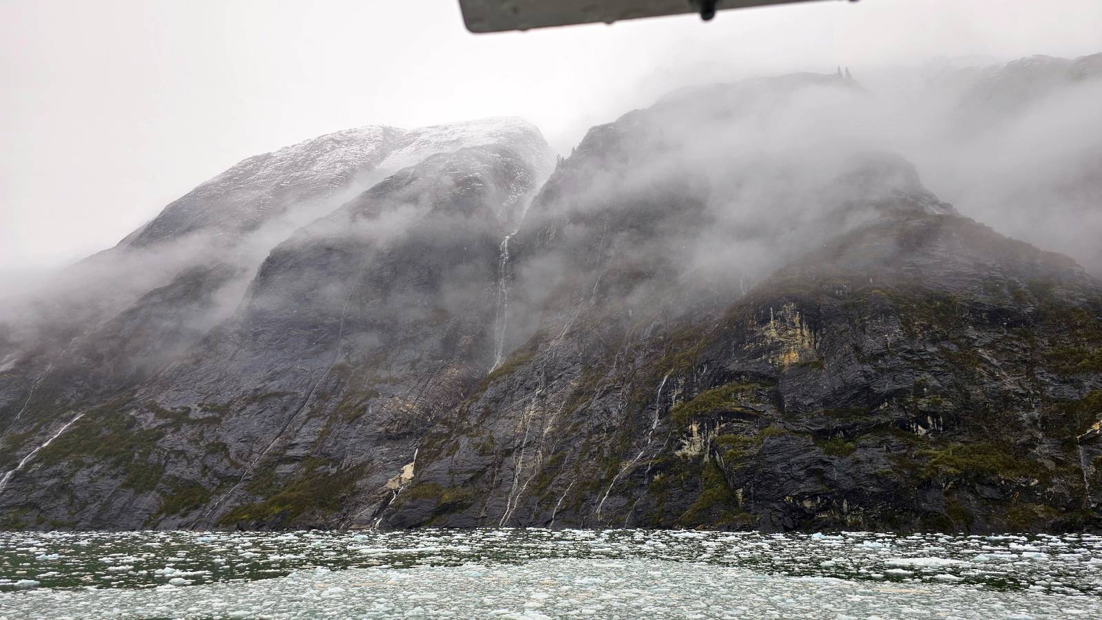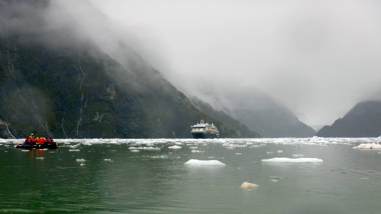 Auf dem Weg zum Gletscher Tracy Arms ist die Roald Amundsen langsam durch den Fjord geglitten, beiderseits ragen hohe Felsberge steil in die Höhe. Die Gipfel sind meist im Nebel versteckt, es regnet meistens und die Anzahl von Eisbrocken und -feldern nimmt stetig zu. Zuerst beim Frühstück und anschließend in der Explorer Lounge schauen wir dem Treiben des Eises zu. Das Grau hat etwas Magisches und wir können ihm durchaus etwas abgewinnen.