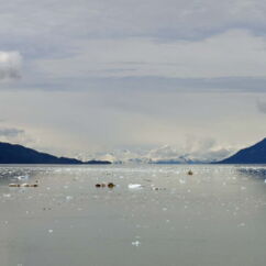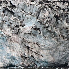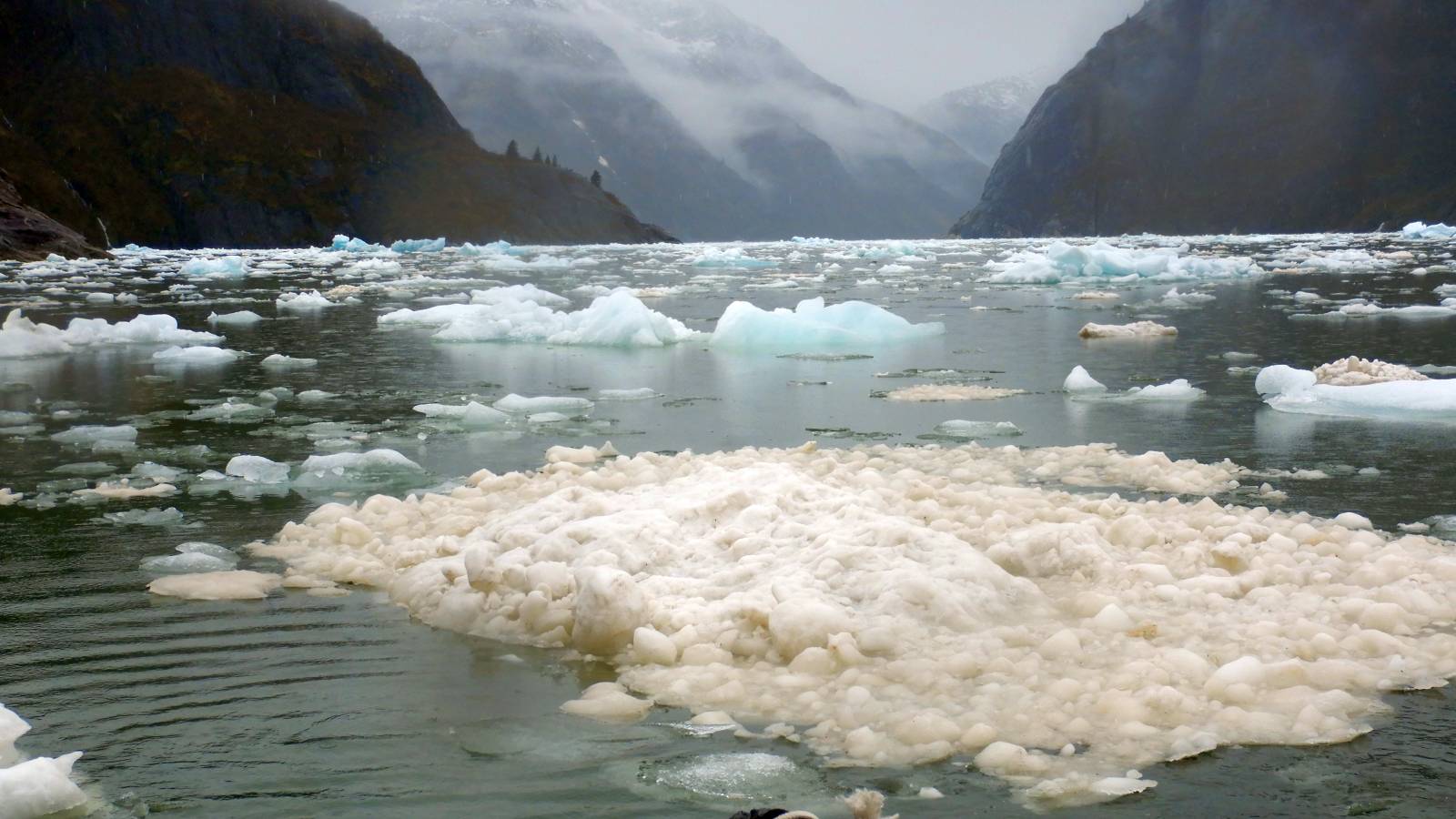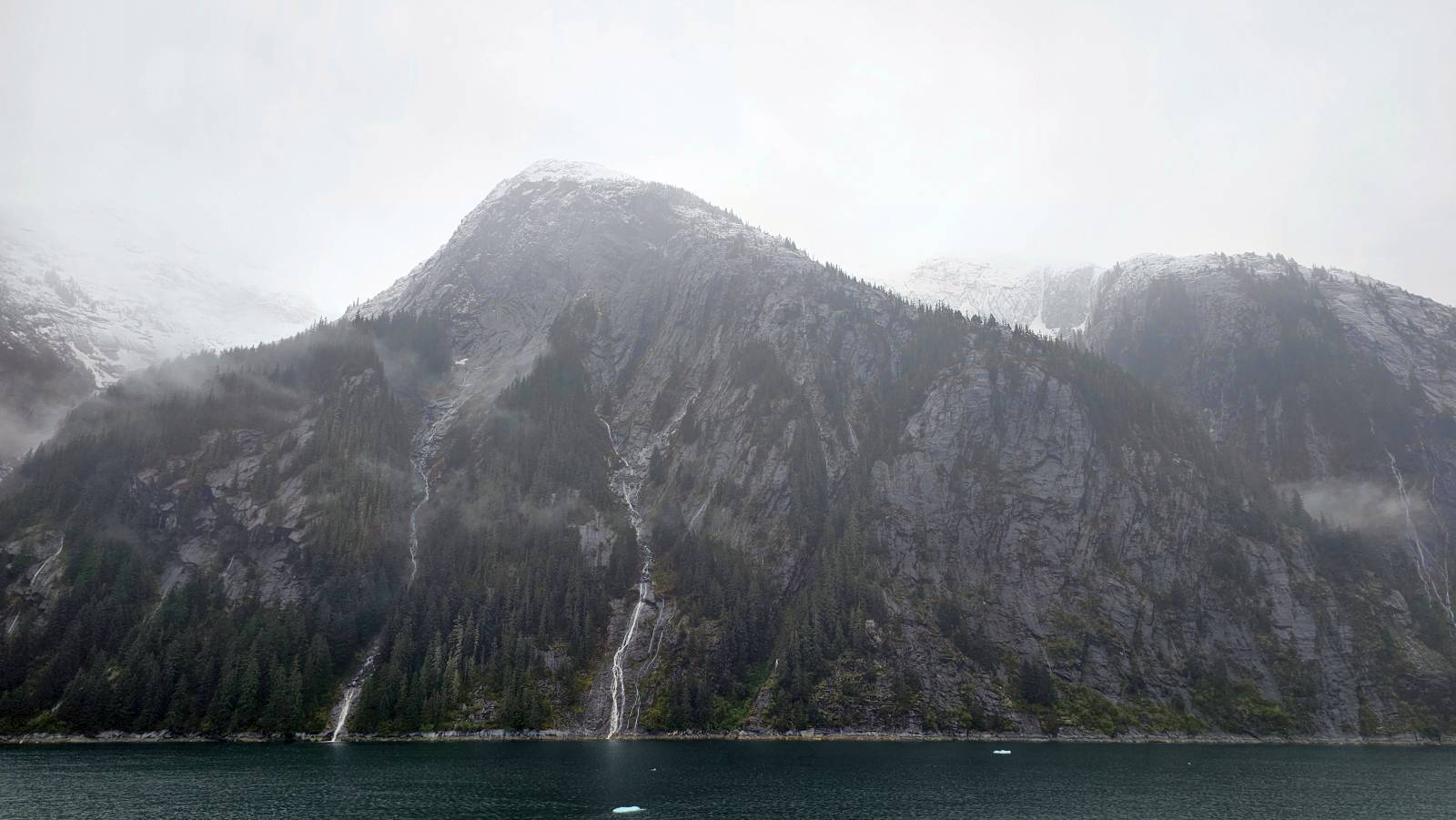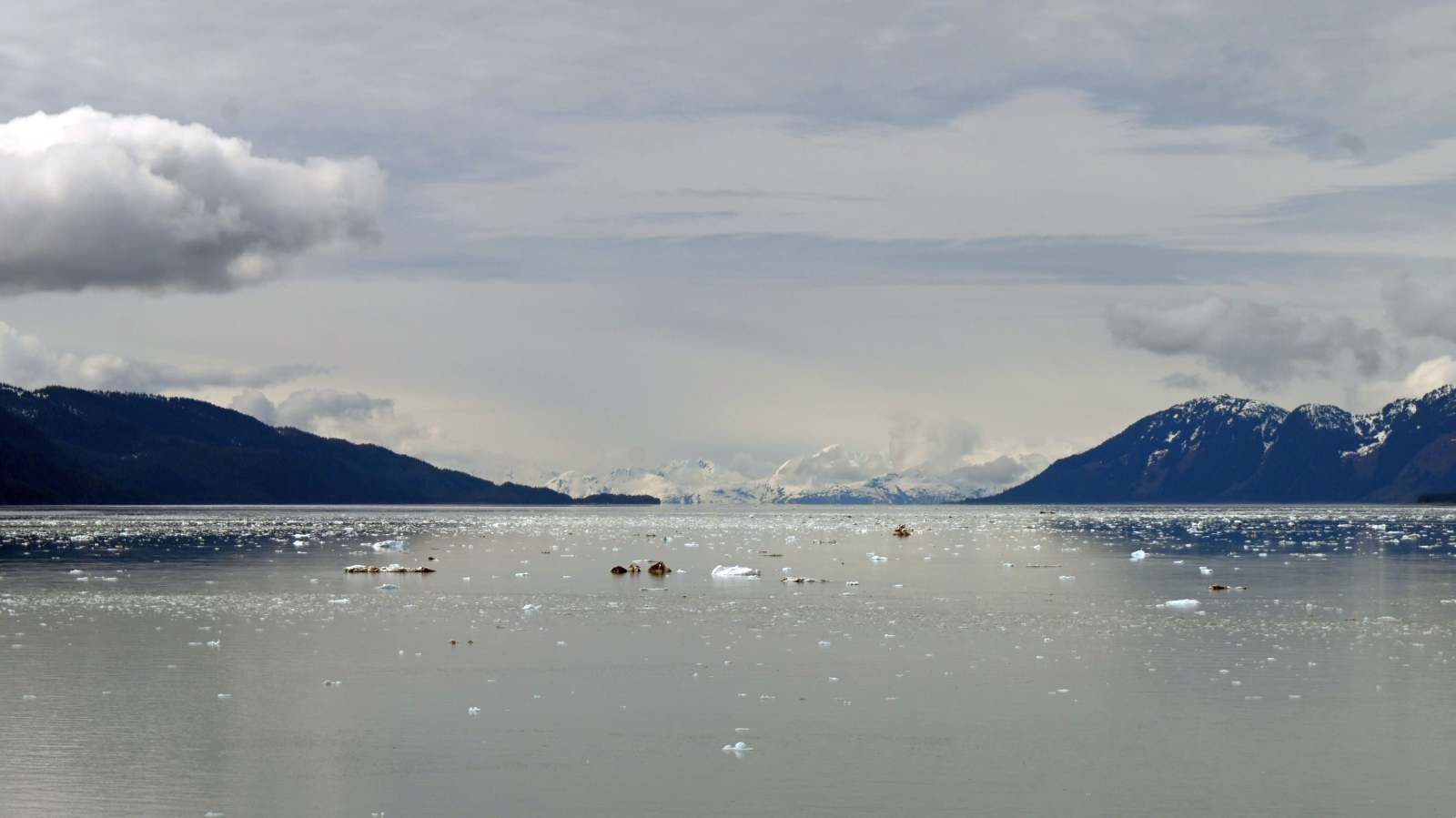Auf dem Weg zum Gletscher Tracy Arms ist die Roald Amundsen langsam durch den Fjord geglitten, beiderseits ragen hohe Felsberge steil in die Höhe. Die Gipfel sind meist im Nebel versteckt, es regnet meistens und die Anzahl von Eisbrocken und -feldern nimmt stetig zu. Zuerst beim Frühstück und anschließend in der Explorer Lounge schauen wir dem Treiben des Eises zu. Das Grau hat etwas Magisches und wir können ihm durchaus etwas abgewinnen.
