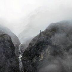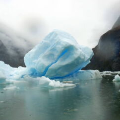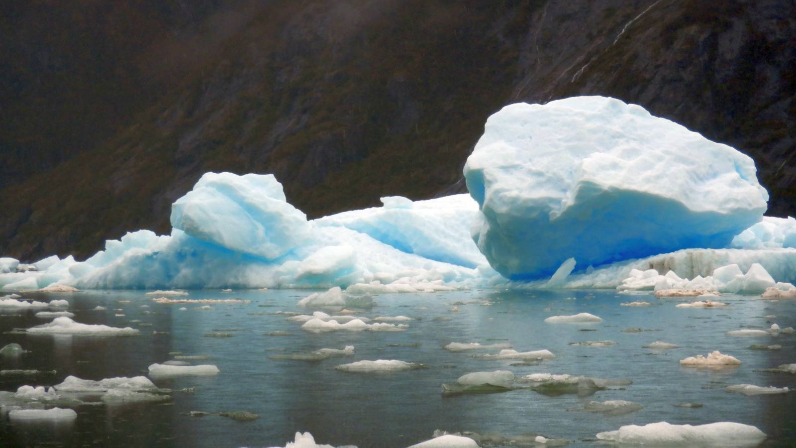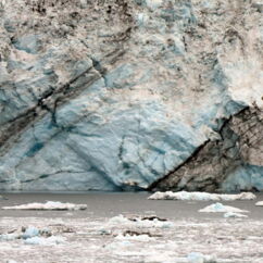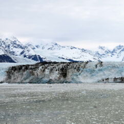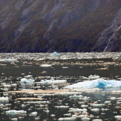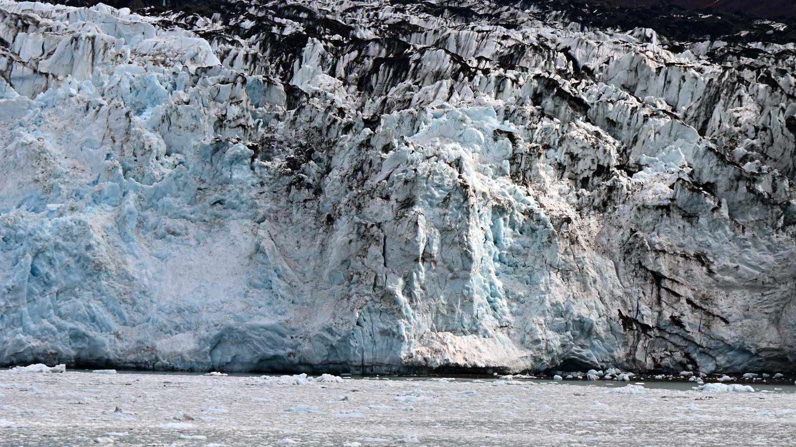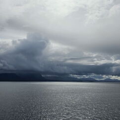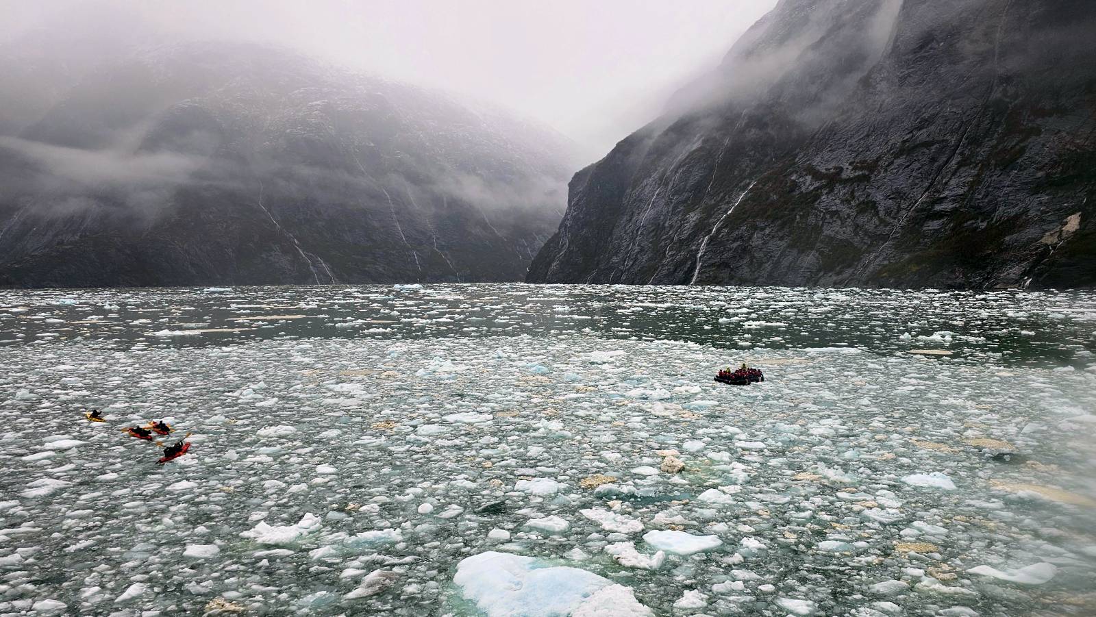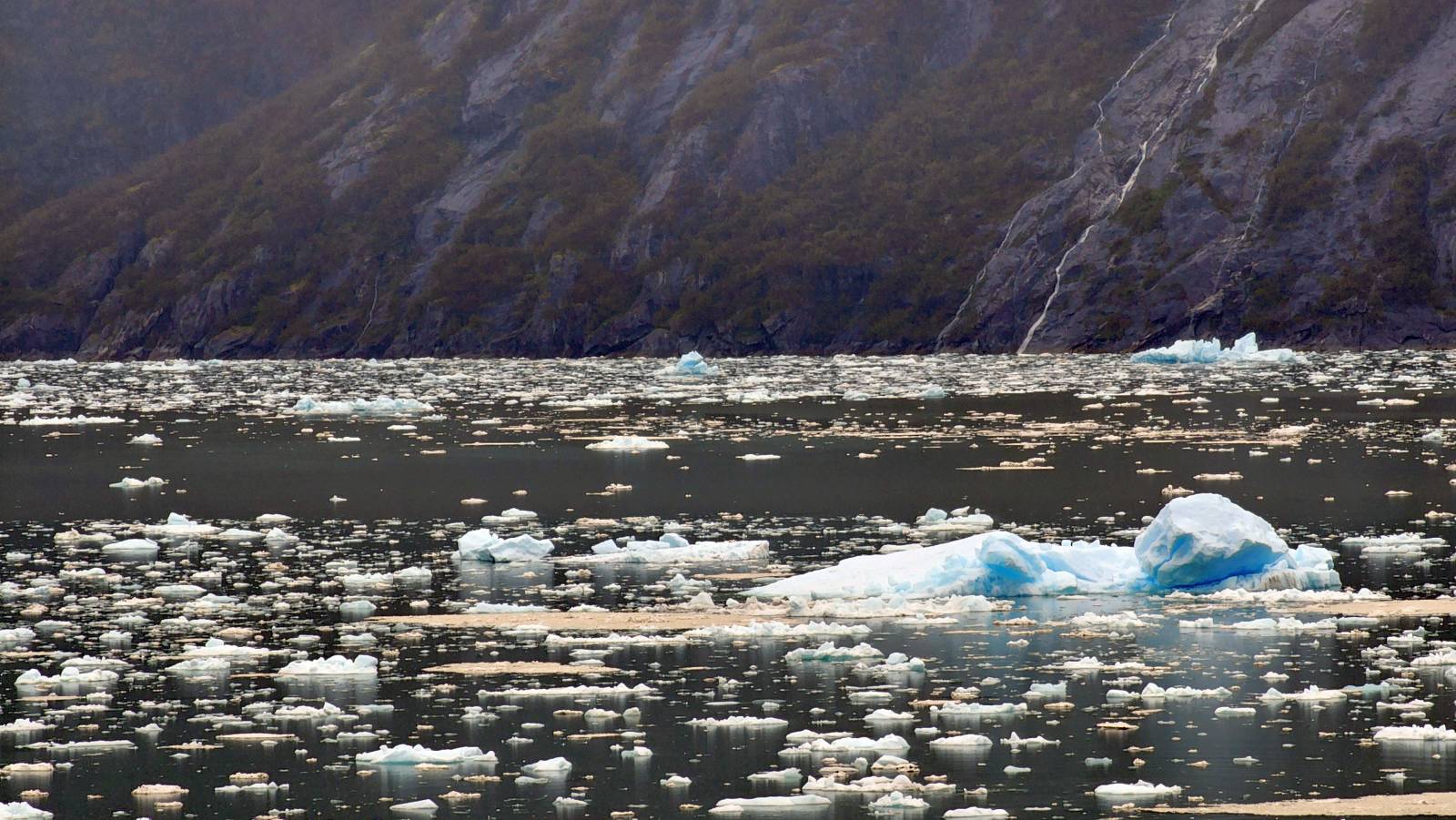 Auf dem Weg zum Gletscher Tracy Arms ist die Roald Amundsen langsam durch den Fjord geglitten, beiderseits ragen hohe Felsberge steil in die Höhe. Die Gipfel sind meist im Nebel versteckt, es regnet meistens und die Anzahl von Eisbrocken und -feldern nimmt stetig zu. Zuerst beim Frühstück und anschließend in der Explorer Lounge schauen wir dem Treiben des Eises zu. Das Grau hat etwas Magisches und wir können ihm durchaus etwas abgewinnen.