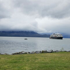 Heute entlässt die Roald Admundsen ihre 300 Passagiere mit den blauen Expeditionsjacken in den kleinen Ort Cordova mit 2500 Einwohnern. Der Hafen mit seinen Anlegern auf Stelzen sieht nett aus, gleich hinter den Anlegern ist ein großer Supermarkt mit der Aufschrift Regionale Produkte und direkt am Hafen steht eine auffällige, von Plaketten umrahmte Statue zum Andenken an die Menschen, die ihr Leben auf See verloren.
