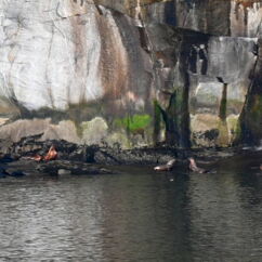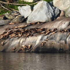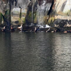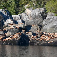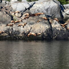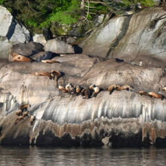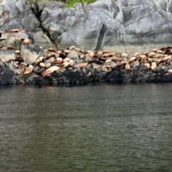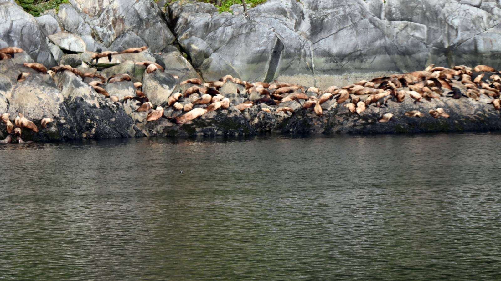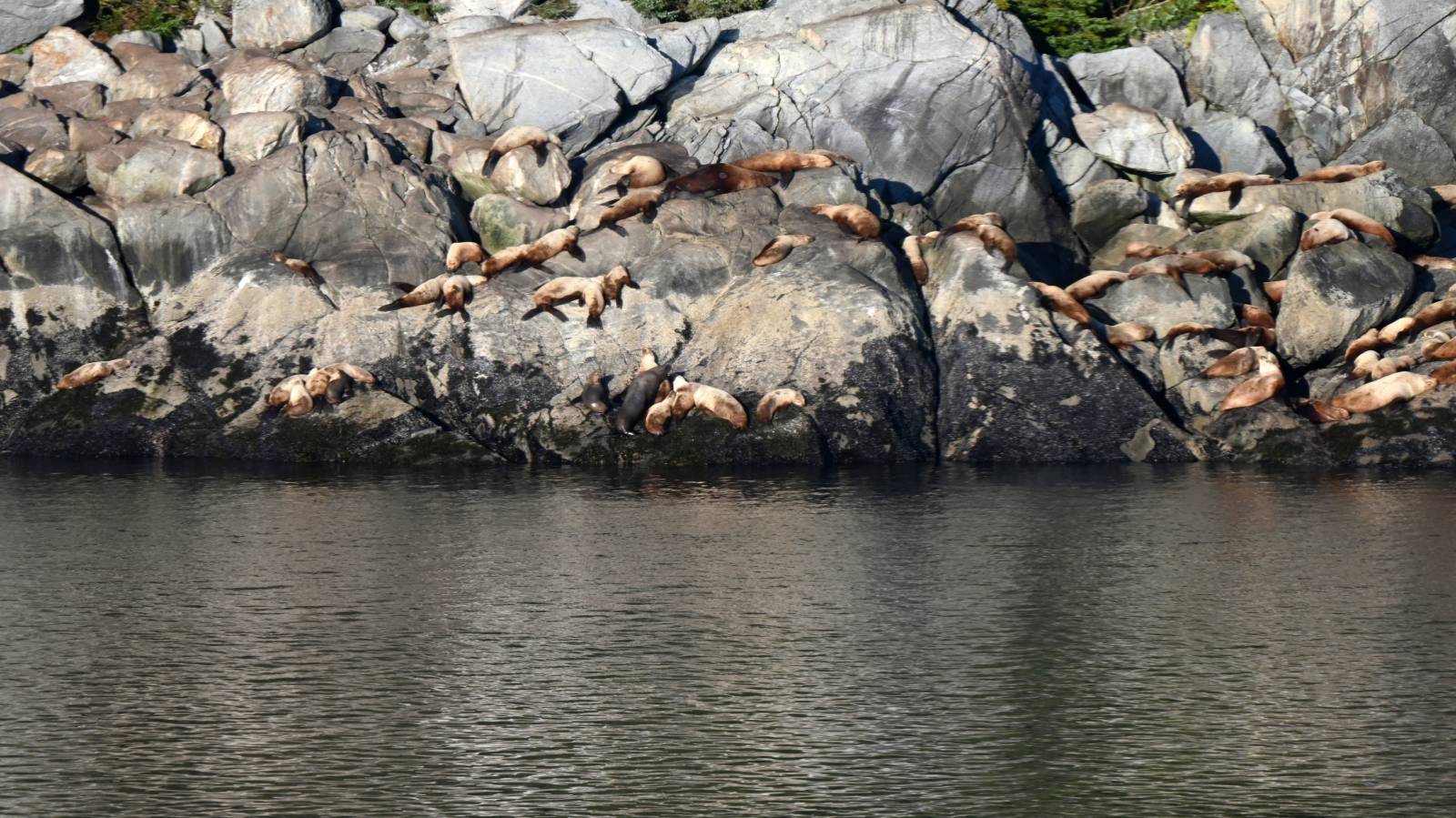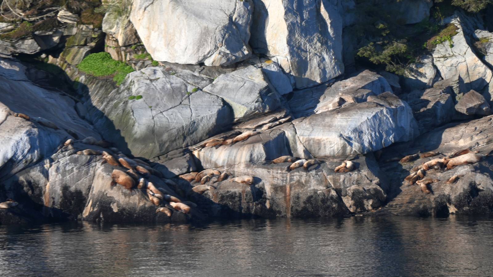 Auf unserer Weiterfahrt sitzen wir am Panoramafenster der Explorer Lounge auf Deck 10. Eine sehr schöne Landschaft zieht an uns vorbei und auch ein Highlight: eine Seelöwenkolonie.