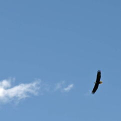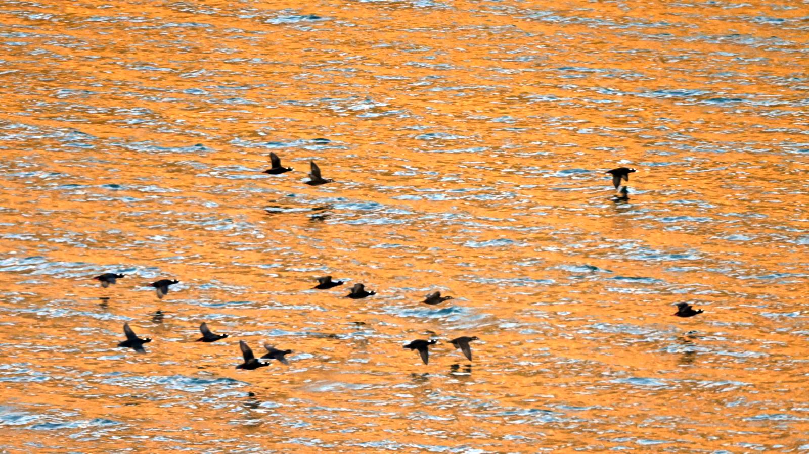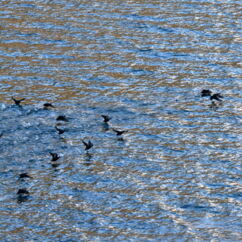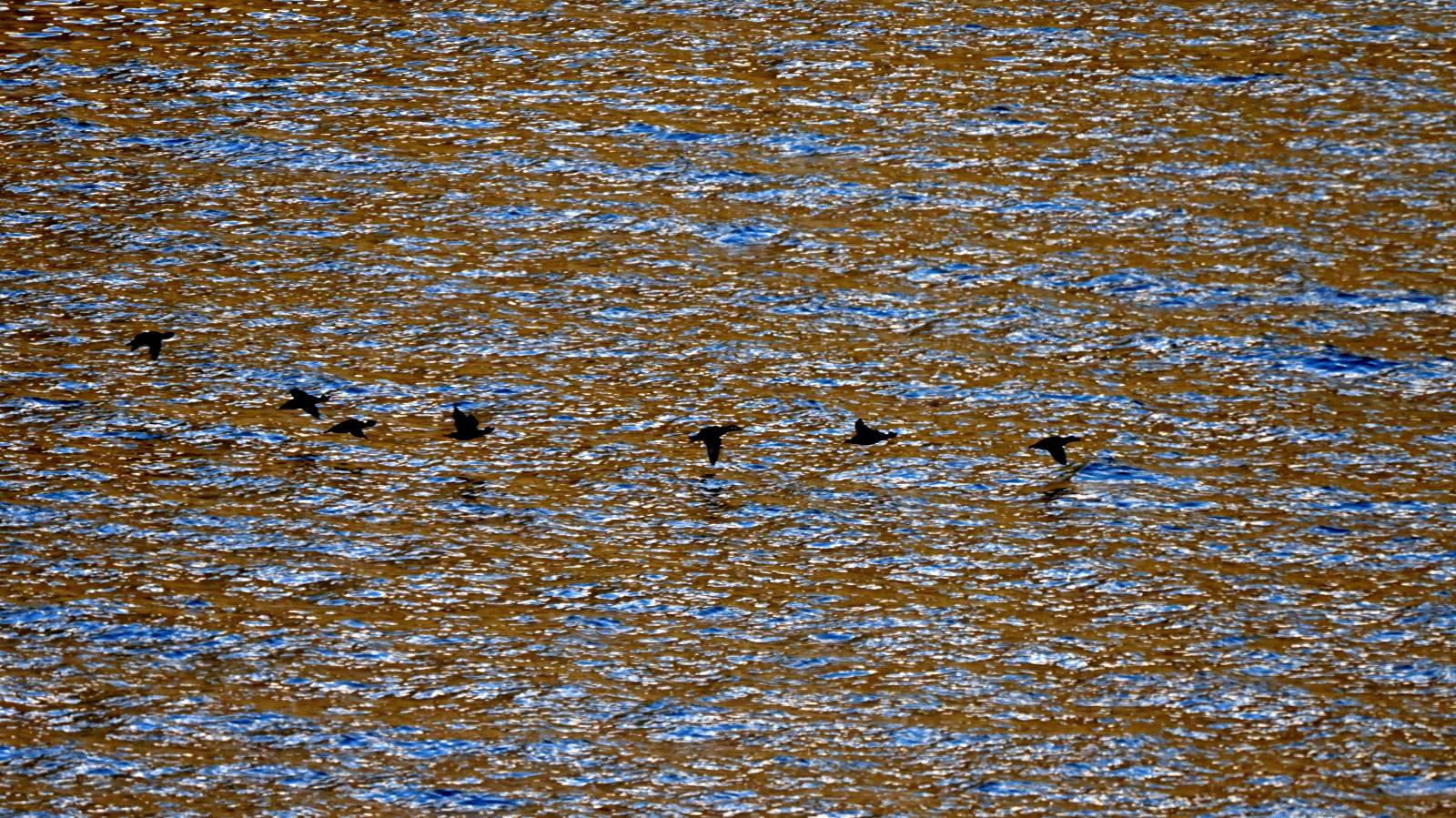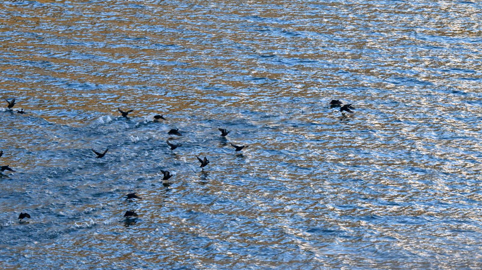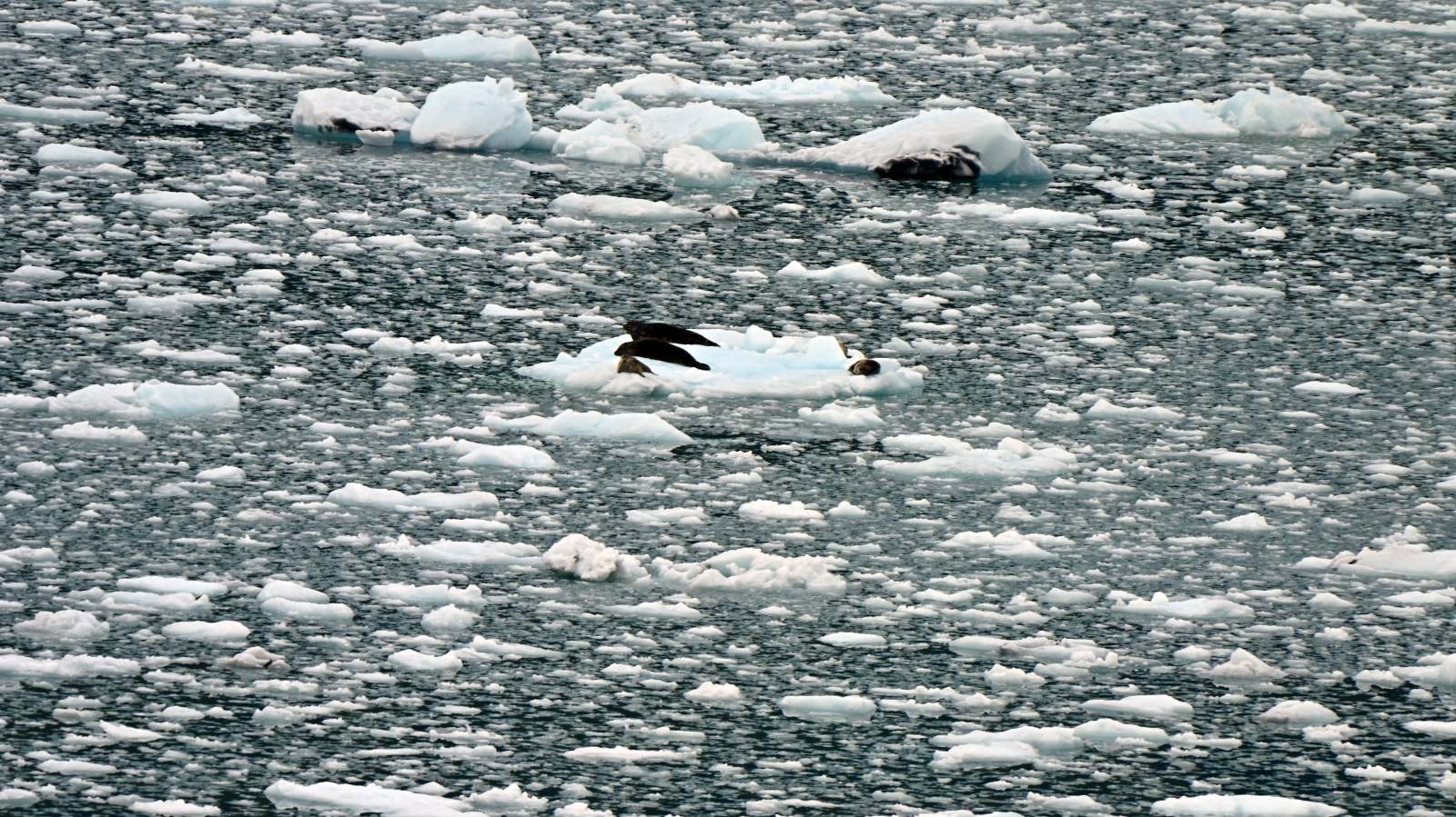 In der Ferne Blas von einem Wal, doch die Führer der Zodiaks denken gar nicht daran, die Richtung einzuschlagen. Stattdessen halten sie auf die geschützte Seite einer Insel zu. Wir sehen einen Robbenkopf, einen Seelöwenkopf und einen wegfliegenden Adler. Alle scheinen begeistert.