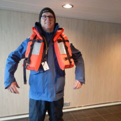 Zuallererst erhalten wir eine wasser- und winddichte Helly Hansen Expeditionsjacke und eine aus Recylingplastik hergestellte Trinkflasche, die man an verschiedenen Stationen jederzeit nach Bedarf auffüllen kann. Konzept von HX-Expeditions ist soviel Nachhaltigkeit wie möglich. Die Roald Amundsen ist ein Hybridschiff, was wohl der Grund ist, weshalb es in die Fjorde hineinfahren darf. Es gibt keine Einwegprodukte an Bord, Zimmerservice fordert man nach Bedarf an und der Müll wird getrennt. An Bord sind Wissenschaftler, die täglich Vorträge über Flora an Fauna halten und während der Tour an wissenschaftlichen Studien arbeiten. Die Passagiere können diese Arbeiten manchmal direkt mitverfolgen. Gelegentlich durch Probensichtungen an Mikroskopen oder auch mal durch Begleitung auf dem Forschungsboot.