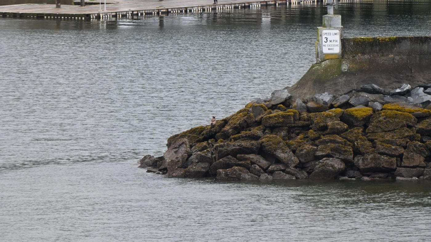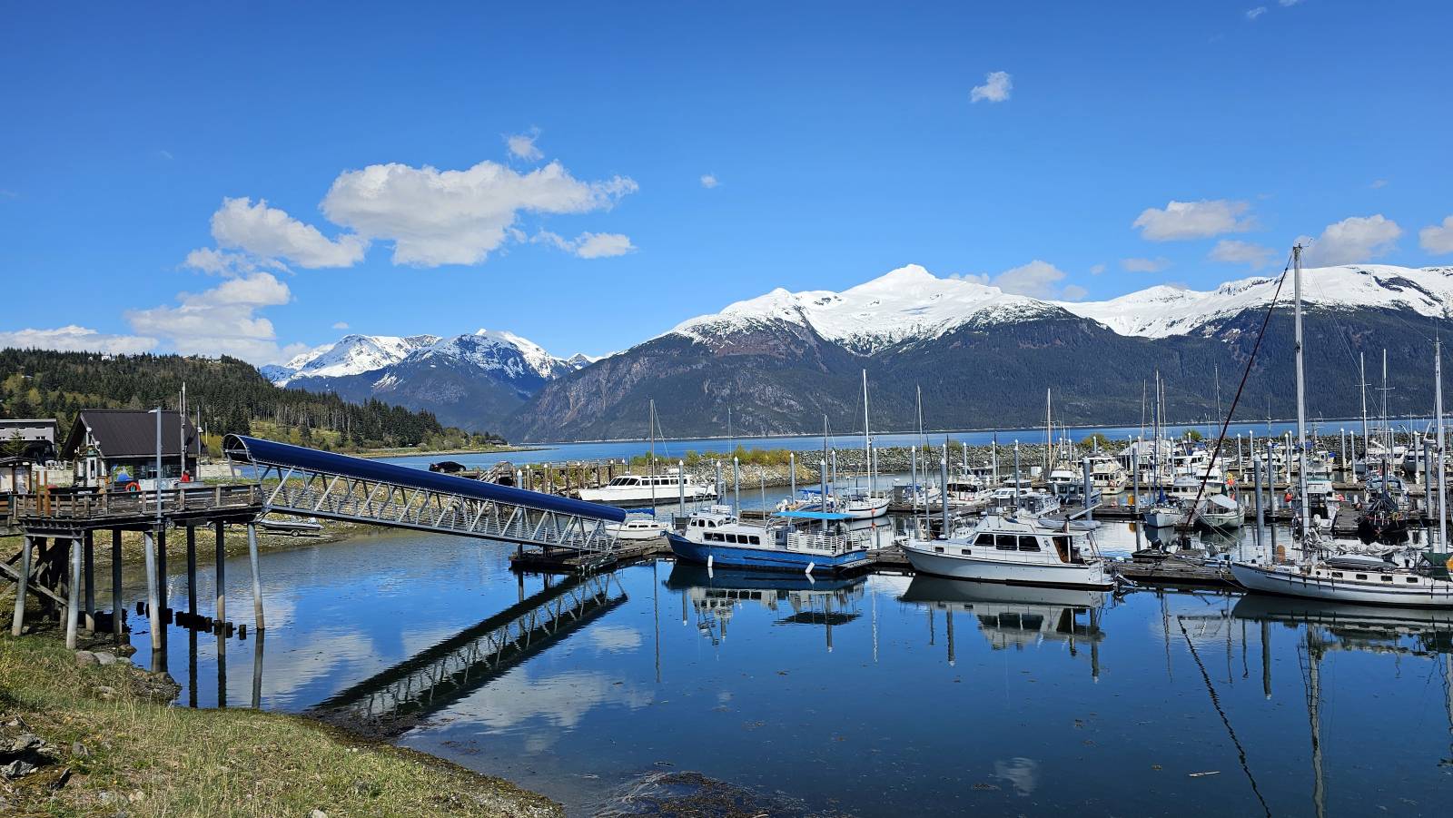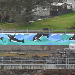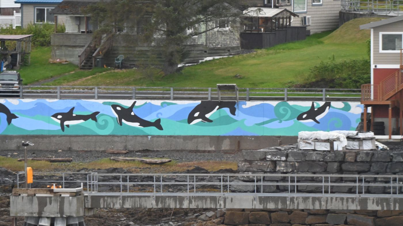 Orcas sehen wir bei der Ausfahrt aus dem Hafen von Wrangell: Eine Kaimauer ist ganzflächig mit ihnen bemalt.
