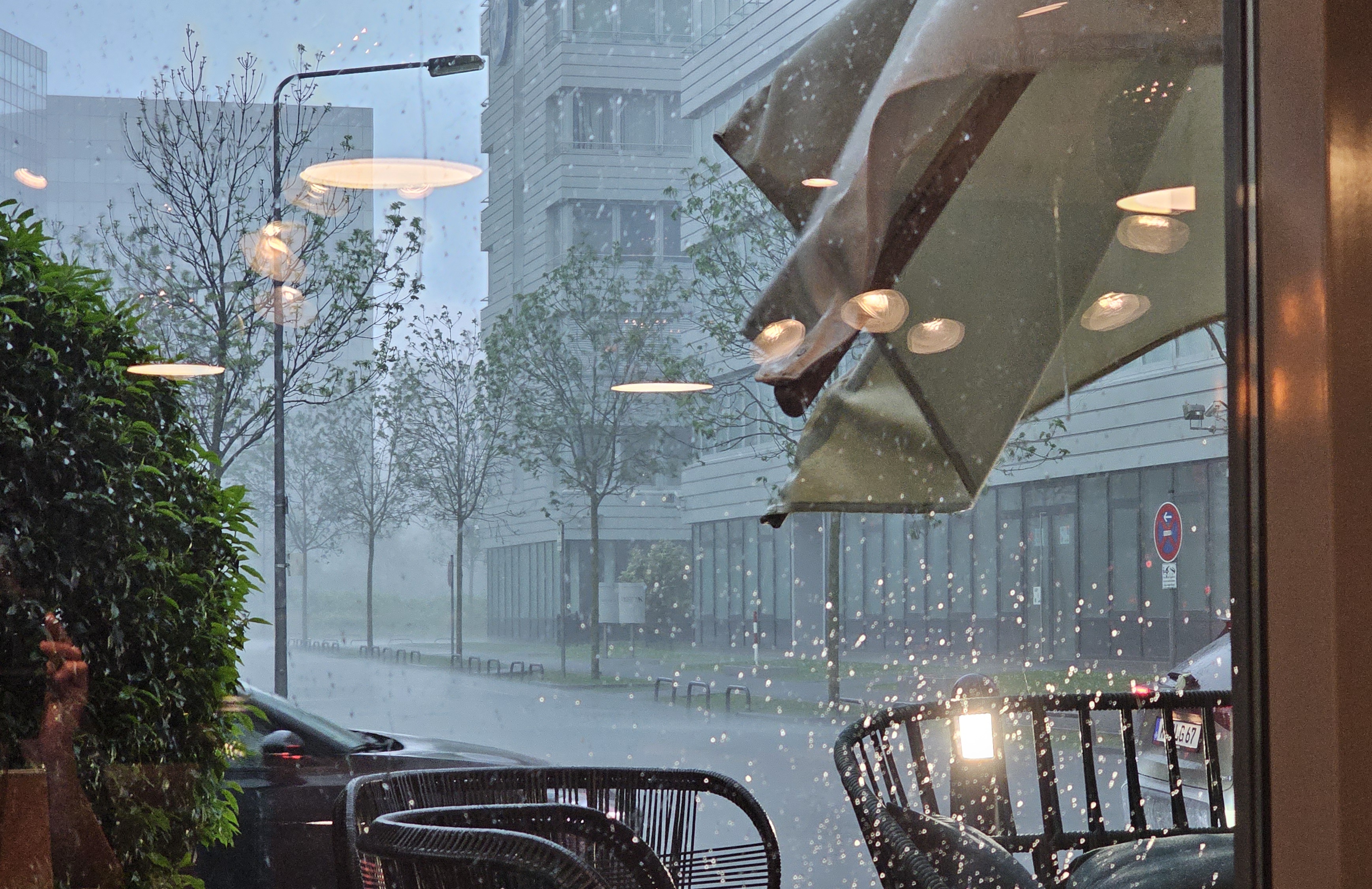 Um 18 Uhr zieht ein Unwetter auf, das die Nacht anhalten soll. Wie schön, dass es im Foyer des Motel One trocken und warm ist. Es gießt wie aus Eimern, hagelt, blitzt und donnert bei heftigem Sturm. Die großen Sonnenschirme knallen gegen die Scheiben, die Tische vor dem Eingang fliegen durch die Gegend. Der Anreisetag endet mit action vor der Tür.