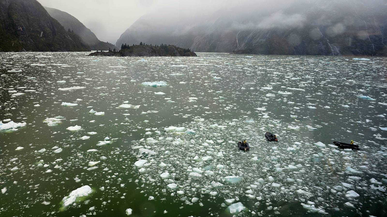 Die Zodiaks kurven ungefähr eine Stunde mit uns an Bord umher und bringen uns dem beeindruckenden Gletscher noch etwas näher. Doch auch von Deck 11 ist die Ansicht bewegend.
