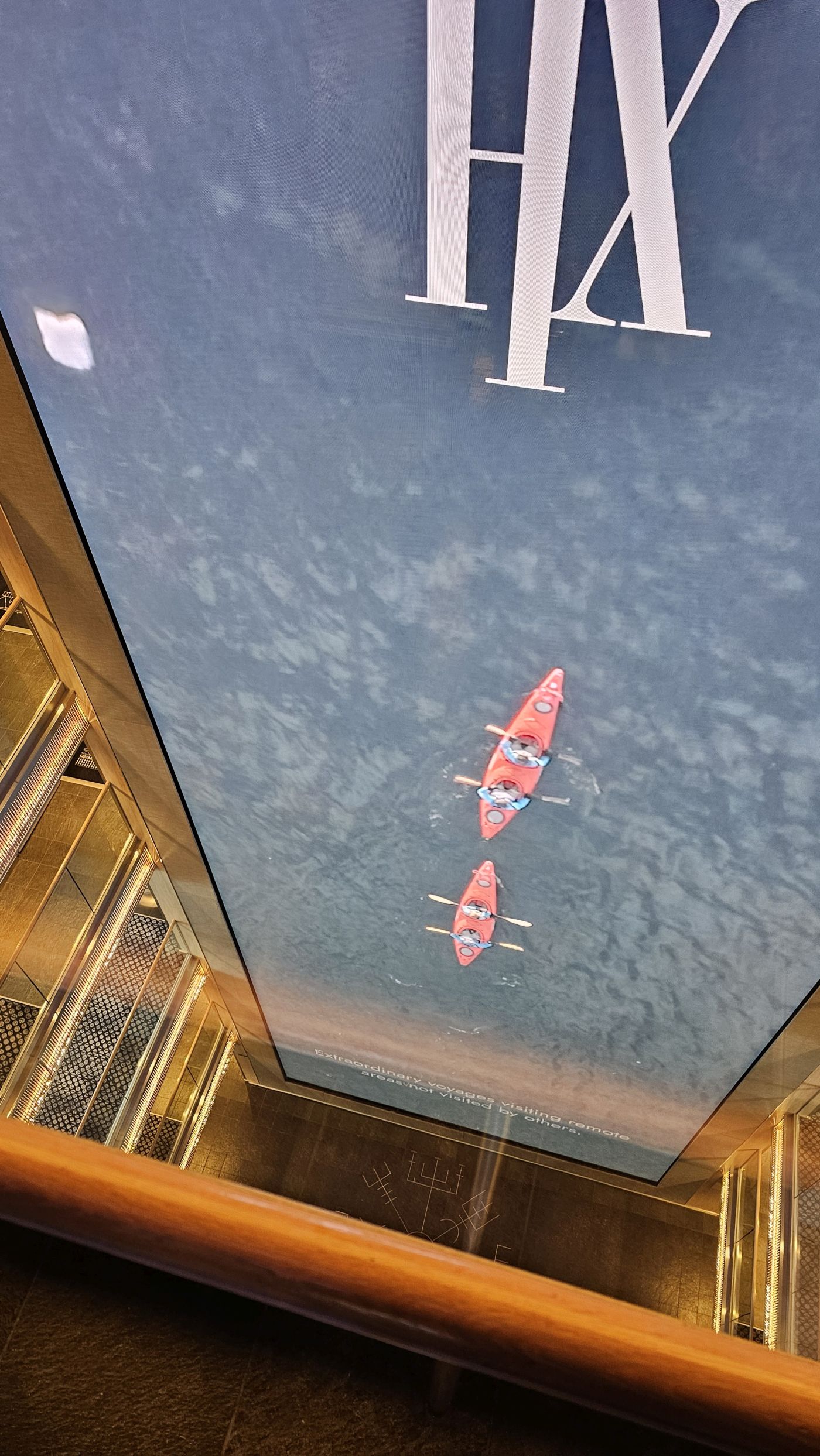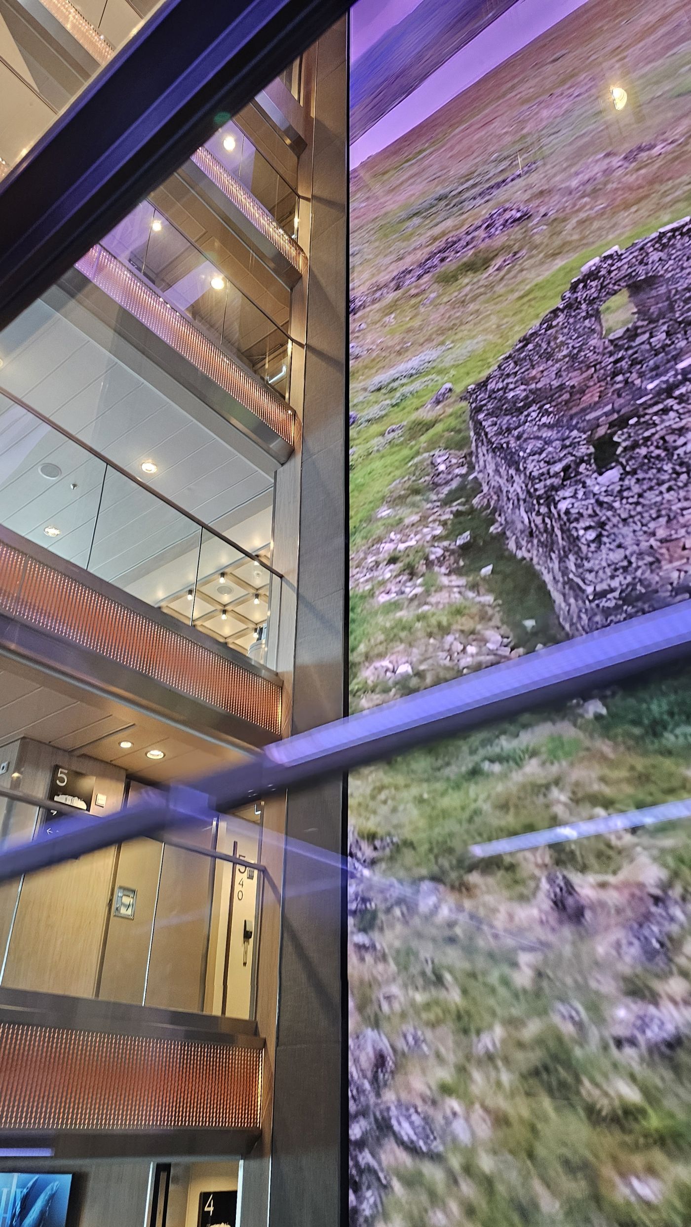Fährt man mit dem gläsernen Fahrstuhl zwischen den 10 Decks rauf und runter, schaut man auf ein 17 Meter hohes LED-Display, das schöne Bilder vergangener Hurtigruten-Fahrten zeigt. Bären, Pinguine, Eisberge, Kajaks, einsame Fjorde und natürlich die Roald Amundsen. Es ist unmöglich, das Display im Ganzen zu fotografieren.