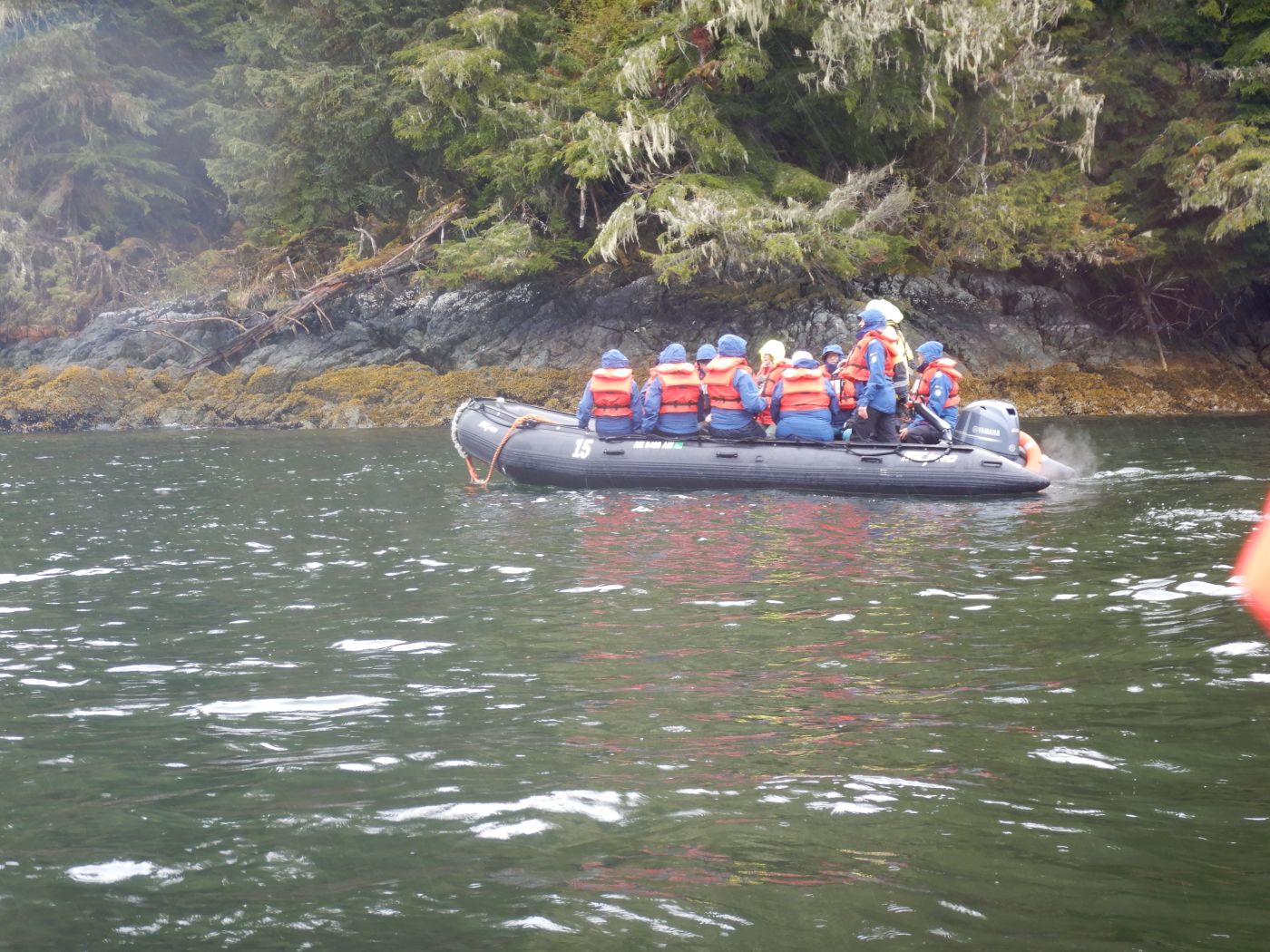 Unsere Gruppe startet ganz früh bei nur leichtem Regen mit dem Zodiak zu Tierbeobachtungen in der Kelp Bay.