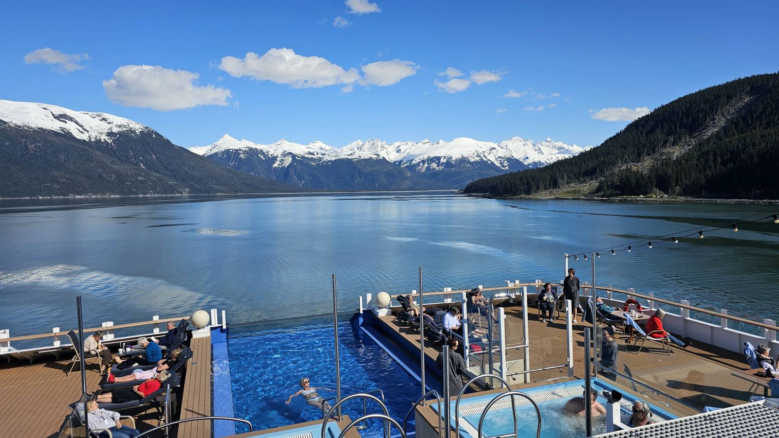 Auf Deck 10 ist auch der SPA-Bereich, Fitness-Studio, Sauna. Im Außen-Whirlpool und Swimmungpool hat man einen freien Blick in den Himmel.