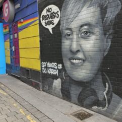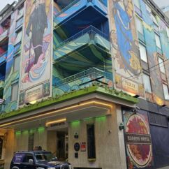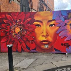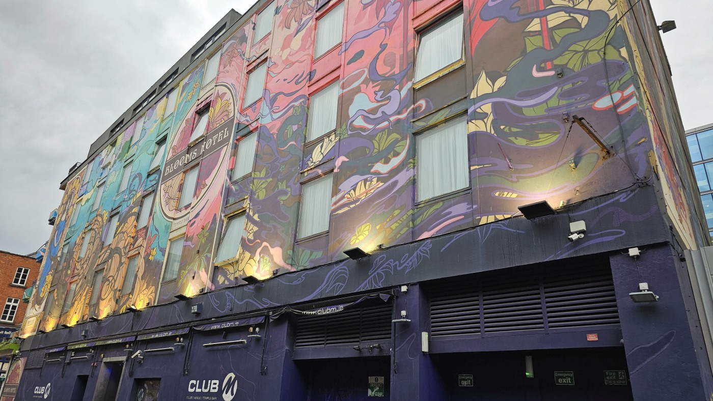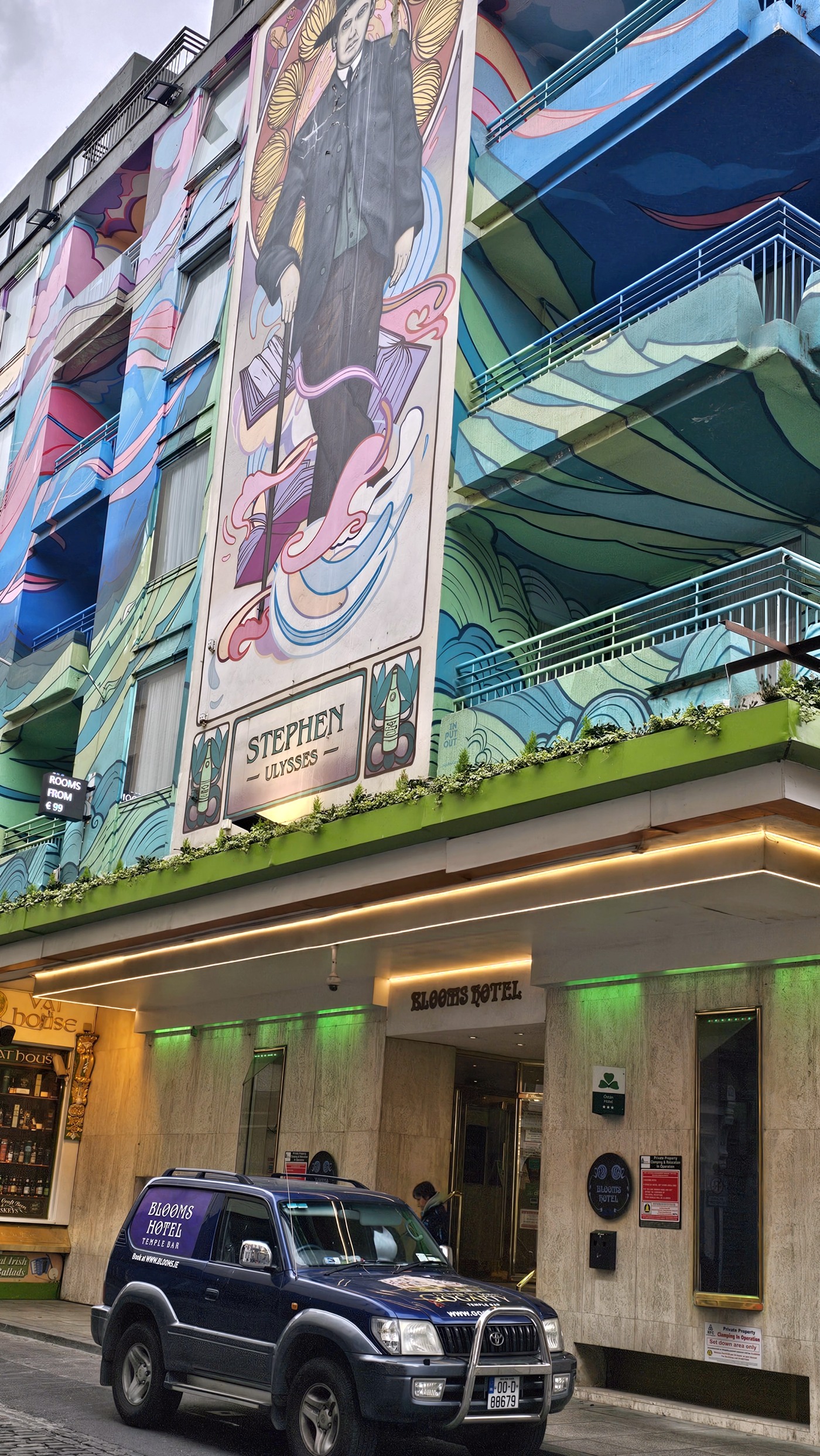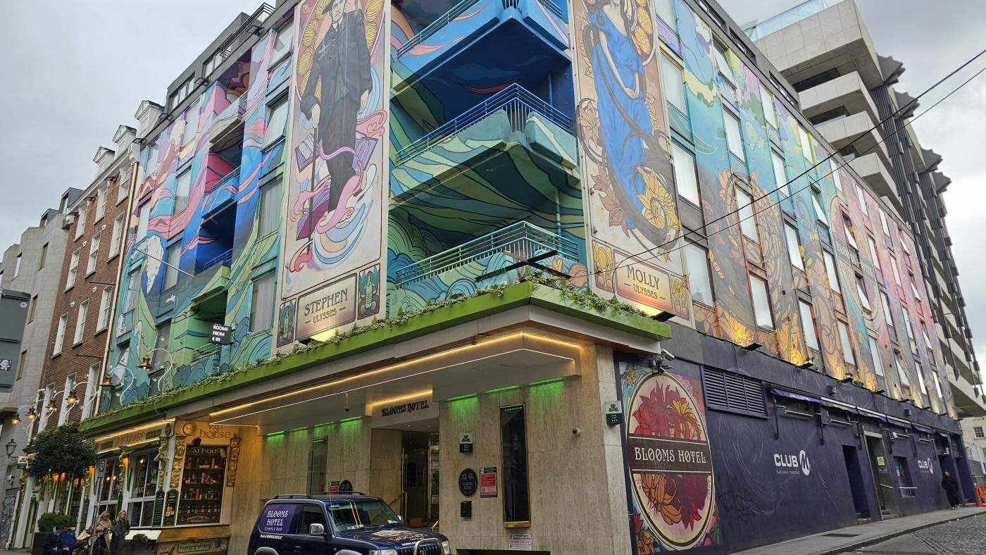 Mit einem Express-Shuttlebus erreichten wir Blooms Hotel im Bezirk Tempel Bar. Es ist wohl das bunteste Hotel weit und breit. Graffiti als Schmiererei finden wir gruselig, doch so kunstvoll gefällt es uns sehr.