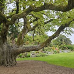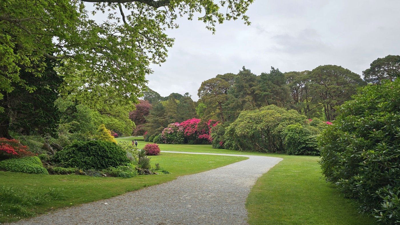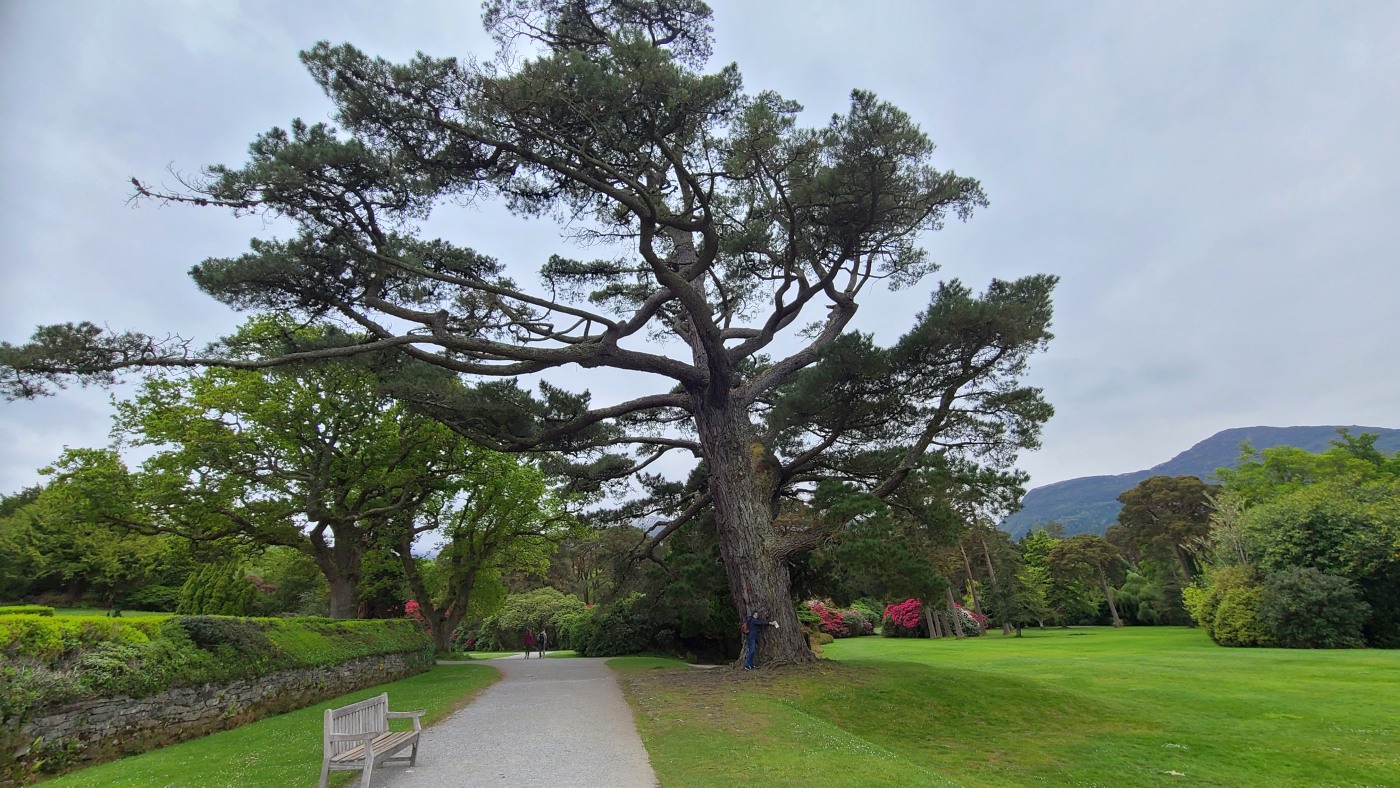 Da wir meinten, weniger Verkehr in der anderen Richtung zu haben, starten wir entgegengesetzt und fahren zuerst durch den Killarney Nationalpark. Unser erster Stopp ist bei Muckross House & Garden, einem Herrenhaus aus dem Mittelalter mit einem herrschaftlichen Park und finden Baumriesen und Rhododendren in einer Größe vor, wie wir sie selten gesehen haben.