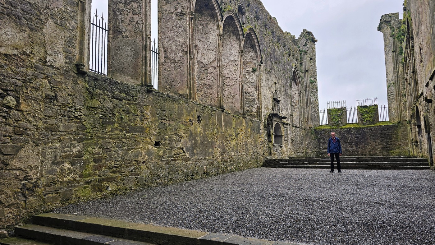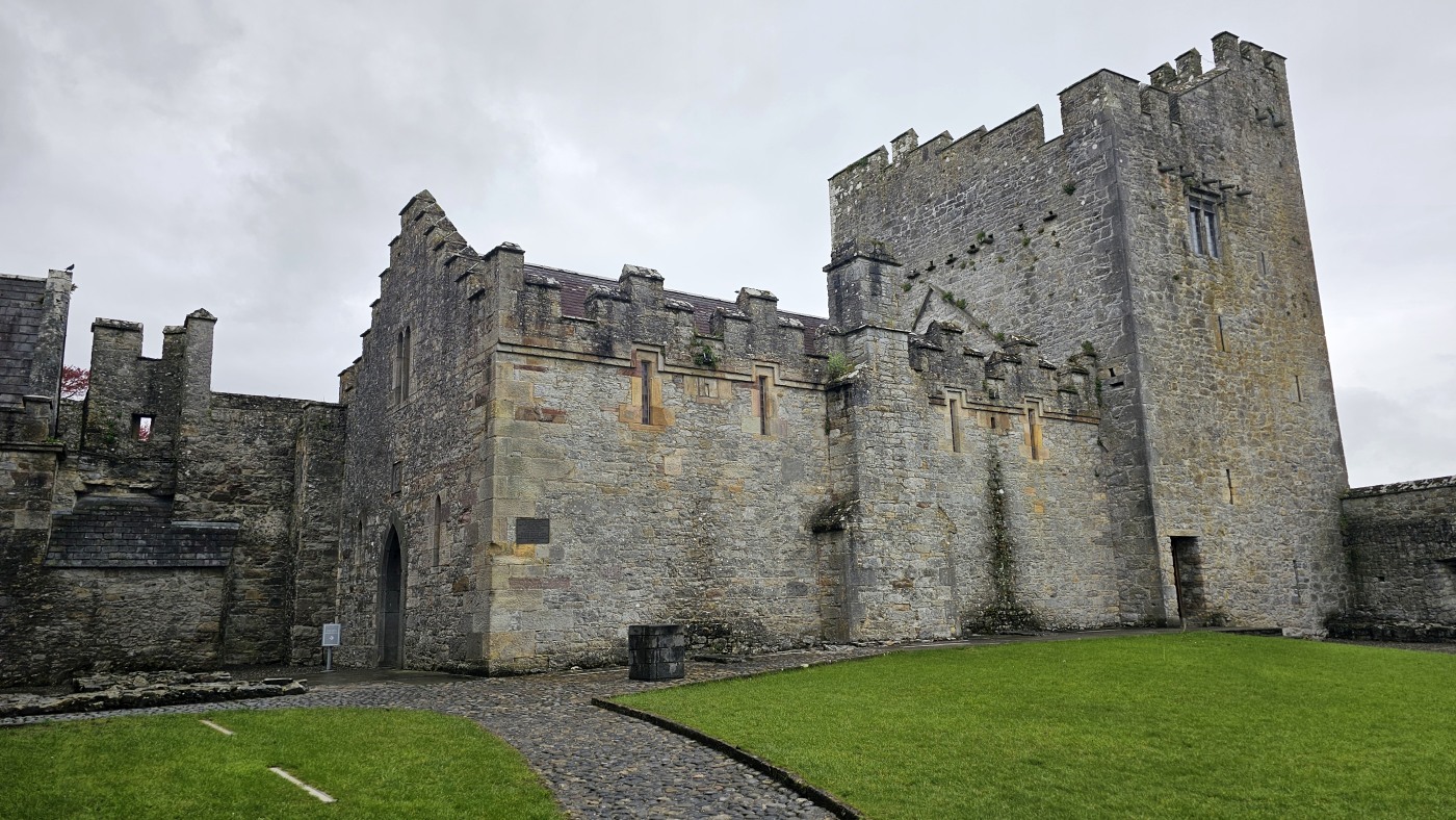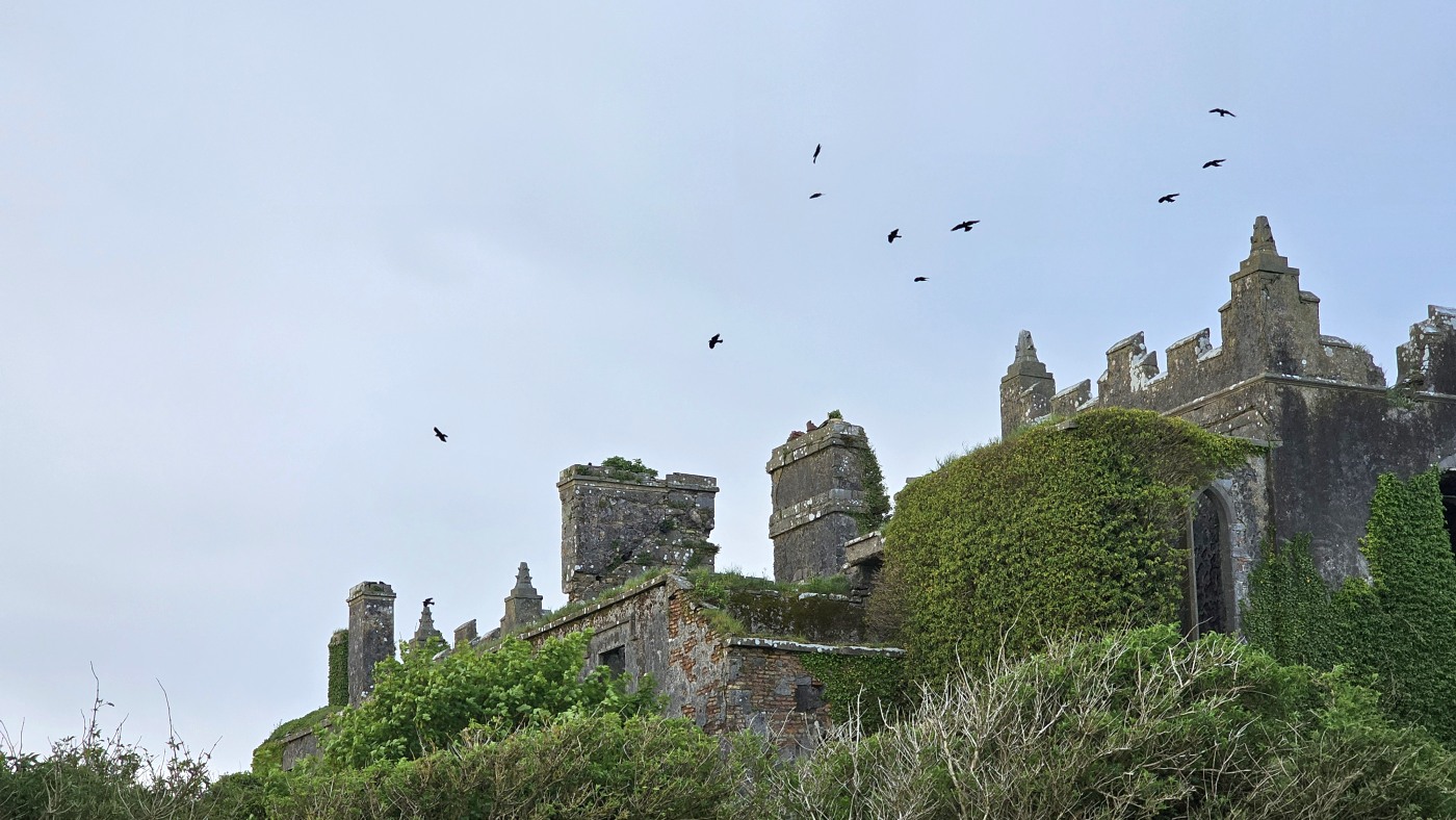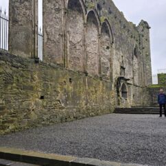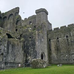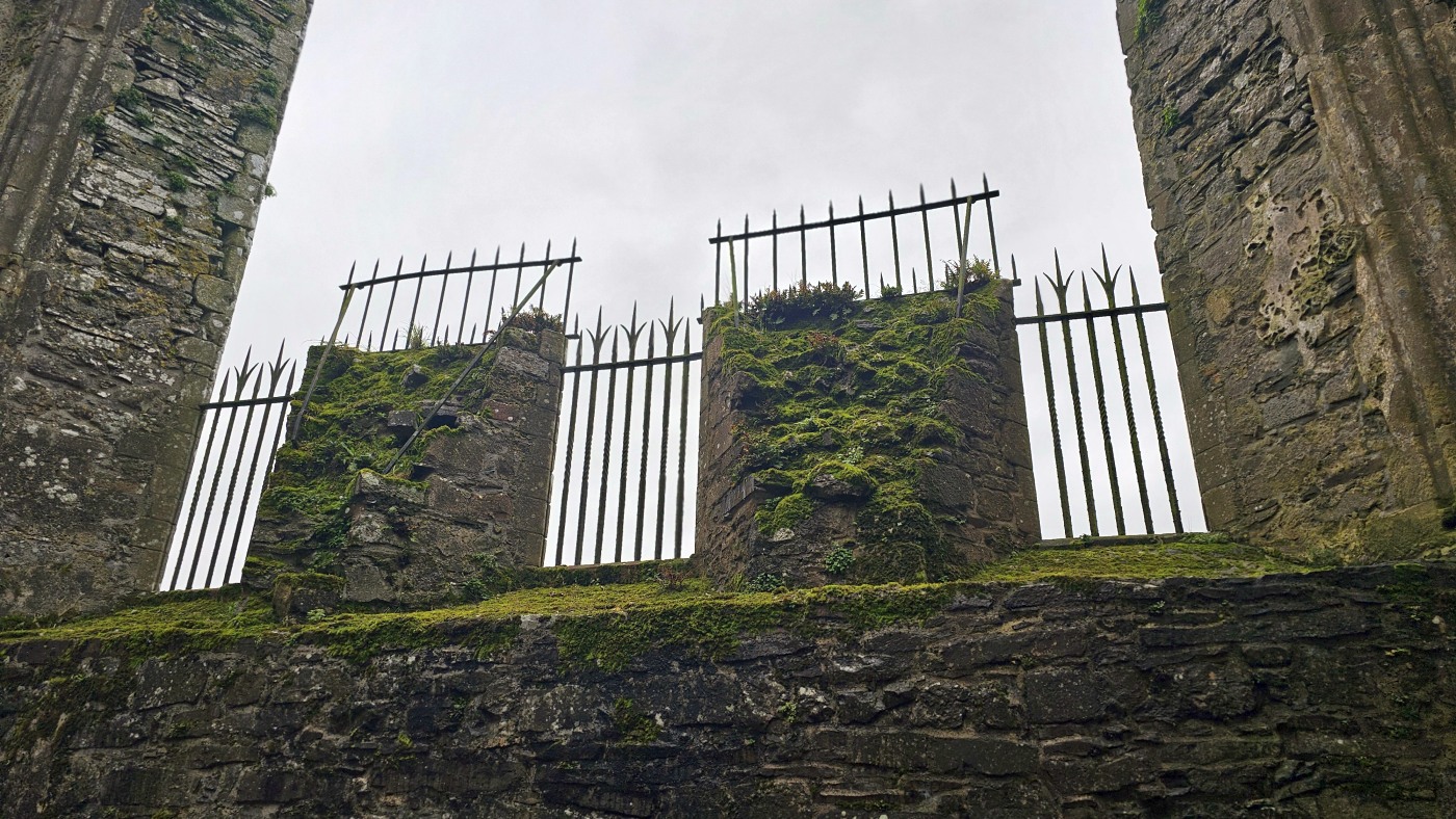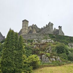 Die Burg auf dem Rock of Cashel ist älter und in weniger gut erhaltenem Zustand. Innenräume sind nicht zu besichtigen, doch die Ruine ist um ein Vielfaches höher und auch größer. Ein beeindruckendes Monument mit vielen Grabplatten, einem großen Friedhof und Krähen, die ihre Nester in den Wänden angelegt haben. Sie kreisen bei dem Nieselwetter über der Ruine und das sieht schon ein wenig gruselig aus.