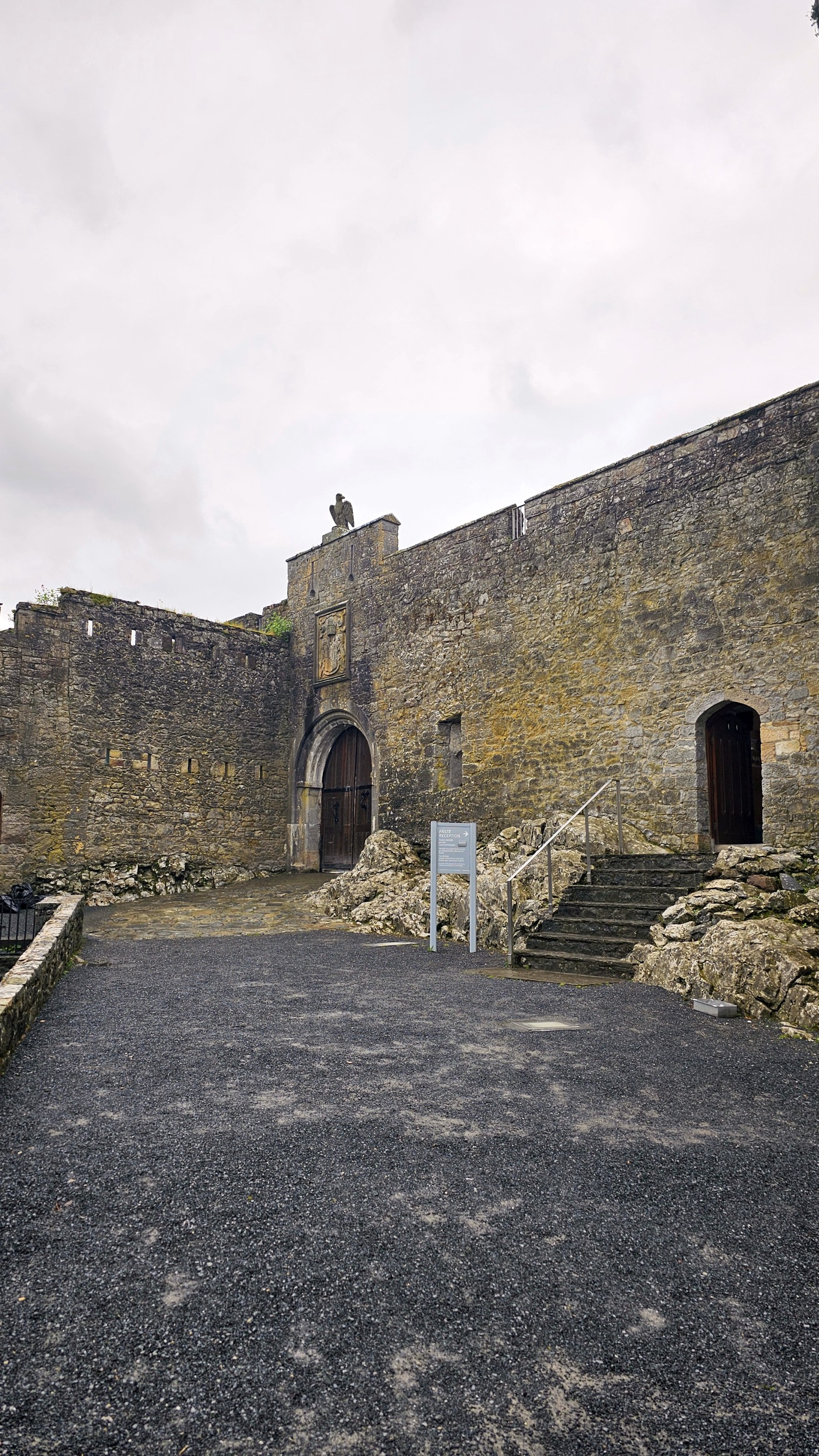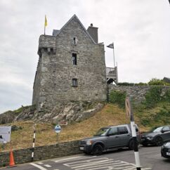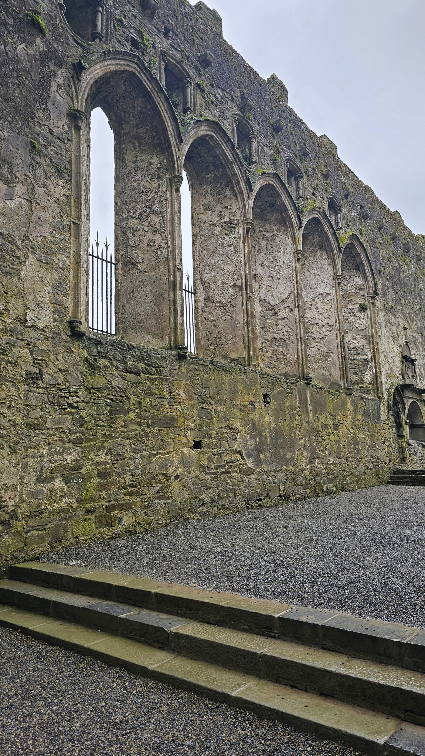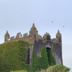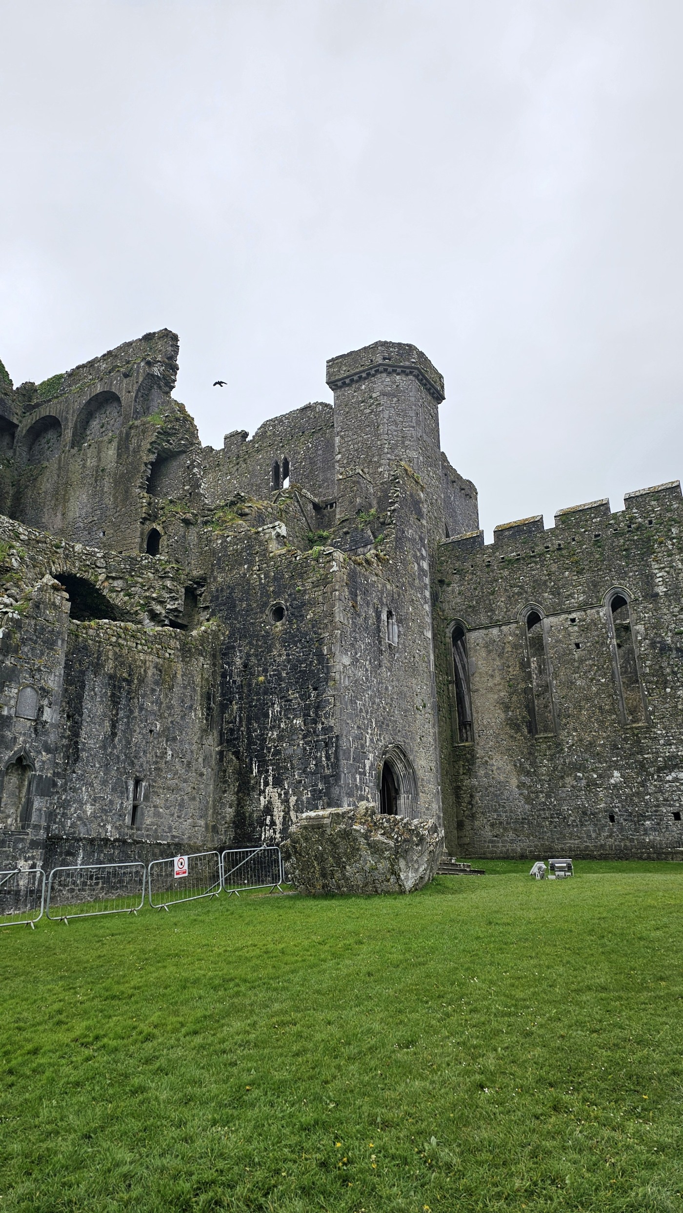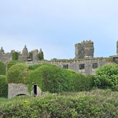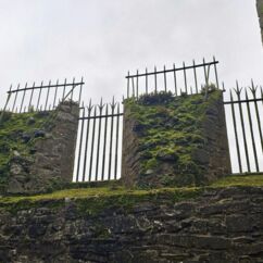 Die Burg auf dem Rock of Cashel ist älter und in weniger gut erhaltenem Zustand. Innenräume sind nicht zu besichtigen, doch die Ruine ist um ein Vielfaches höher und auch größer. Ein beeindruckendes Monument mit vielen Grabplatten, einem großen Friedhof und Krähen, die ihre Nester in den Wänden angelegt haben. Sie kreisen bei dem Nieselwetter über der Ruine und das sieht schon ein wenig gruselig aus.