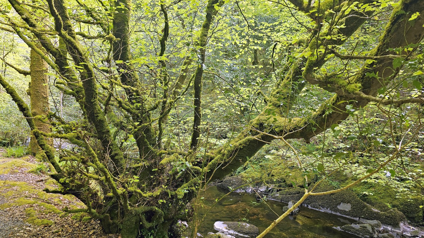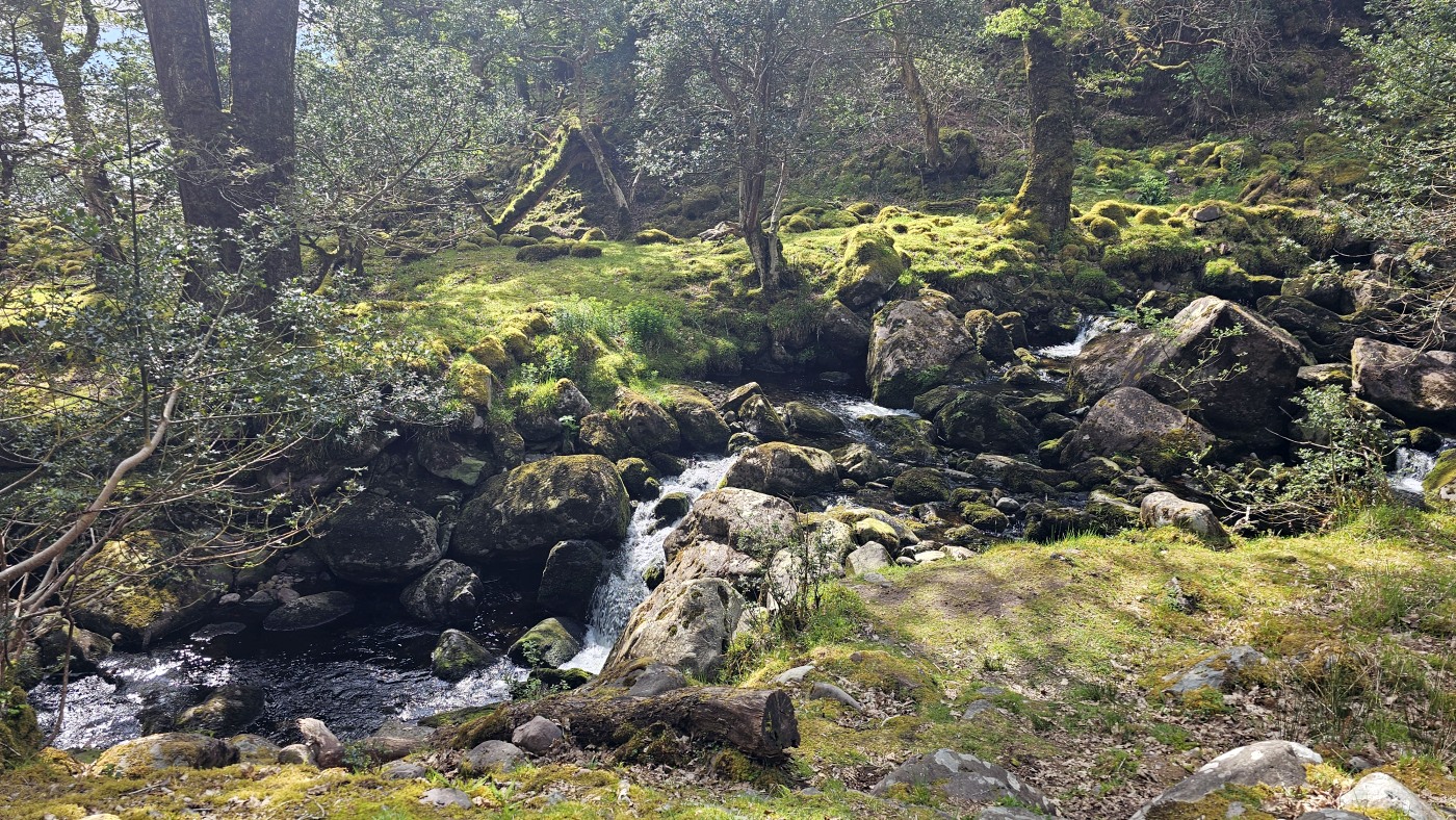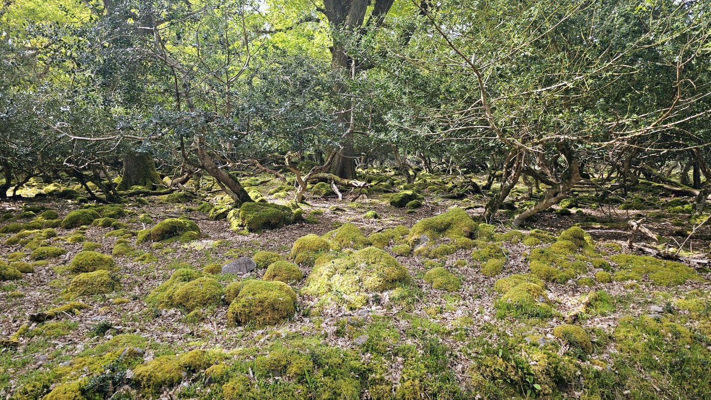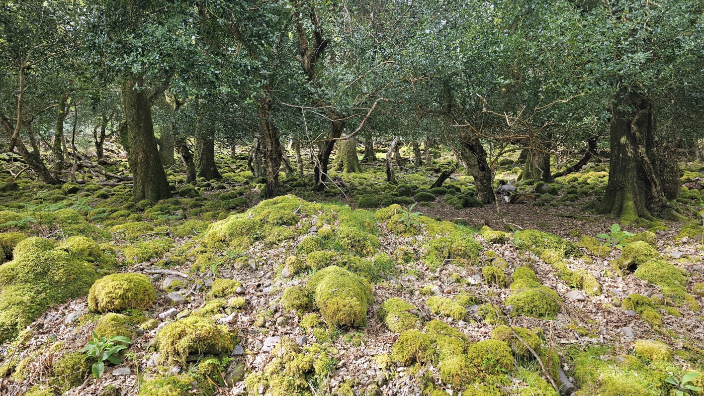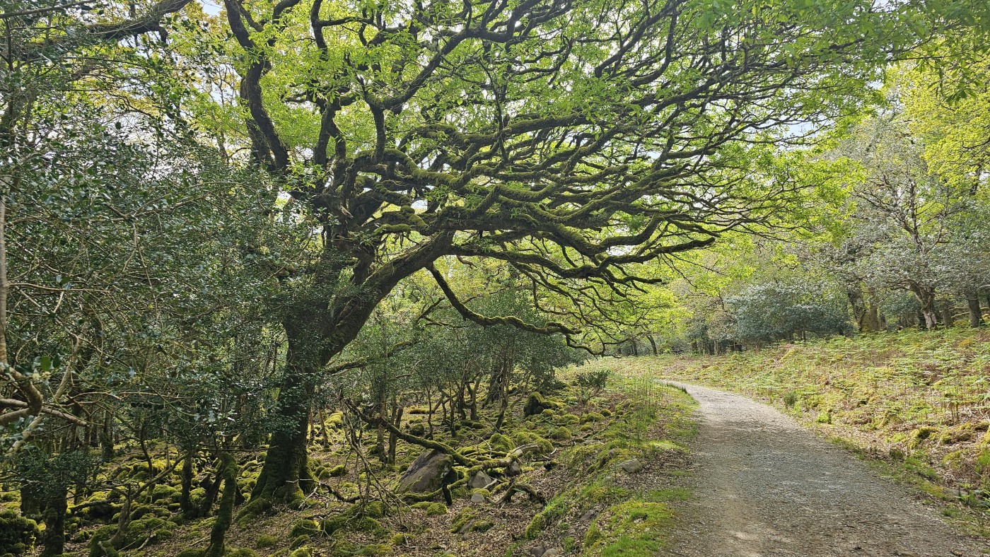 Der Waldboden und viele Bäume sind mit Moos bewachsen - das sieht sehr verwunschen aus. Ähnliches kennen wir nur aus Schweden oder Island und wir fragen uns, ob die Iren auch an märchenhafte Trolle glauben. Vorstellbar wäre es... Viele uralte Ilex wachsen hier und ihr Blätterdach bildet die erste Ebene vor dem darüberliegenden Blätterdach der knorrigen alten Eichen und anderen Bäume.