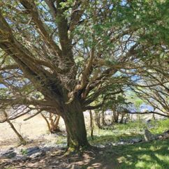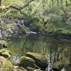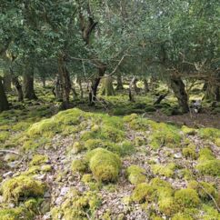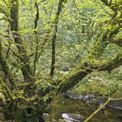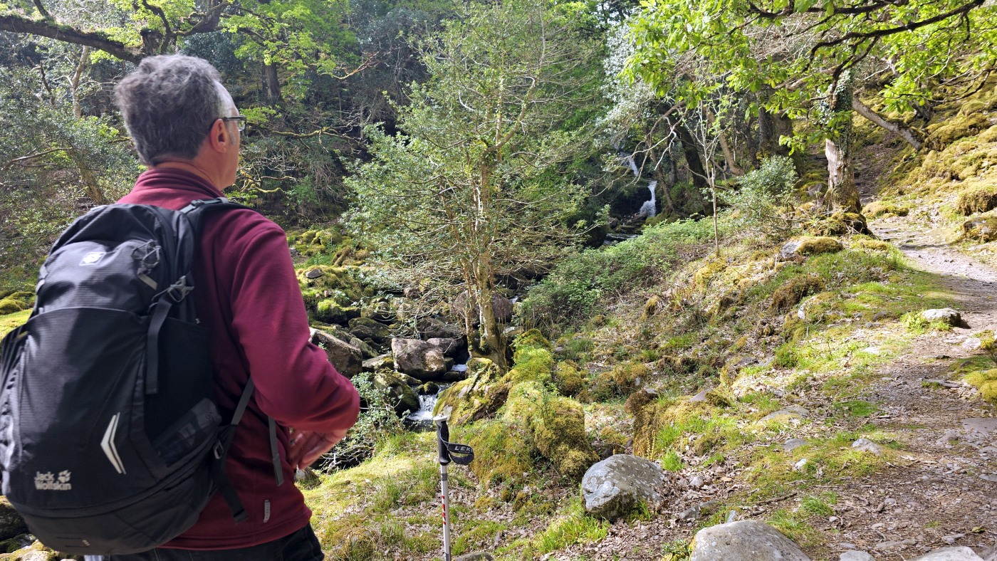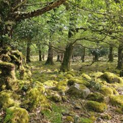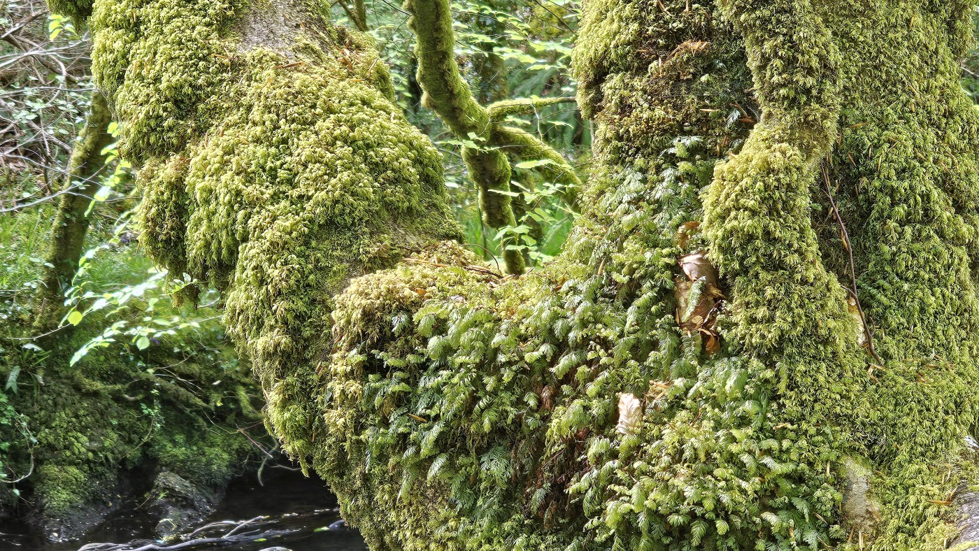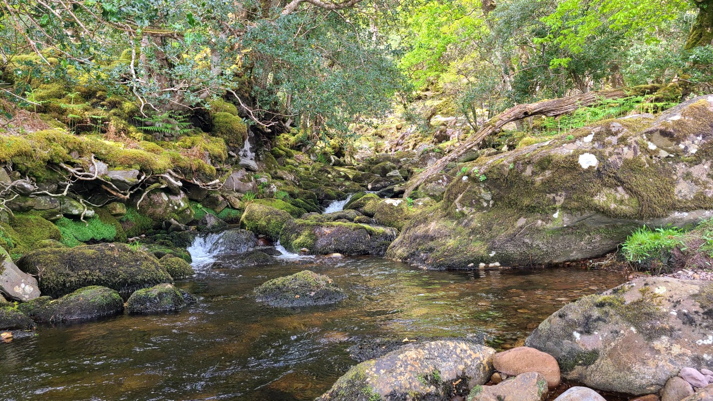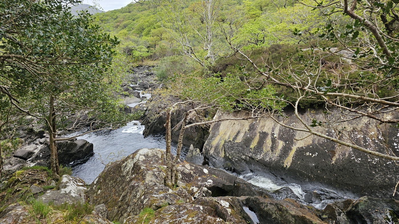 Der Waldboden und viele Bäume sind mit Moos bewachsen - das sieht sehr verwunschen aus. Ähnliches kennen wir nur aus Schweden oder Island und wir fragen uns, ob die Iren auch an märchenhafte Trolle glauben. Vorstellbar wäre es... Viele uralte Ilex wachsen hier und ihr Blätterdach bildet die erste Ebene vor dem darüberliegenden Blätterdach der knorrigen alten Eichen und anderen Bäume.