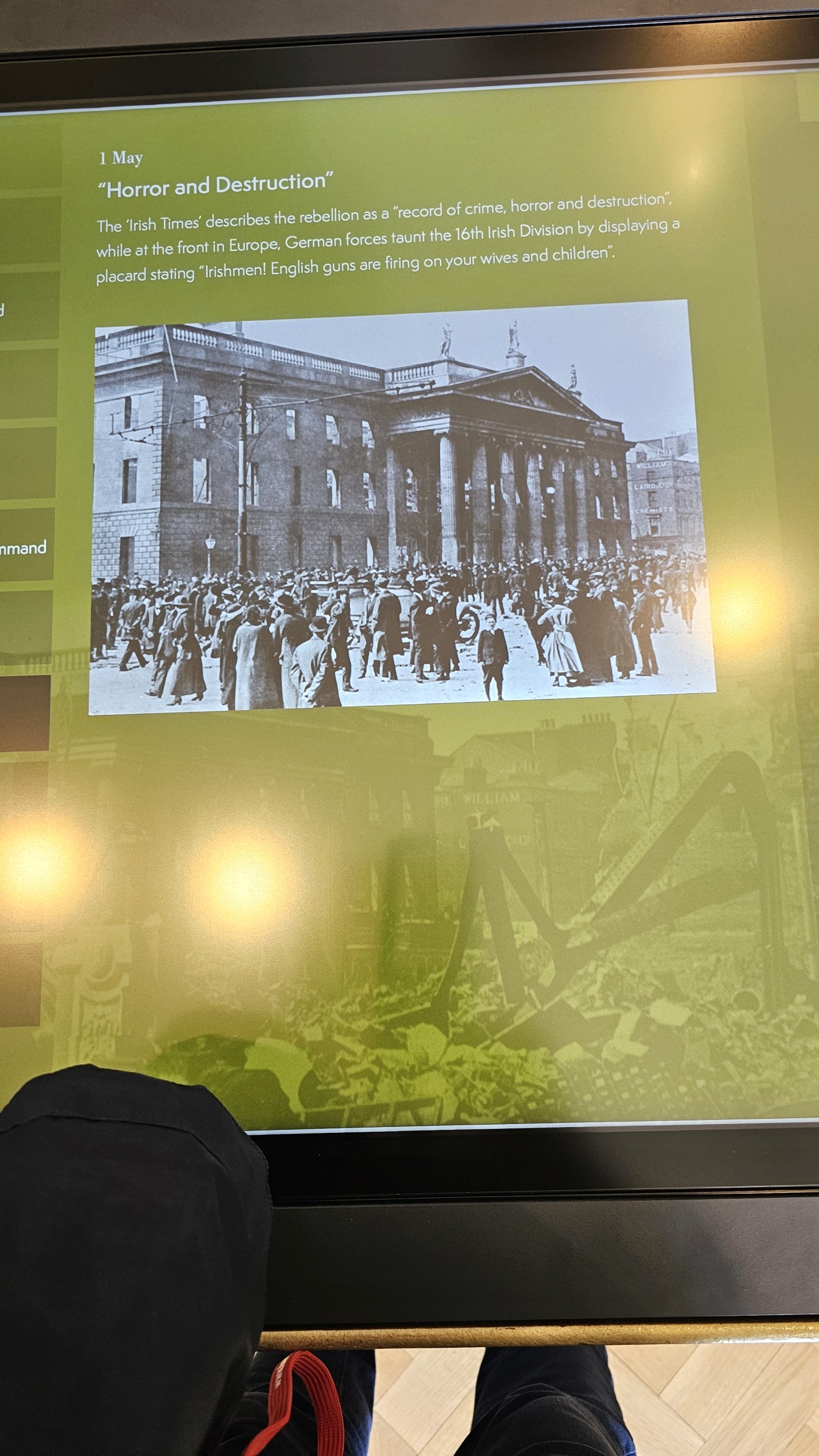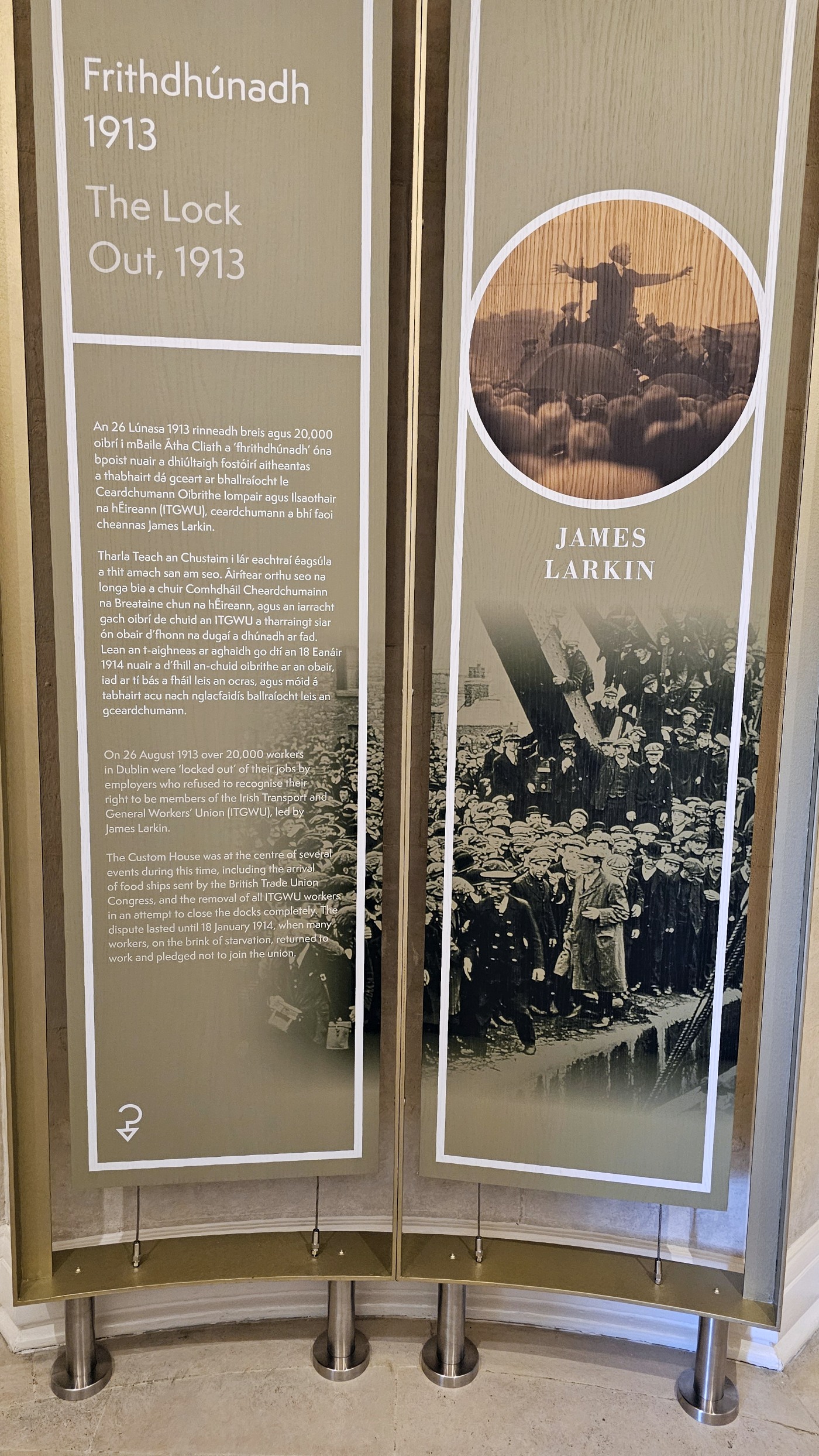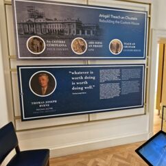 Das Gebäude wurde 1781/91 gebaut und diente viele Jahre als Zollamt, brannte 1921 nieder, wurde wieder aufgebaut und in den 1980er Jahren restauriert. Als Besucher erfahren wir etwas über die Architektur und Geschichte des Gebäudes am Hafen - dem Knotenpunkt des Handels und der Verwaltung. Alles ist sehr eng mit der Geschichte Irlands verknüpft, die hier sehr interessant und anschaulich dargestellt wird: Eine für den Großteil der Bevölkerung meist harte Zeit unter britischer Herrschaft, Osteraufstand 1916, 1919 Ausruf einer Republik, 1922 eine provisorische Regierung - ohne den Nordosten, dafür mit anschließenden Spannungen. Erst 1949 schied Irland nach drei Jahrhunderten britischer Herrschaft aus dem Commonwealth of Nations aus. Und erst 1998 machte das s.g. Karfreitagsabkommen den Spannungen zwischen Irland und Nordirland ein Ende.