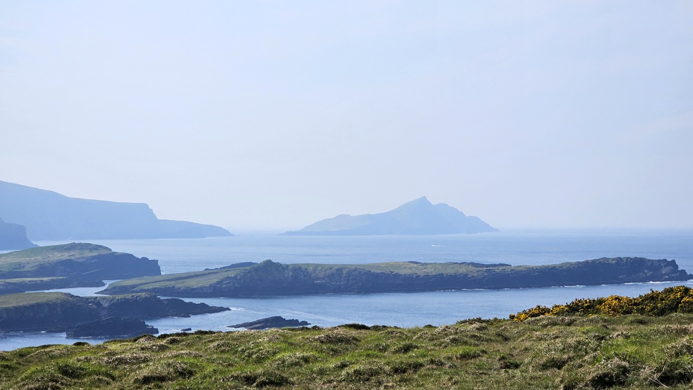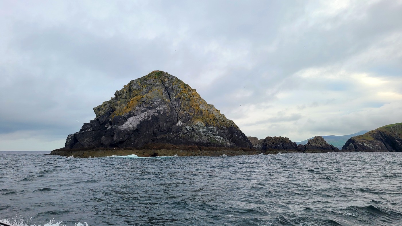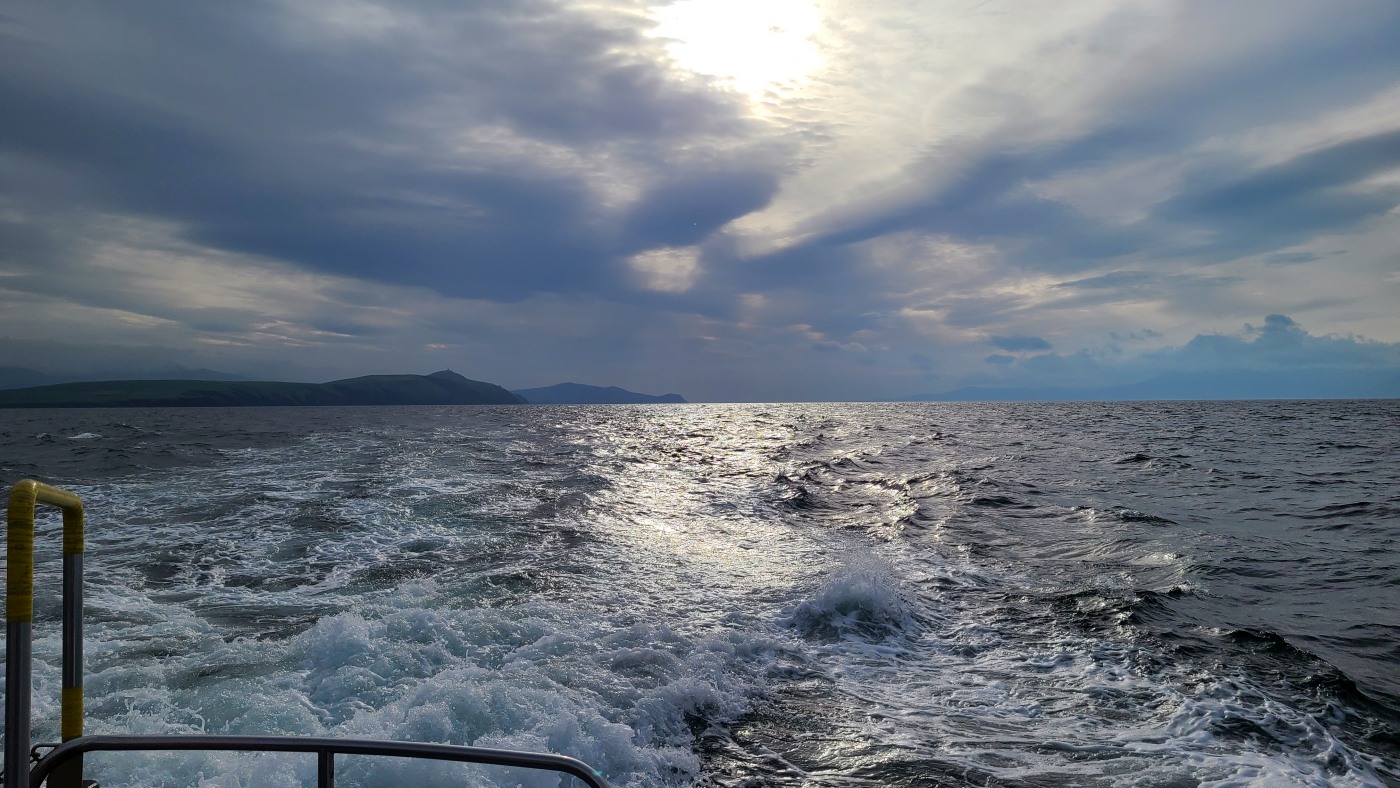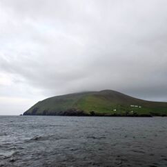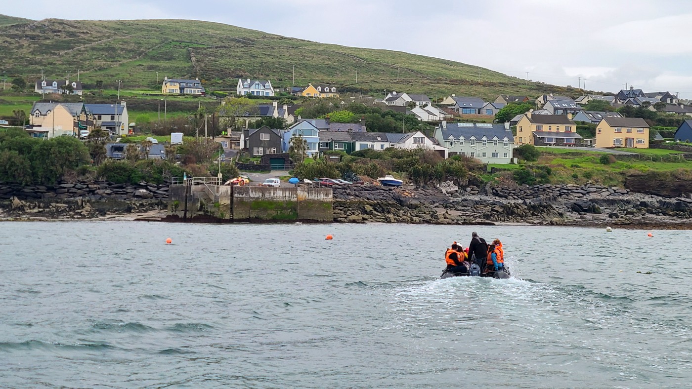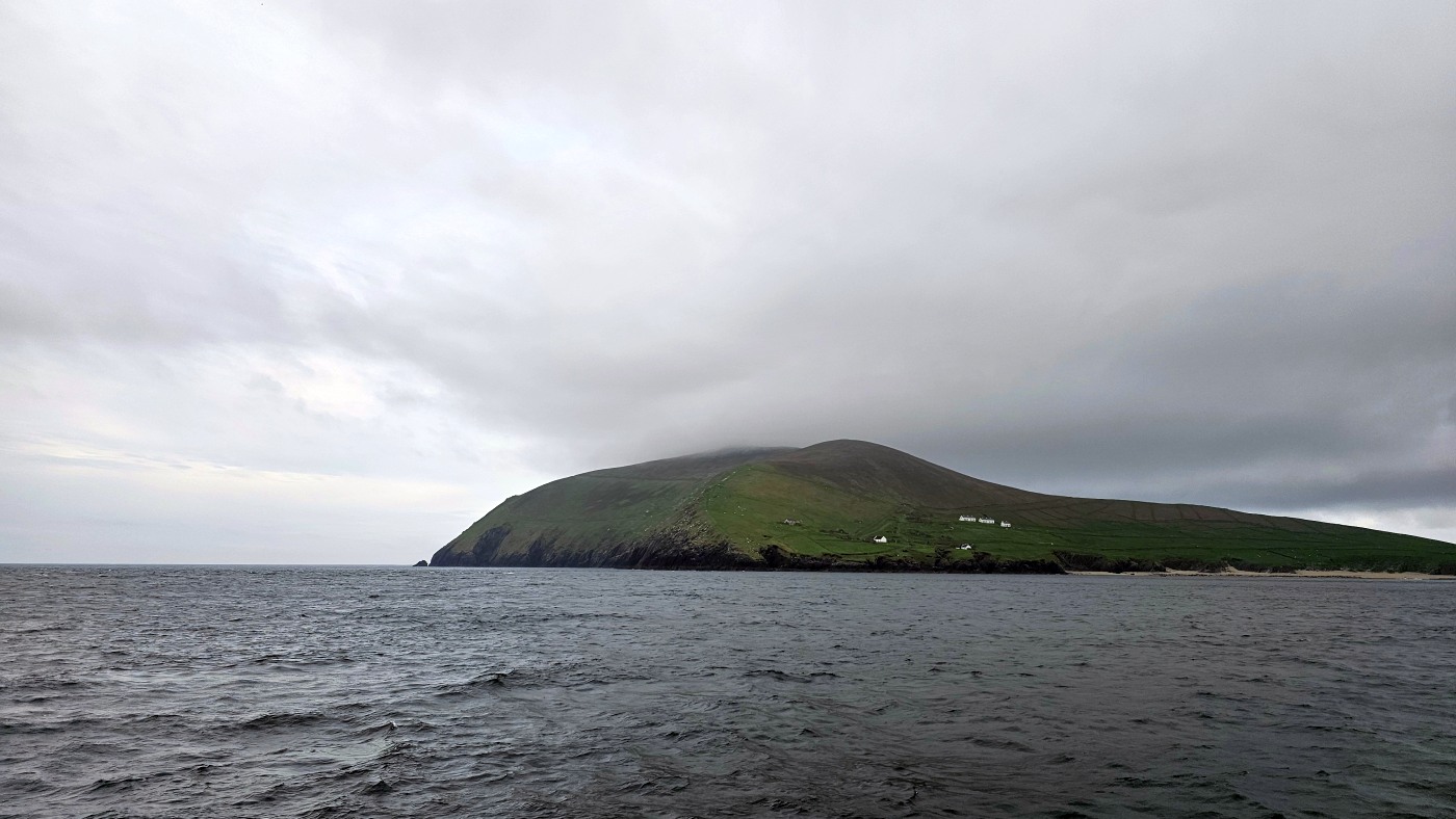 Wir fahren eineinhalb Stunden bis zum Ablegepier in Ventry - das ist fast am Ende der Halbinsel Dingle und steigen mit knapp zwanzig weiteren Passagieren in ein kleines Boot. Der spätere Ausstieg wird etwas umständlicher werden, denn ca 5 Meter abfließendes Tidenwasser während der Fahrt macht das Umsteigen in ein kleines Beiboot erforderlich, um an Land zu gelangen.