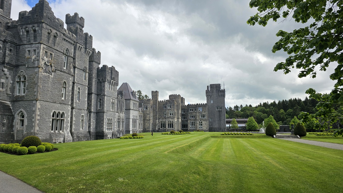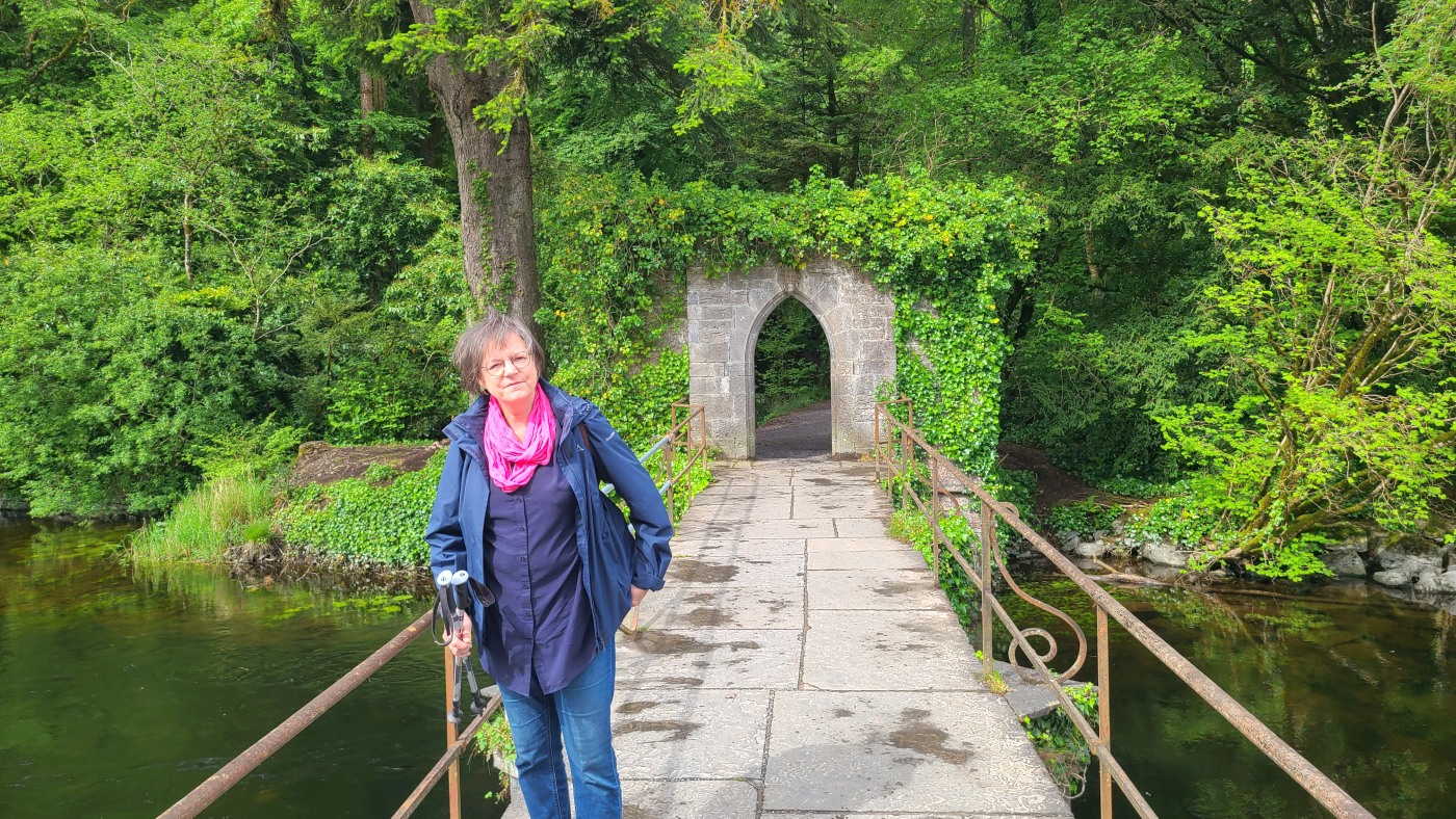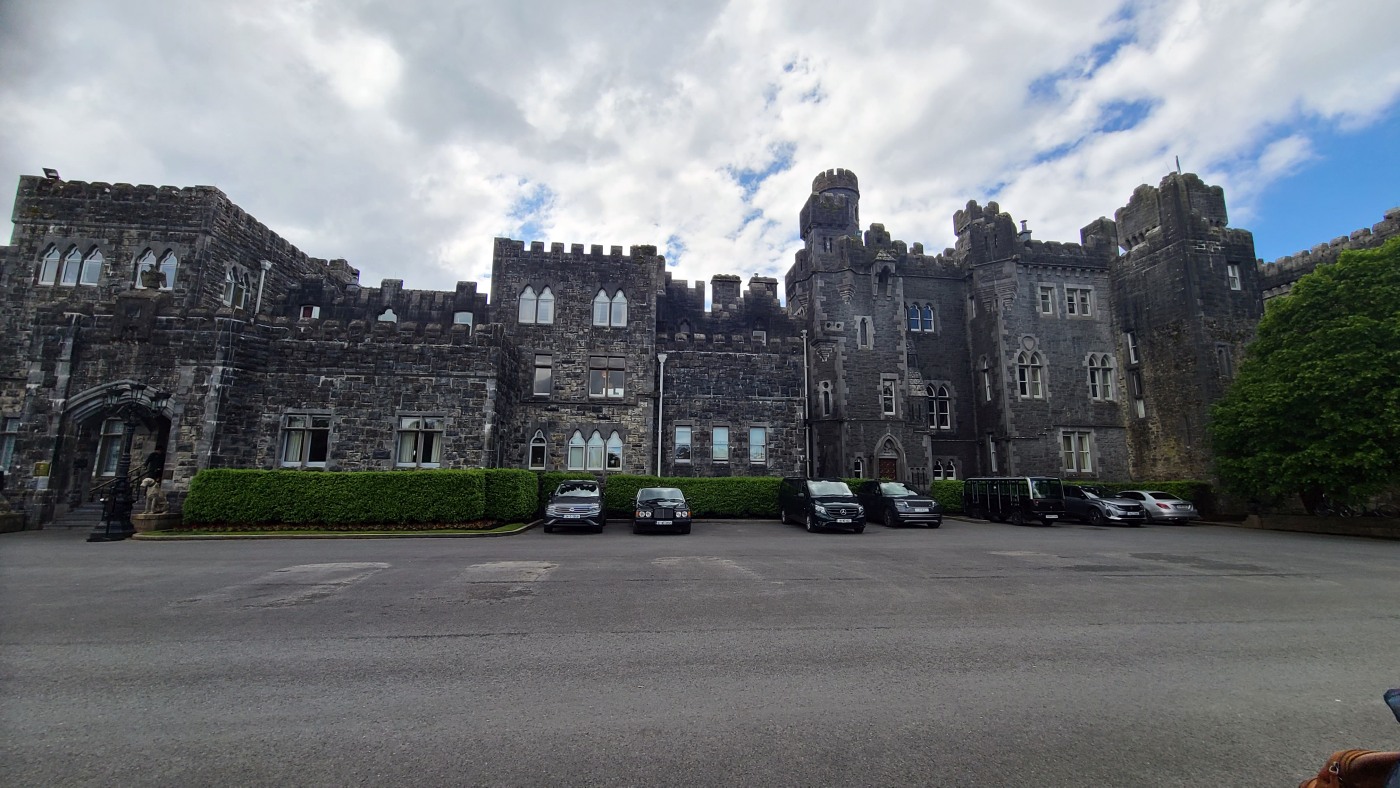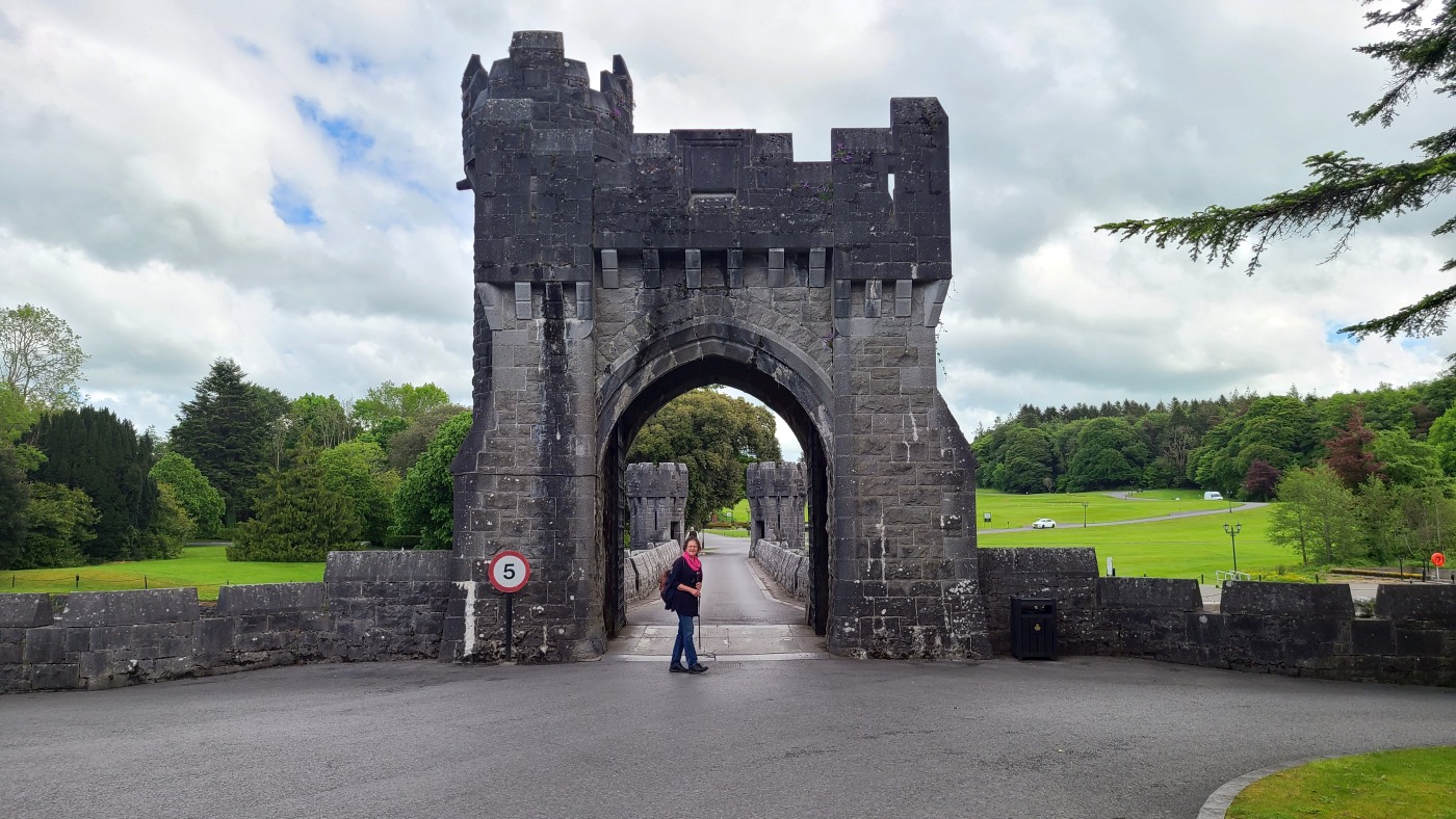 Die Ortschaft Cong liegt an einem See inmitten eines großen Waldgebietes und wir hatten uns vorgestern über Komoot eine neun Kilometer lange Runde ausgesucht. Eine Überraschung gab´s am Ende. Ein elegantes Schild mit Wappen wies darauf hin, dass man nun Privatbesitz betreten würde. Hunde müssten an die Leine, Hinterlassenschaften mitgenommen werden, Wild dürfe nicht gefüttert werden, Müll nicht liegenlassen, usw. Die Liste war lang und enthielt sogar die Aufforderung, angemessene Kleidung zu tragen. Der Weg führte uns uns dann irgendwann aus dem Wald heraus, kamen an zwei Tennisplätzen vorbei und wir landeten im unfassbar großen Schlossparkgelände des Hotels Ashford Castle. Vor dem Eingang Diener in Livree, vor dem Schlossgraben und den zwei Eingangsrundbögen an den Enden der Brücke Bedienstete, ein Hubschrauberlandeplatz und eine gepflegte Rasen- und Gartenanlage, die sicherlich ein Heer von Gärtnern benötigt. Eine Übernachtung mit Frühstück inkl. vorgewärmten Handtüchern, Bettwäsche aus ägyptischer Baumwolle mit Schlosswappen, Obstkorb, Rundumservice und was man sonst so im Leben braucht, kostet hier nur 985 €. Bei dem Ambiente sicherlich ein Schnäppchenpreis ;)