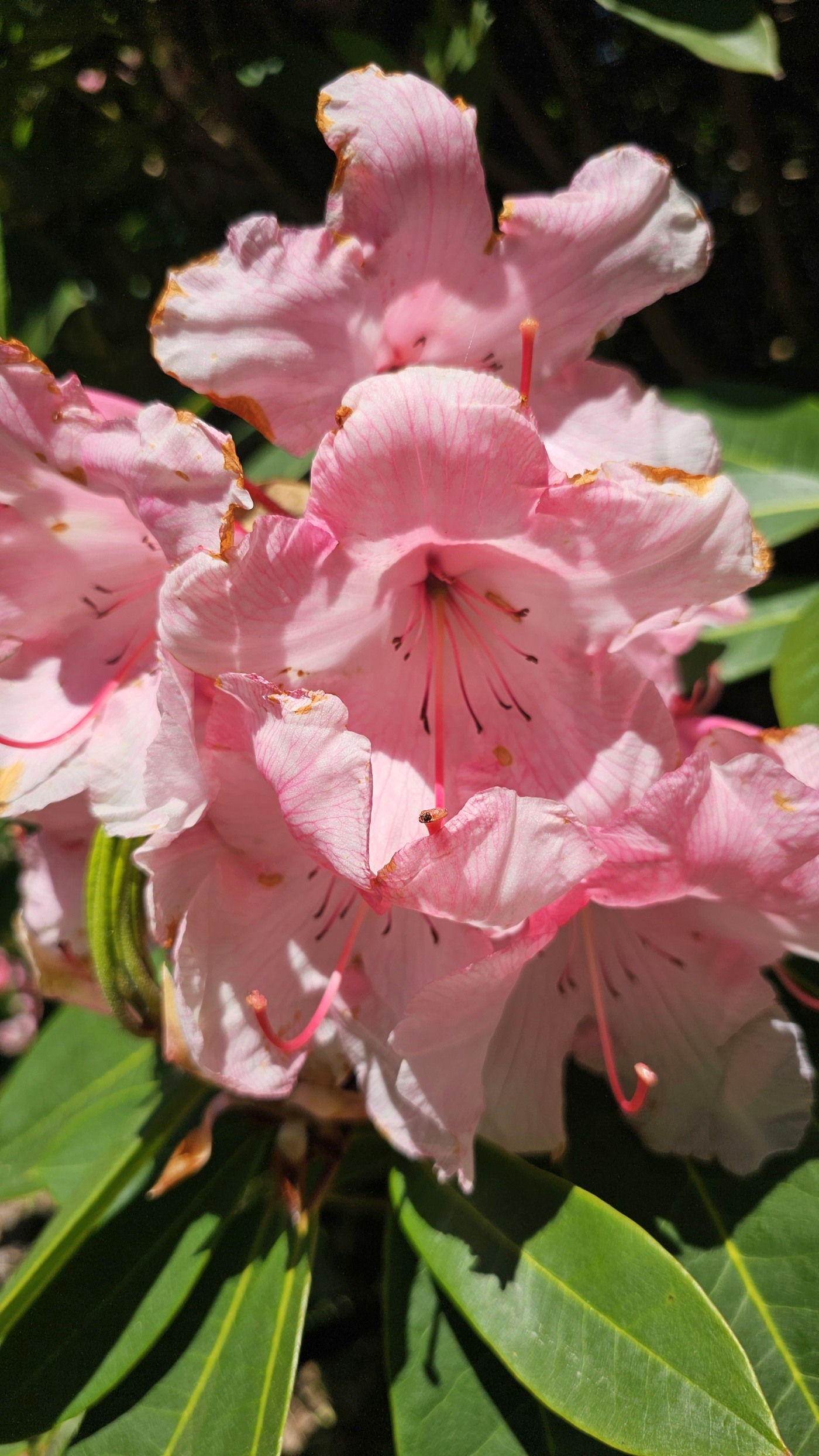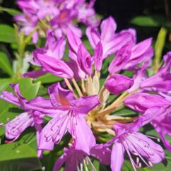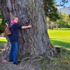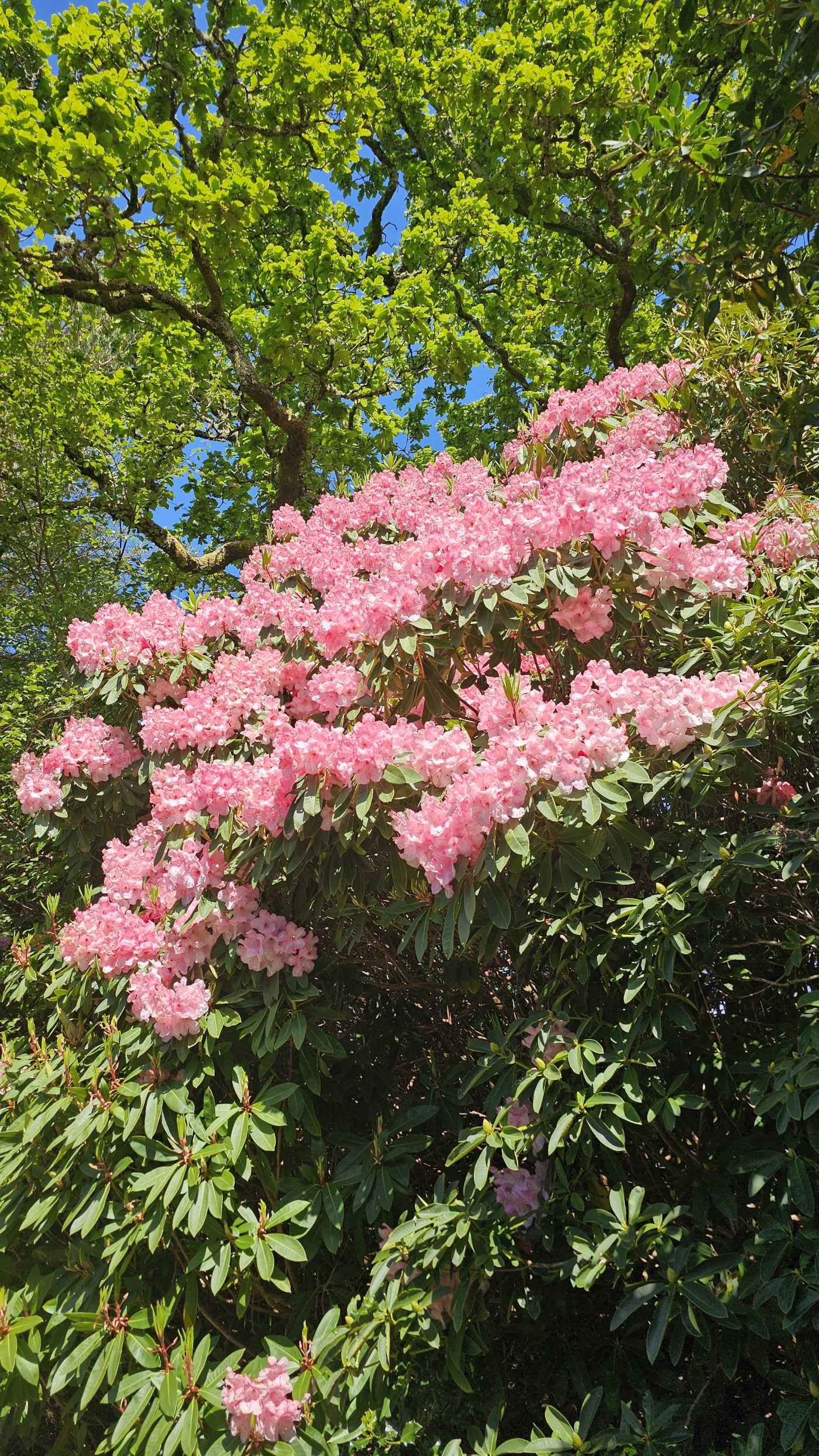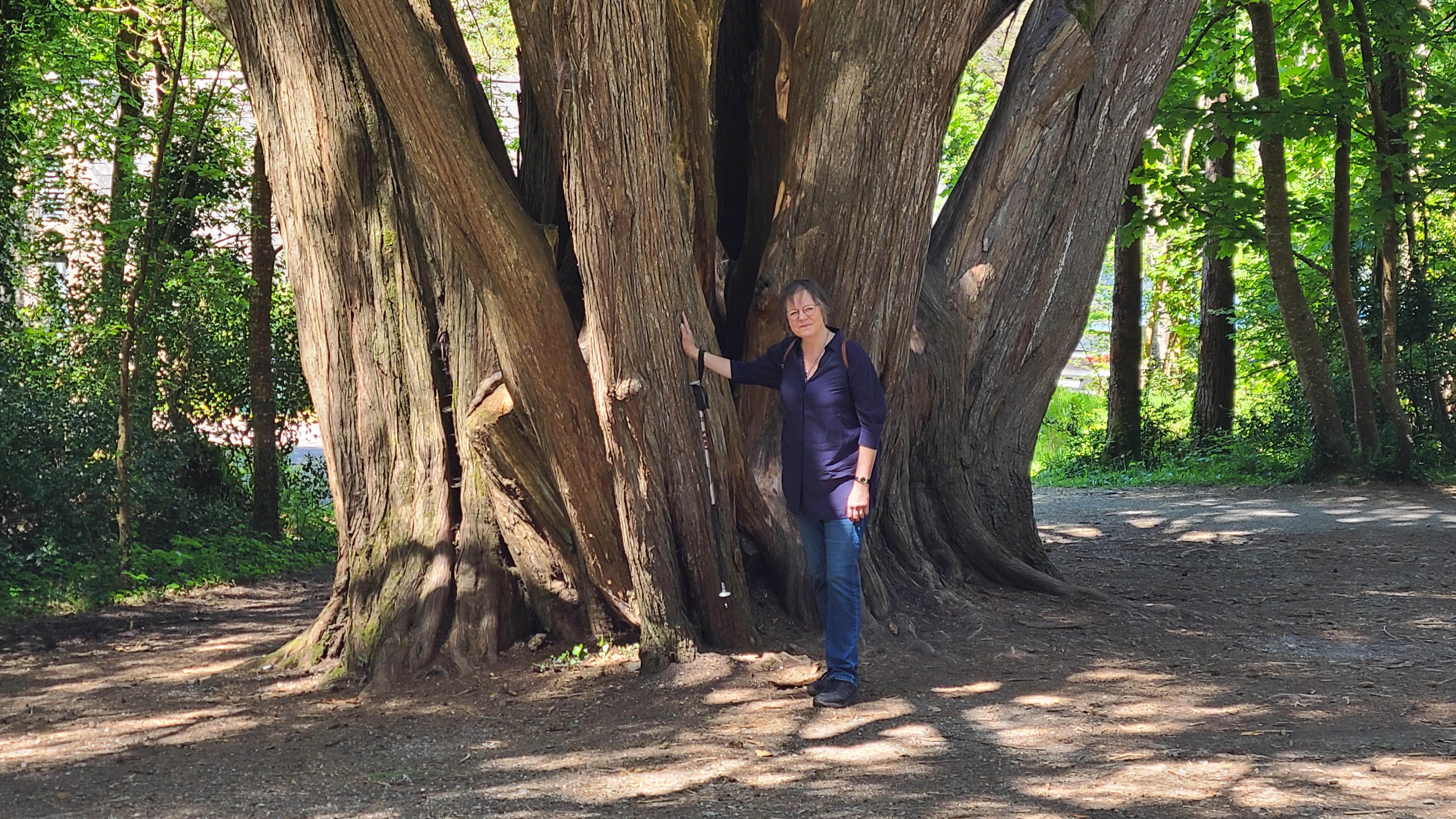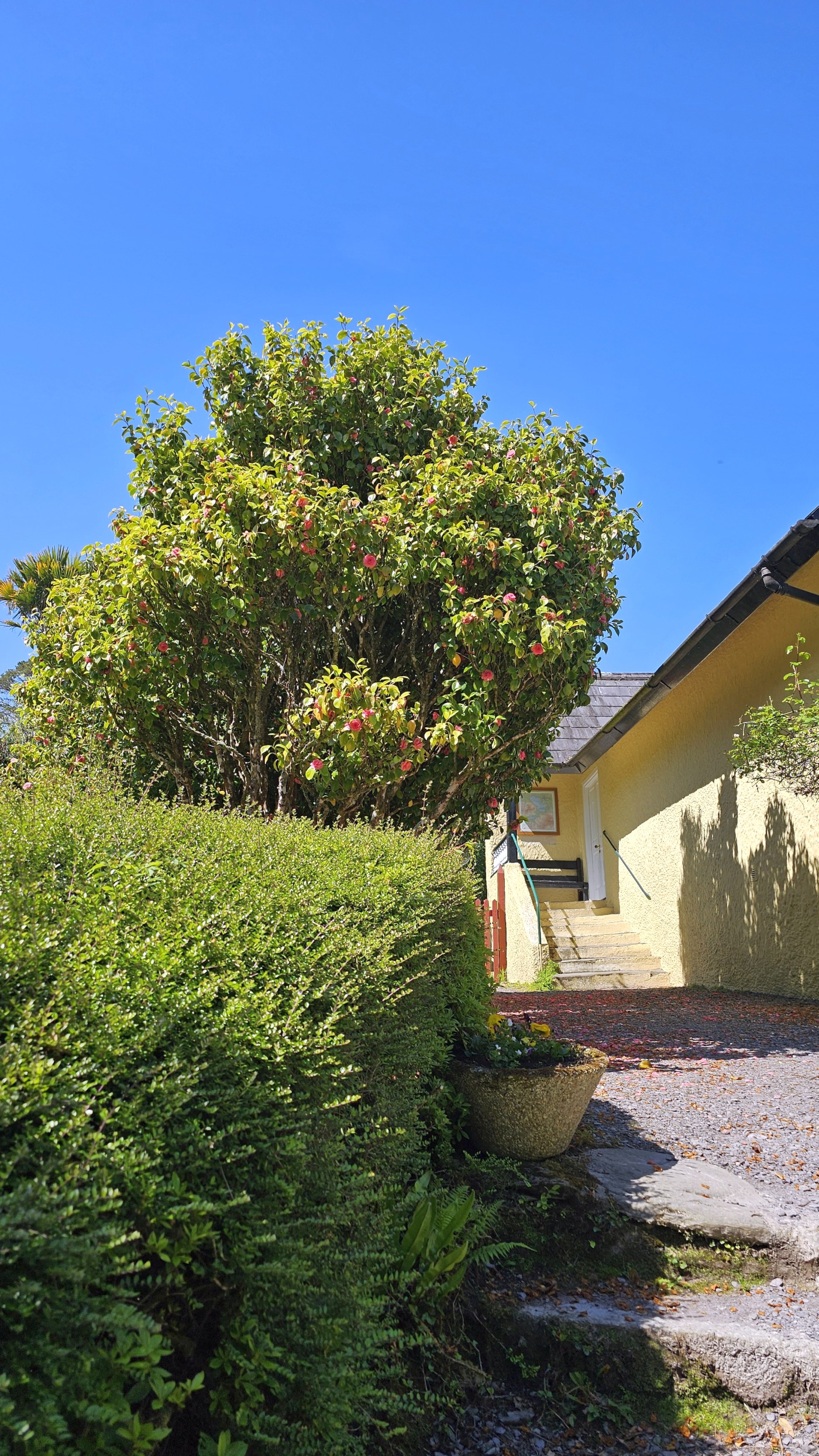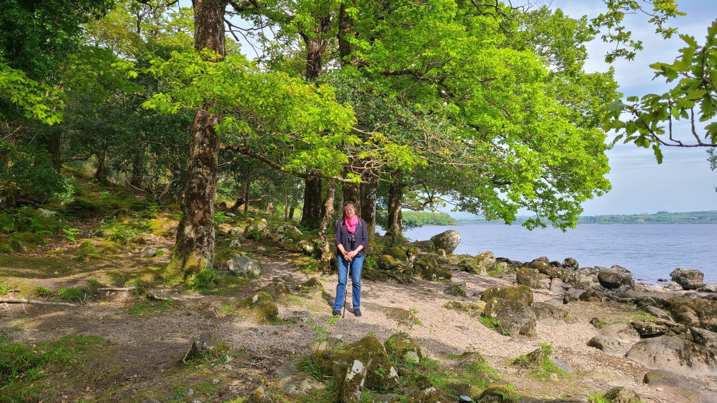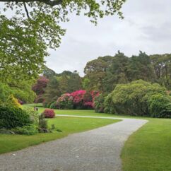 Heute starten wir beim Muckross House im Killarney National Park und wandern zehn Kilometer um den See herum. Ein Großteil des Weges führt durch den Wald mit Baumriesen von Kiefern, Eichen, Ilex, Lebensbäumen und Eiben, dazwischen wild wachsenden lila Rhododendren. Nach der Hälfte des Weges kommen wir an einem Cottage vorbei mit einem großen Kamelienbaum und Rhodendren in vielen verschiedenen Farben.