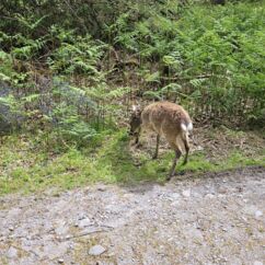 Zum Ende der Wanderung erleben wir nochmals eine sehr ungewöhnliche Begegnung mit einem jungen Reh. Zuerst stand es in der Ferne am Wegrand, dann konnten wir bis auf eineinhalb Meter herangehen, ohne dass es weglief und anschließend ging es sogar mit mir zusammen weiter den Weg hinunter.
