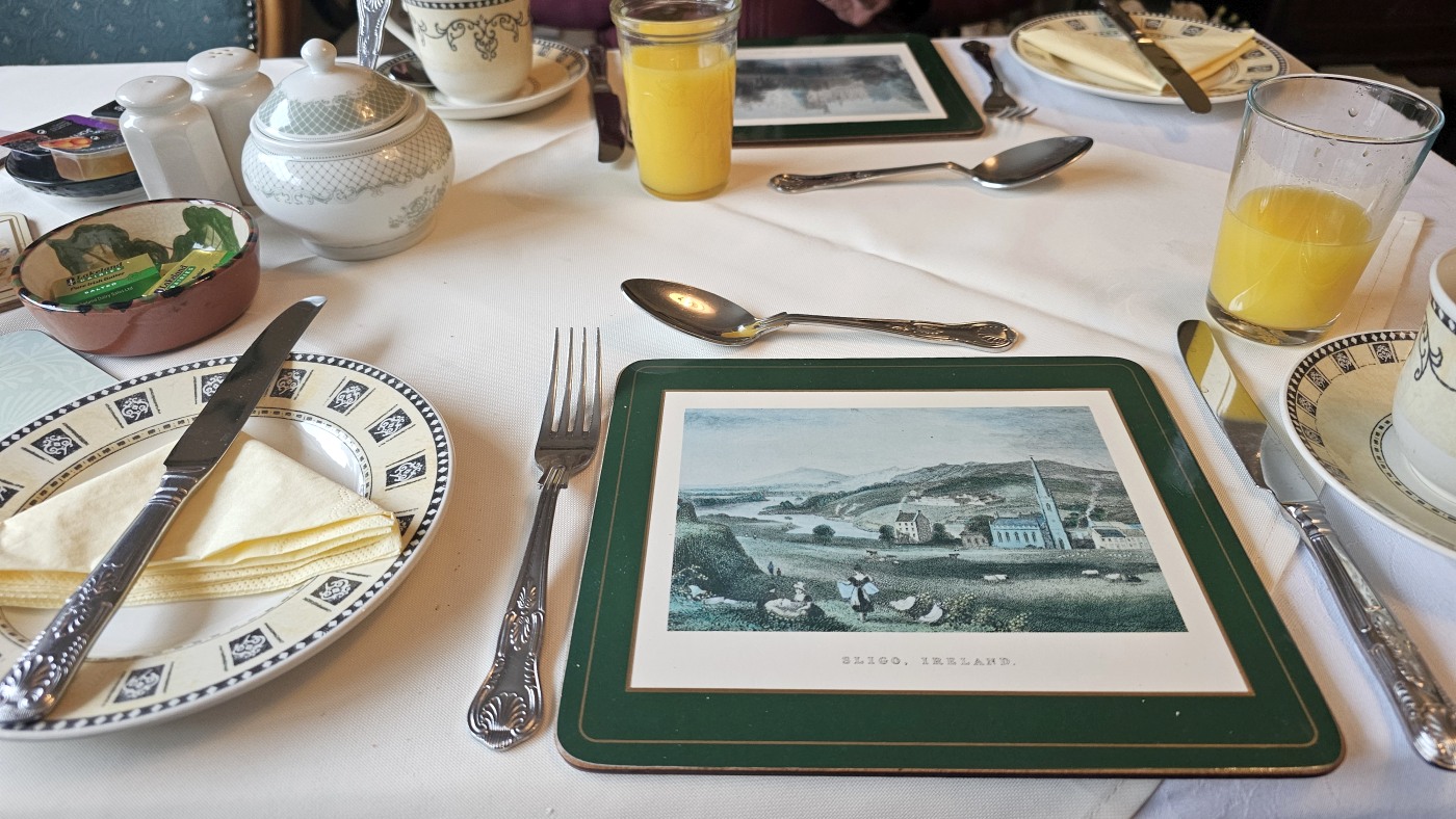 Heute morgen wartet das erste irische Frühstück auf uns. Naaajaaa. Bereits im Treppenhaus zog der Geruch von gebratenem Speck und Würstchen in unsere Nasen. Nicht so ganz unser Ding und morgens ganz gewiss nicht. Viel Auswahl verbleibt uns am Frühstücksbüfett nicht.