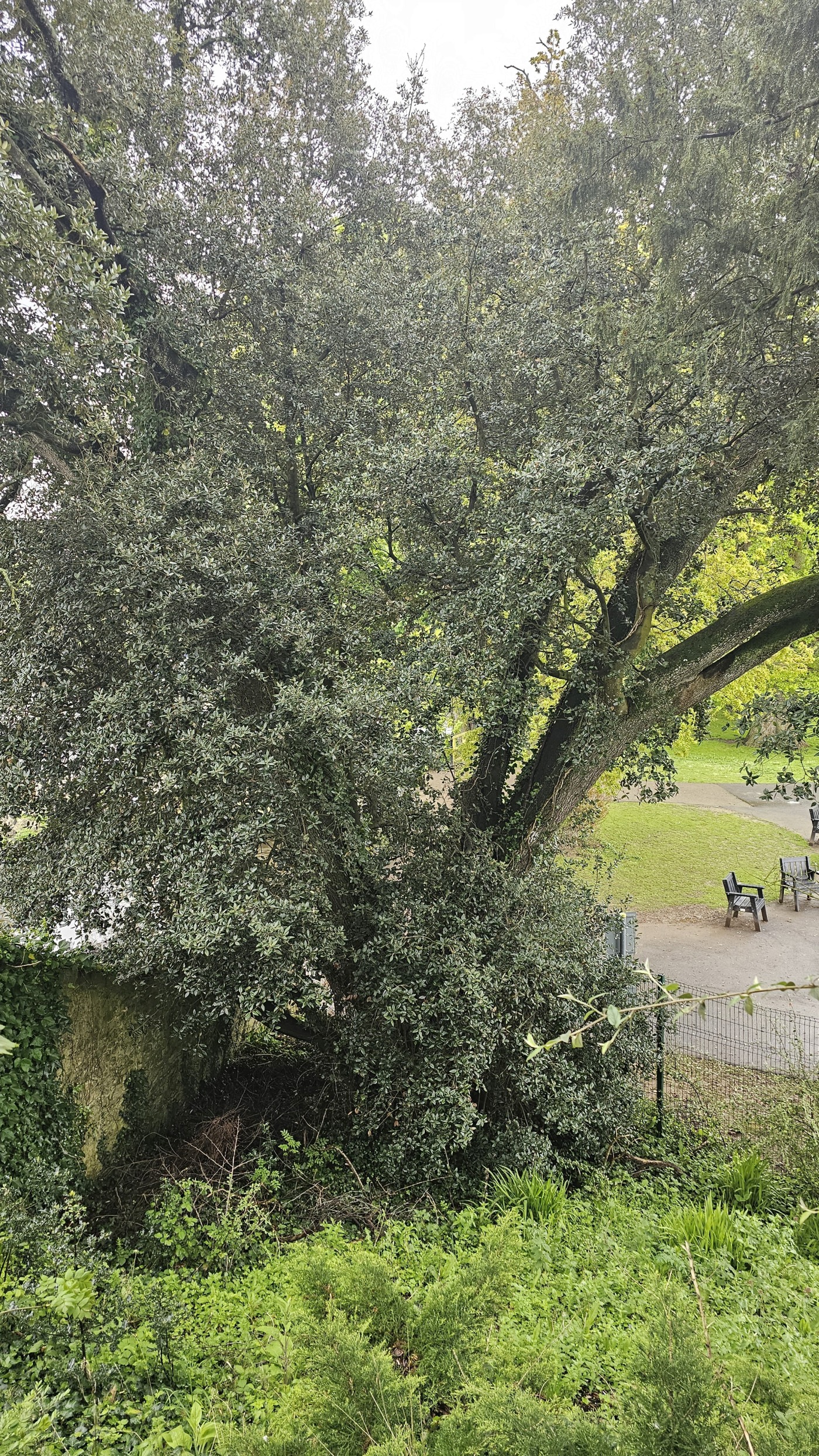 Bei Wiki schaue ich dann später nach: Die immergrüne Eiche ist eine englische Kreuzung aus Stieleiche und Steineiche, auch Turners Eiche genannt.