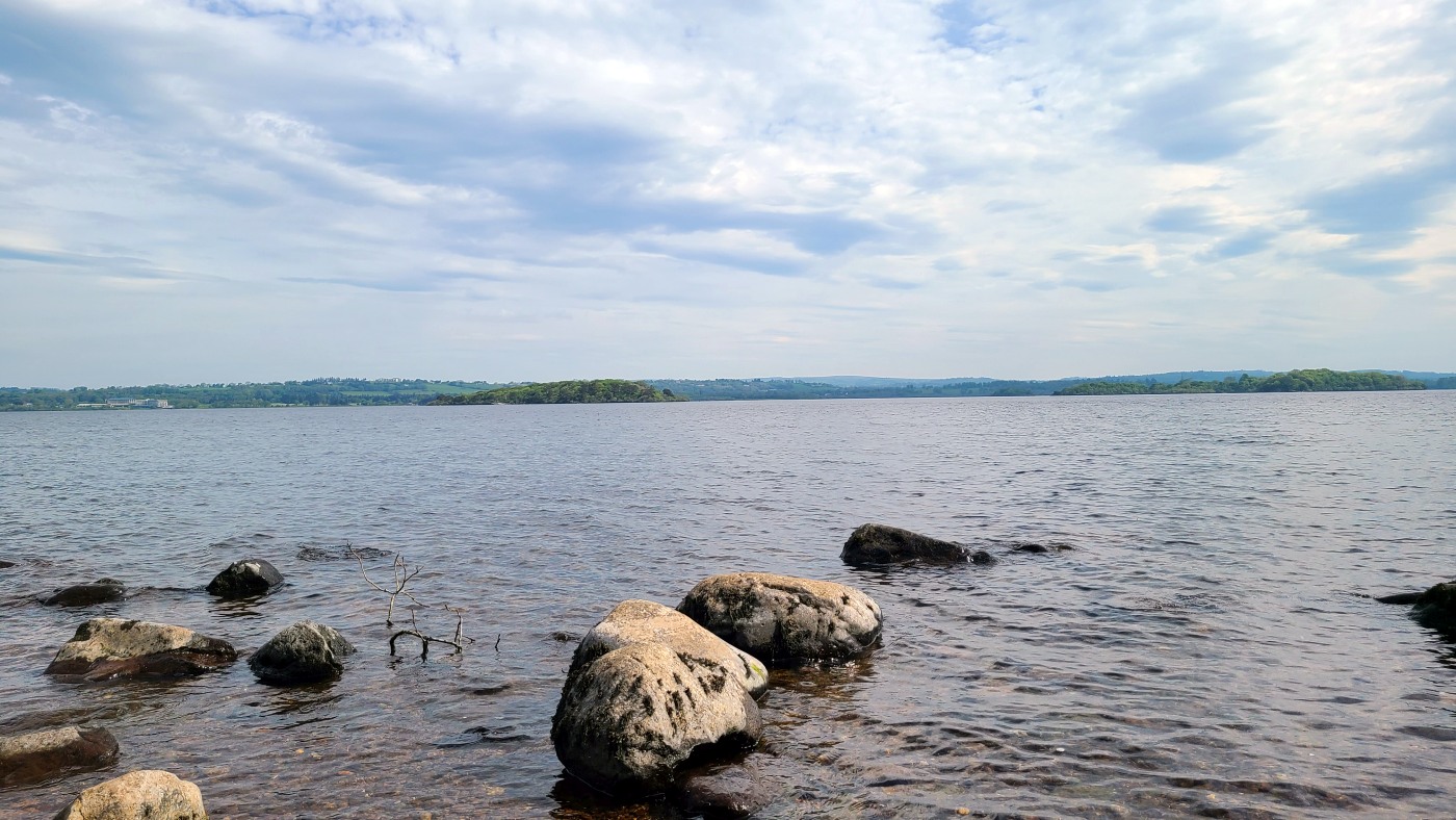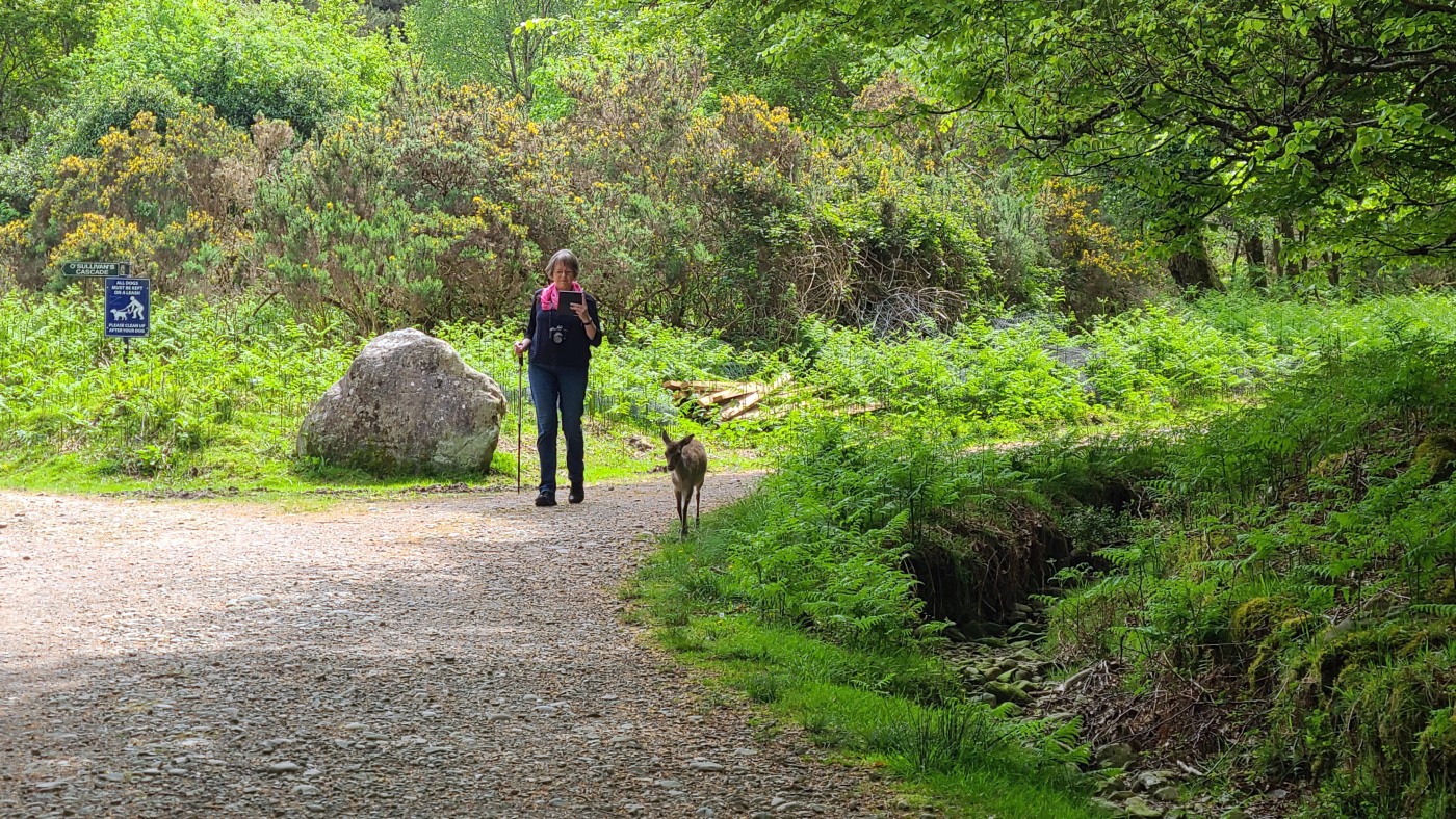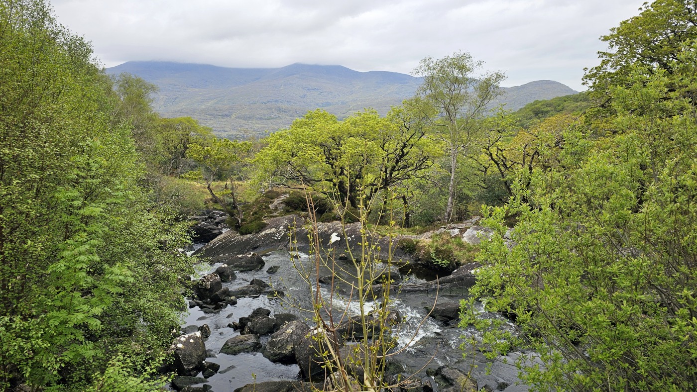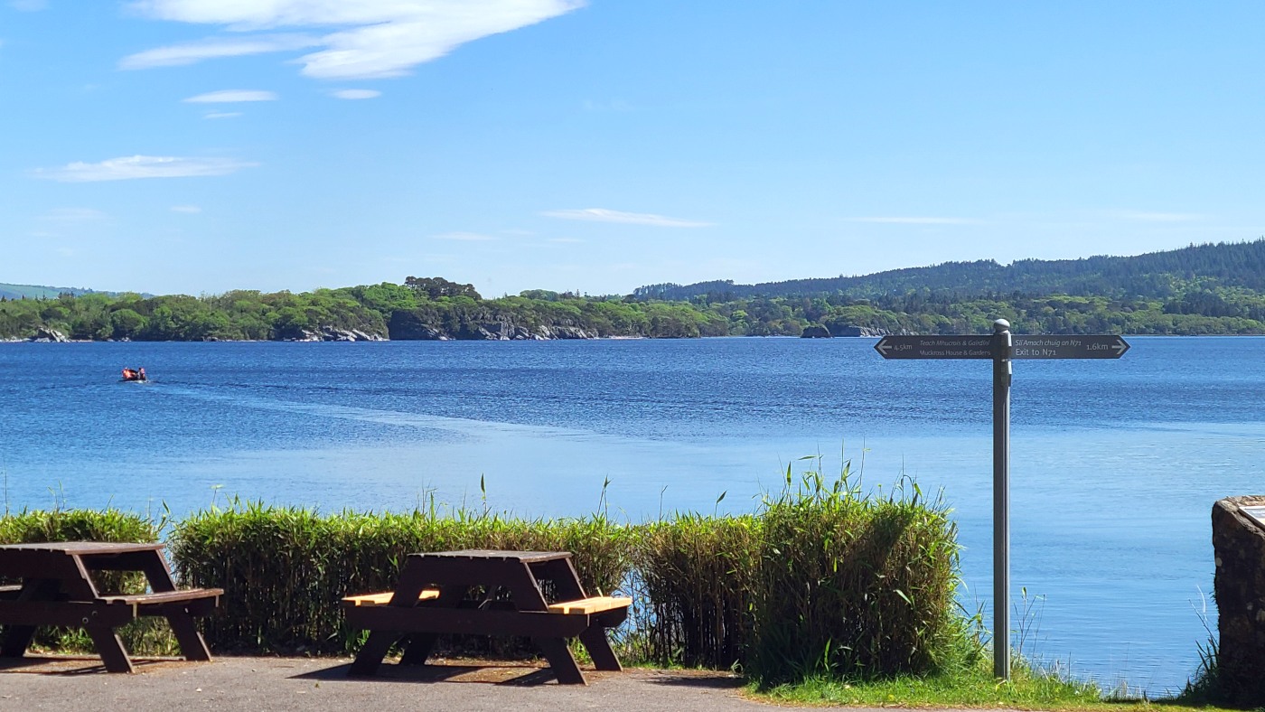 An einem Wasserlauf führt der Weg steil über viele Stufen zum Ufer des Sees herunter und wir können vom Ufer in der Ferne das Muckross House sehen, bei dem wir auf der Ring of Kerry-Tour angehalten hatten. Tja- und anschließend fällt mir nach einigen hundert Metern und etlichen Höhenmetern auf, dass ich mein Handy wohl am Ufer habe liegen lassen. Wir drehen sofort wieder um, Fritz telefoniert mit dem Finder, spurtet zurück und bald habe ich das Teil wieder in den Händen. Ähnliches war mir brreits beim Start in den Urlaub passiert. Wir standen in Berlin Kaulsdorf bereits an der Unterführung zur S-Bahn, als Sebastian mit dem Fahrrad abrupt neben uns bremste. Ich hatte es bereits dort schon das erste Mal bei Sebastian und Michéle vergessen.