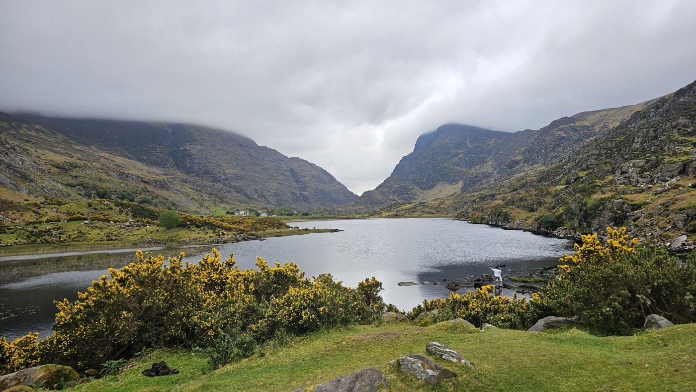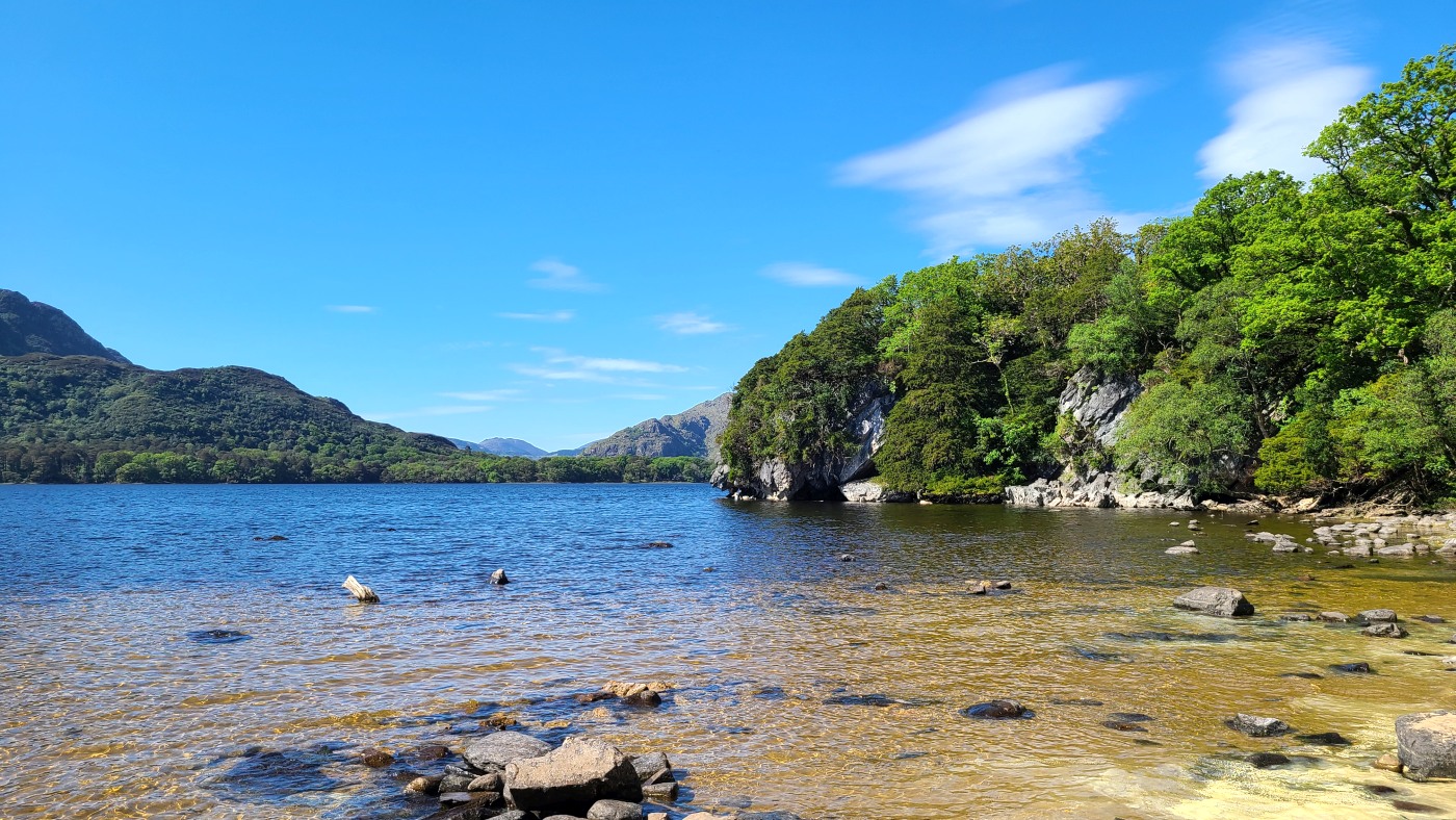 Ein Tipp von Ellie ist der Aussichtspunkt Gap of Dunloe, Startpunkt für mehrere Wanderrouten. Wir treffen dort auf dem Weg zu einem See einen Iren in Begleitung einer Polin, erhalten noch mehr gute Tipps und fotografieren die eindrucksvolle Landschaft, zuletzt mit einem Brautpaar in weiter Ferne, die als kleine weiße Punkte am Seeufer aus der Landschaft herausleuchten.