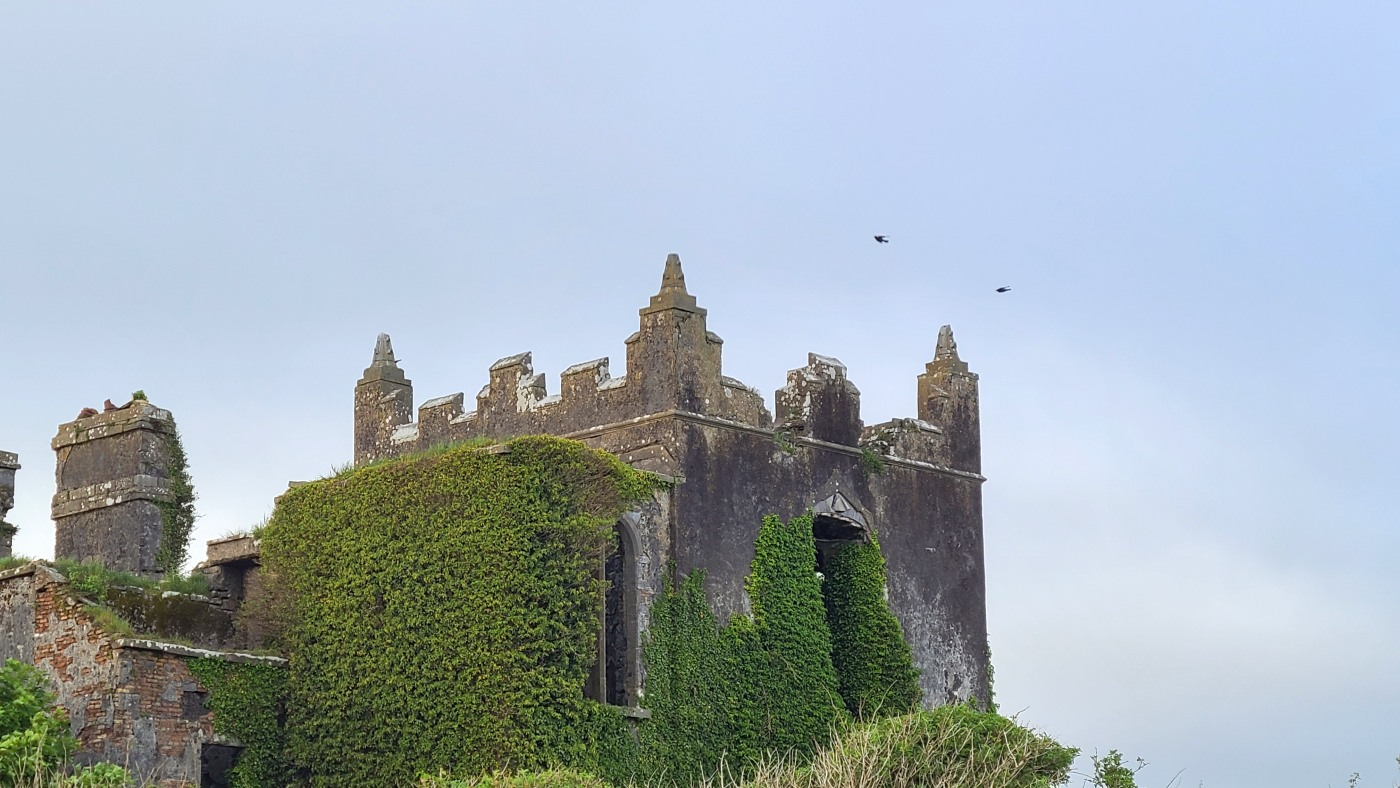 Abends machen wir einen Spaziergang zu einer verfallenen Burgruine, die wir von unserem Häuschen aus in der Ferne sehen. Leider verbietet ein Schild das Betreten des Geländes. Und so sehen wir nur von der Straße auf die kreisenden Krähen und Mauerreste, die vom Efeu fast überwuchert sind. Würde es hier spuken - es würde uns nicht wundern ;)