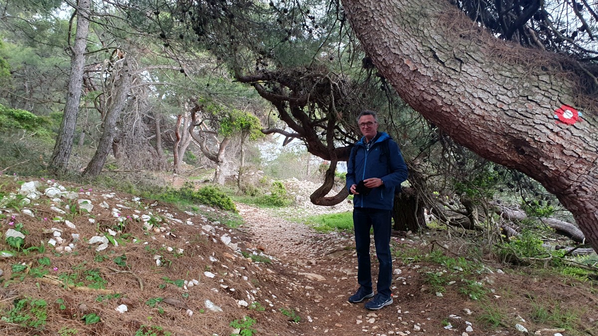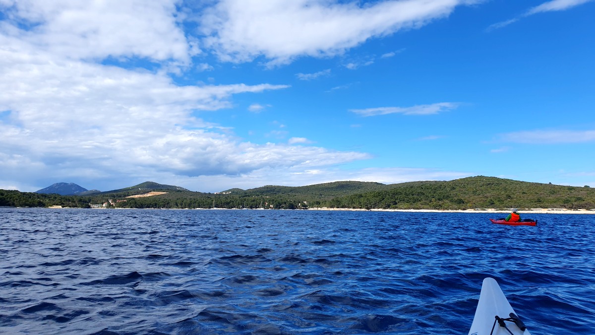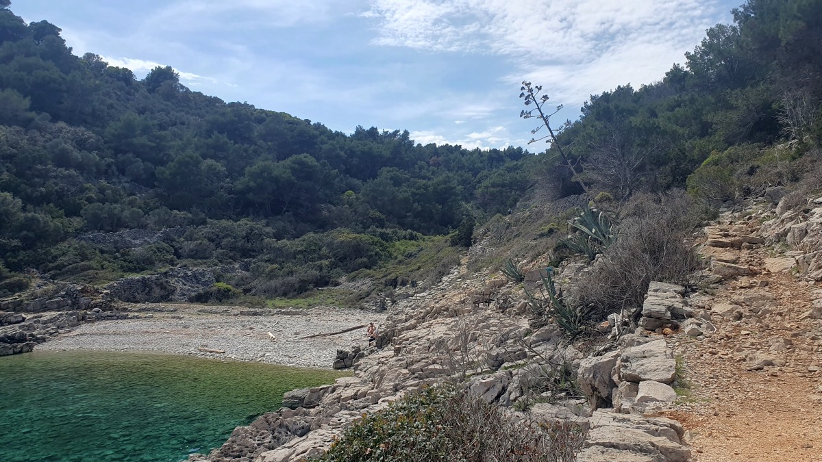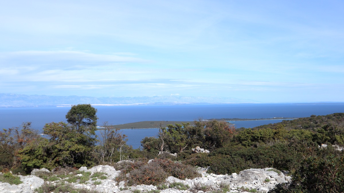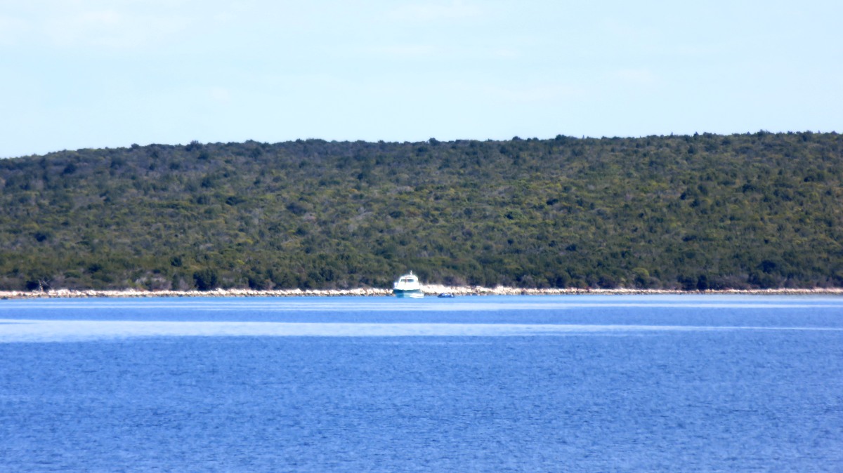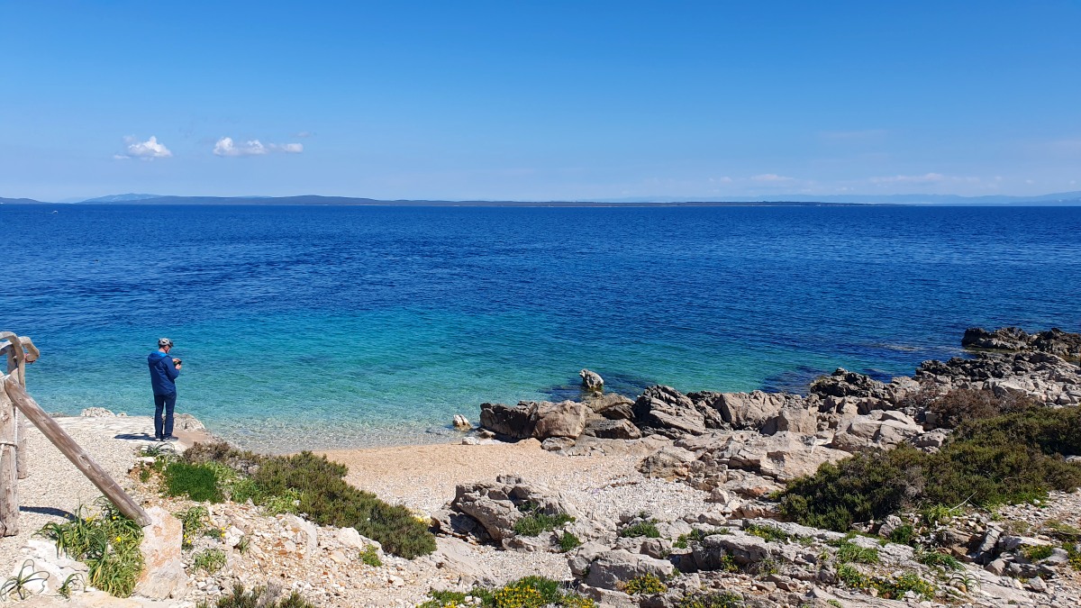 Direkt vor der Küste beginnt das Gebiet der Delfine, das sich bis zur Südspitze erstreckt. In der Hoffnung auf eine Einsatzmöglichkeit für unsere Kajaks gehen wir den Küstenweg ein Stück entlang, doch fündig werden wir nicht. Dieser Weg verläuft direkt an der Küste, vorbei an langgestreckten Pinienwäldern. Er ist so schön, dass wir ihn morgen von Mali Lošinj aus mit dem Rad befahren werden.