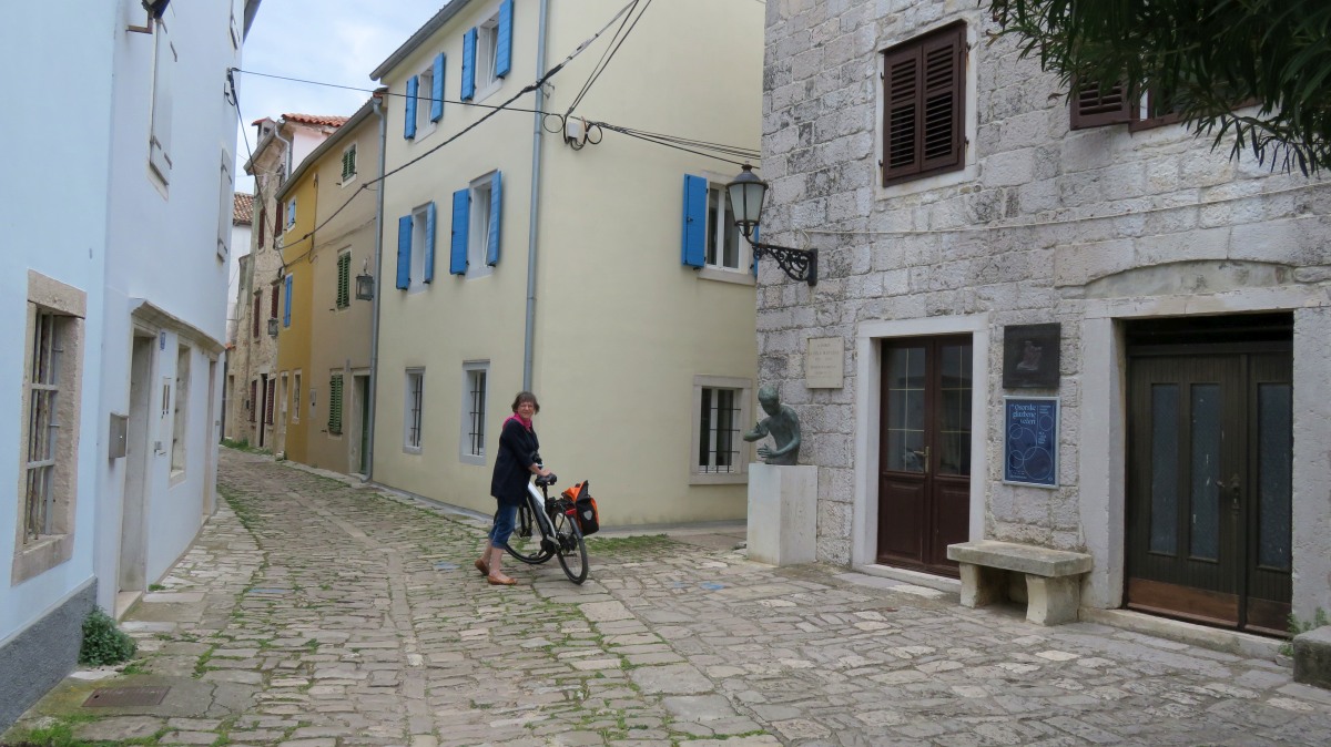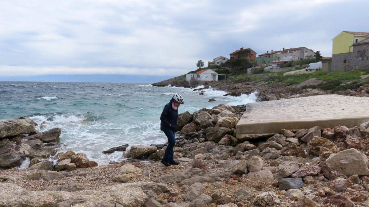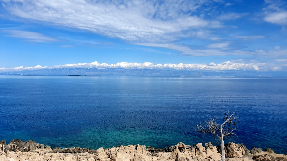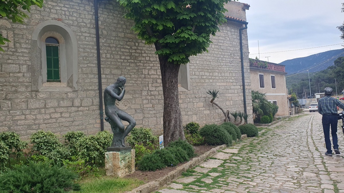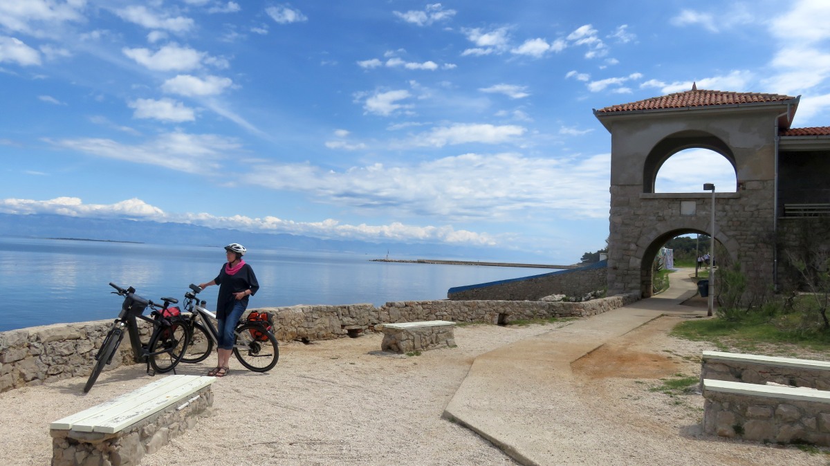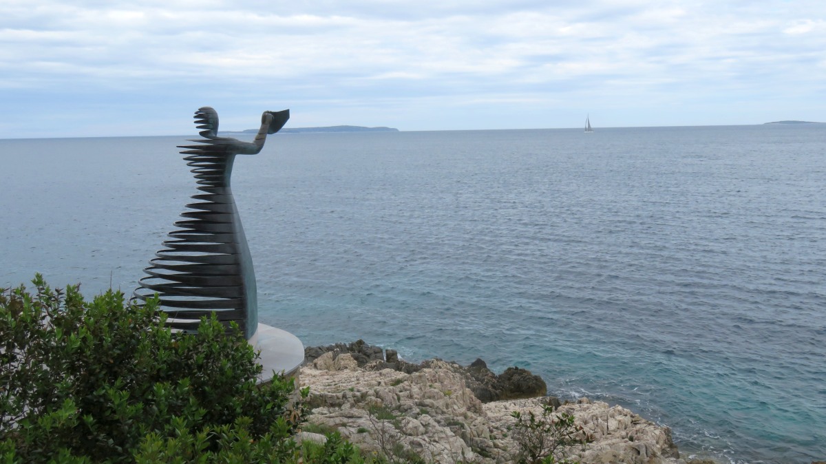 Heute waren zumindest die Wolken verschwunden, so dass wir den ganzen Tag mit dem Rad unterwegs sein konnten. Der starke Wind hat auf Ost gedreht, Mali Lošinj und Halbinsel Cikat waren also recht ruhig zu befahren. Wir fahren durch Pinienwälder, vorbei an einem großen Campingplatz, einer sehr beeindruckenden Skulptur, einfachen Strandbistros und Luxusvillen.