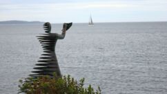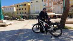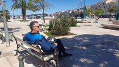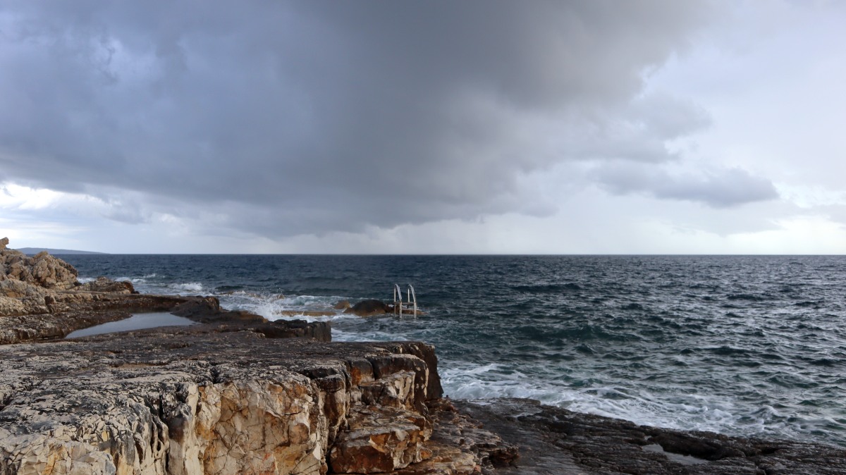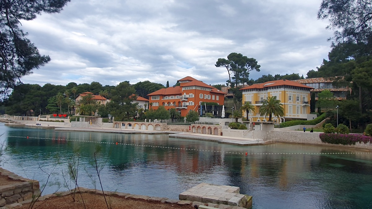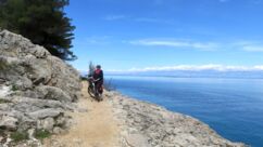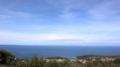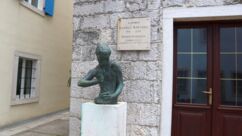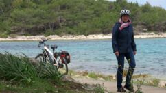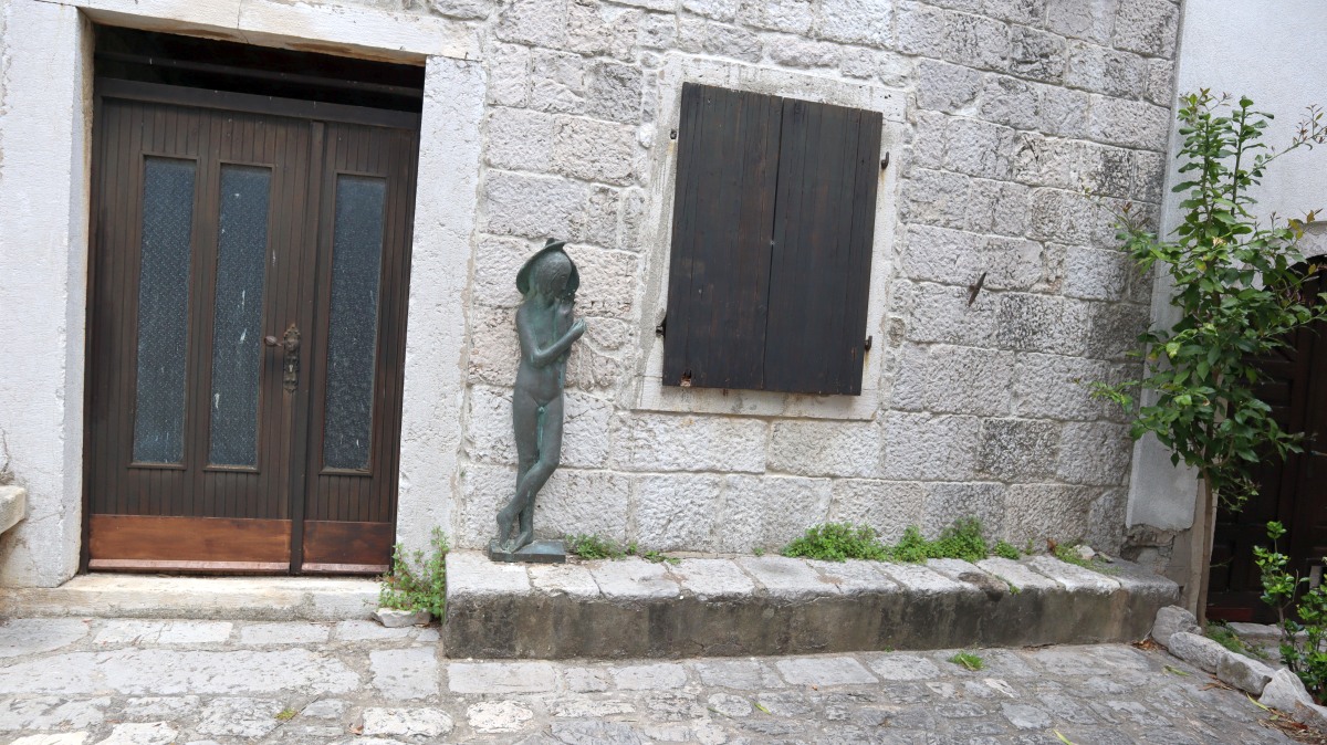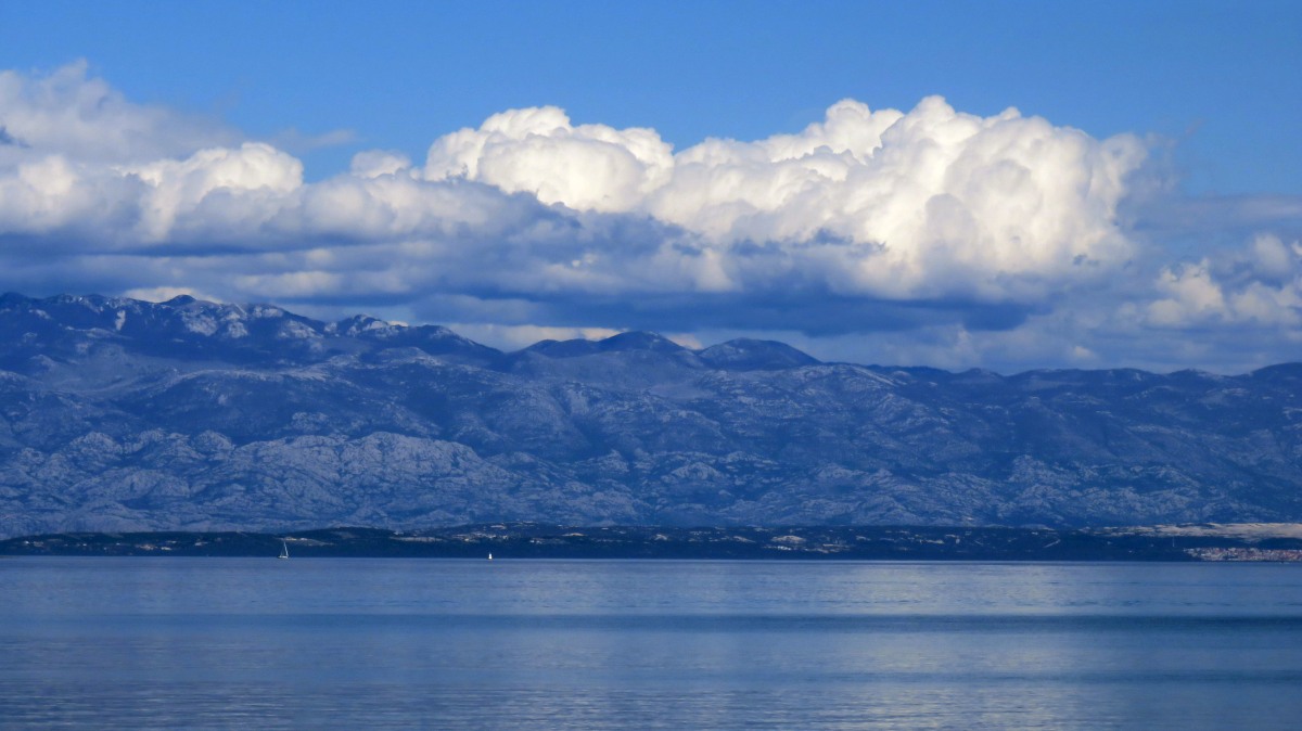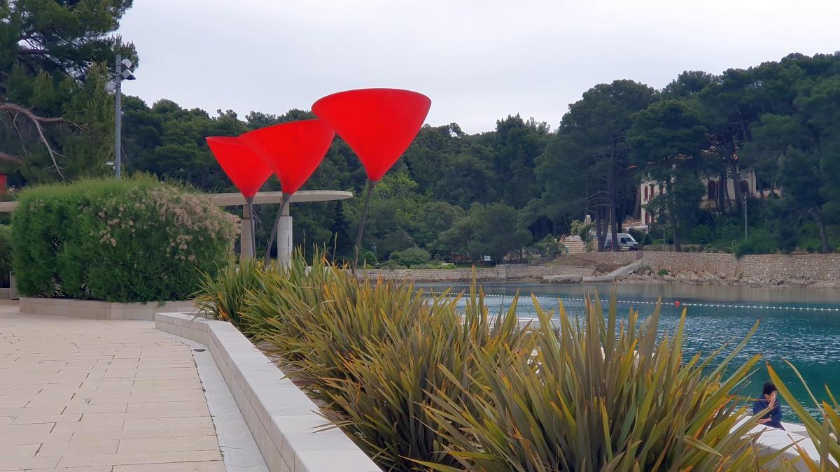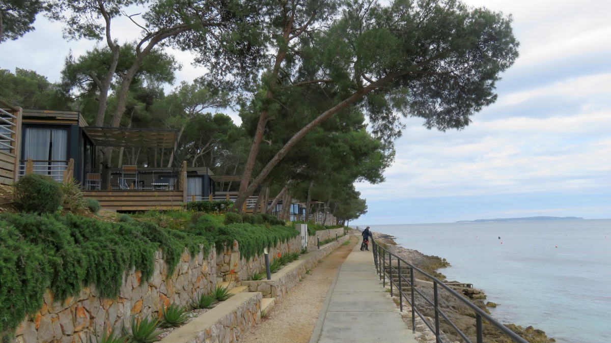 Heute waren zumindest die Wolken verschwunden, so dass wir den ganzen Tag mit dem Rad unterwegs sein konnten. Der starke Wind hat auf Ost gedreht, Mali Lošinj und Halbinsel Cikat waren also recht ruhig zu befahren. Wir fahren durch Pinienwälder, vorbei an einem großen Campingplatz, einer sehr beeindruckenden Skulptur, einfachen Strandbistros und Luxusvillen.