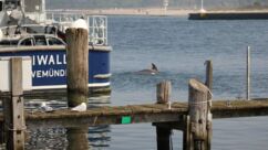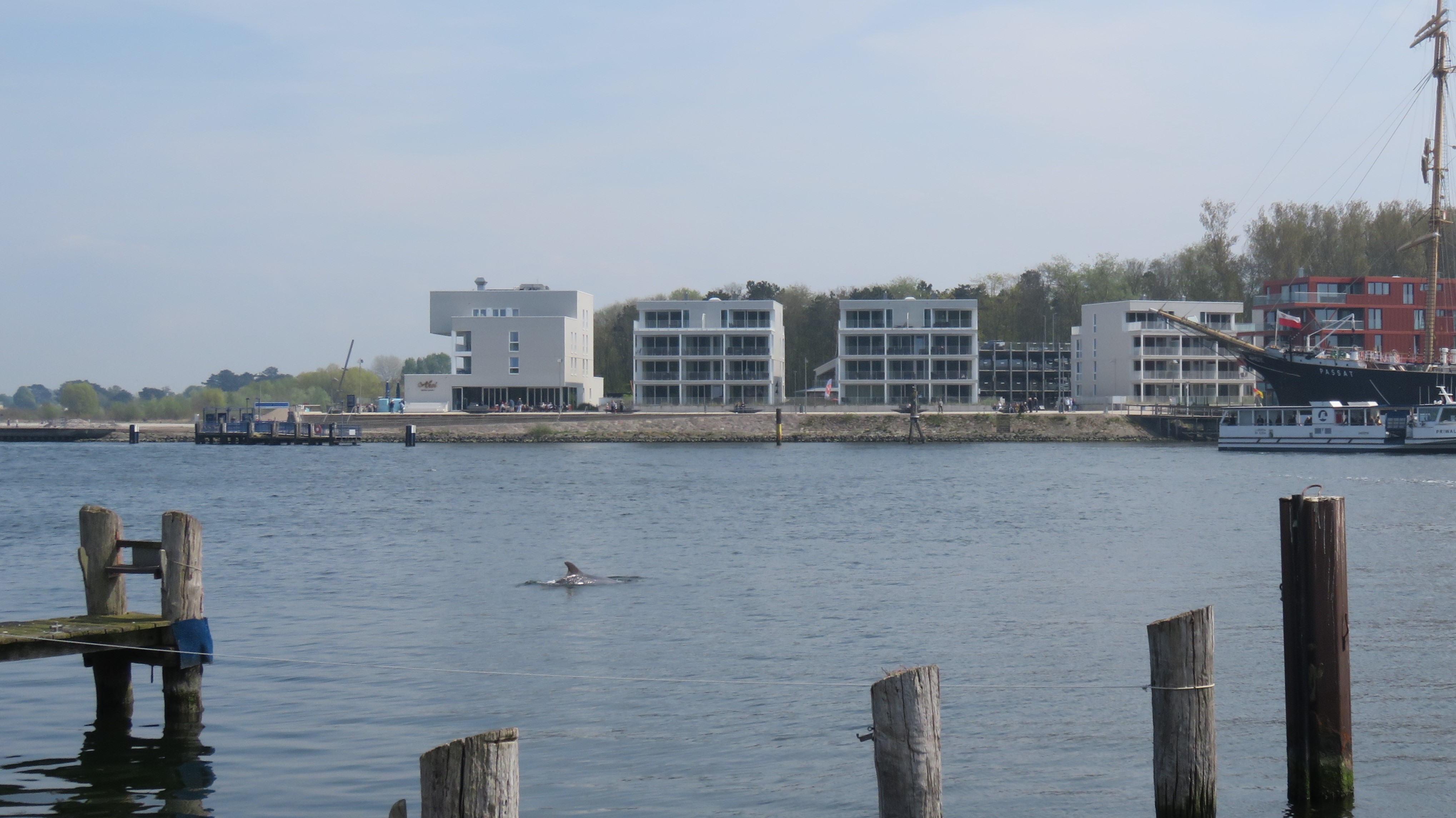 Einen Delfin sehen wir auch. Leider nur auf dem Smartphone. Ein Freund schickt eine SMS mit der Nachricht, dass in Travemünde ein Delfin mit anschaulichen Sprüngen auf sich aufmerksam macht: https://www1.wdr.de/nachrichten/delfin-travemuende-besuch-100.html