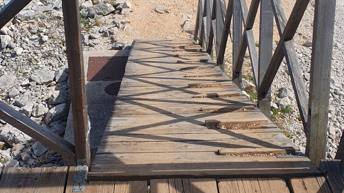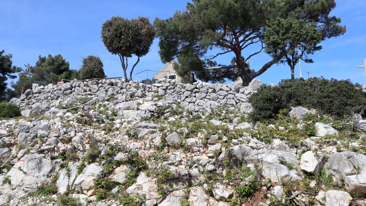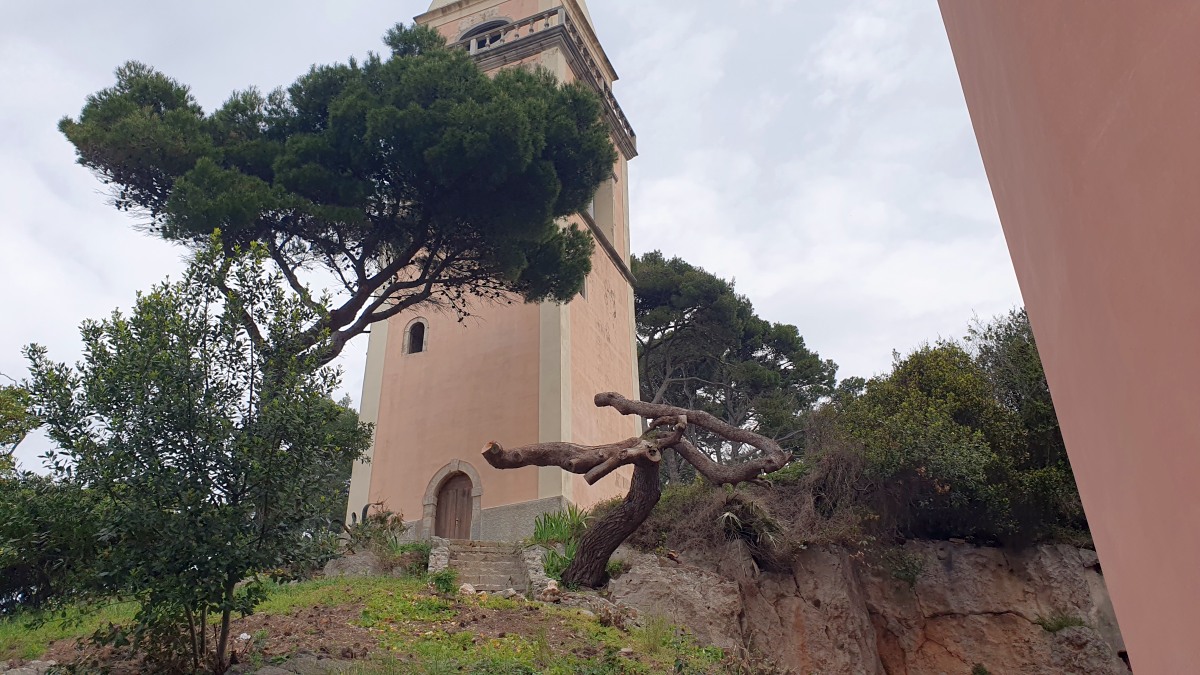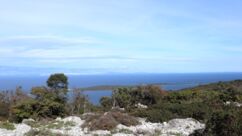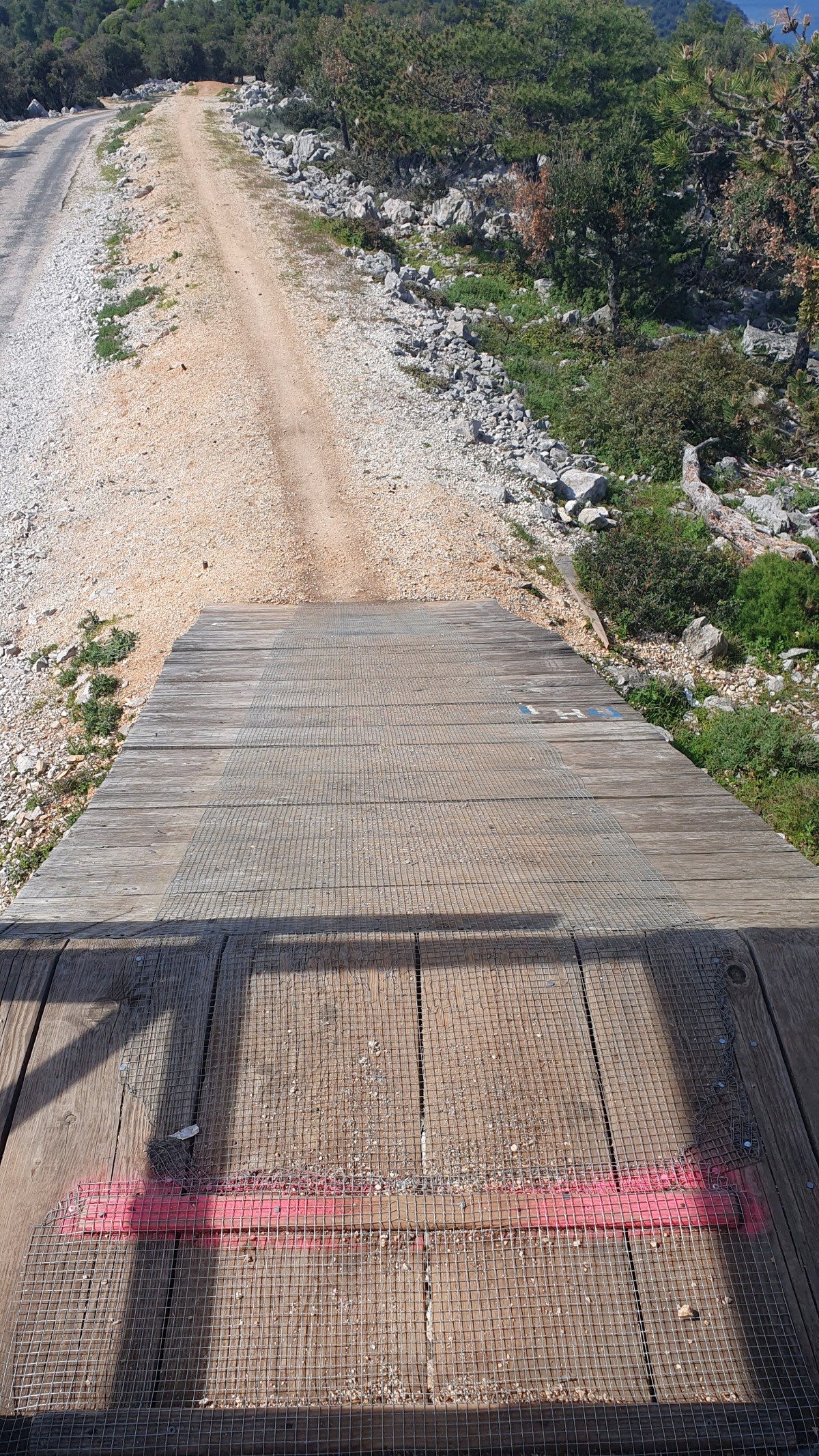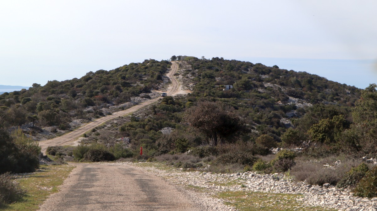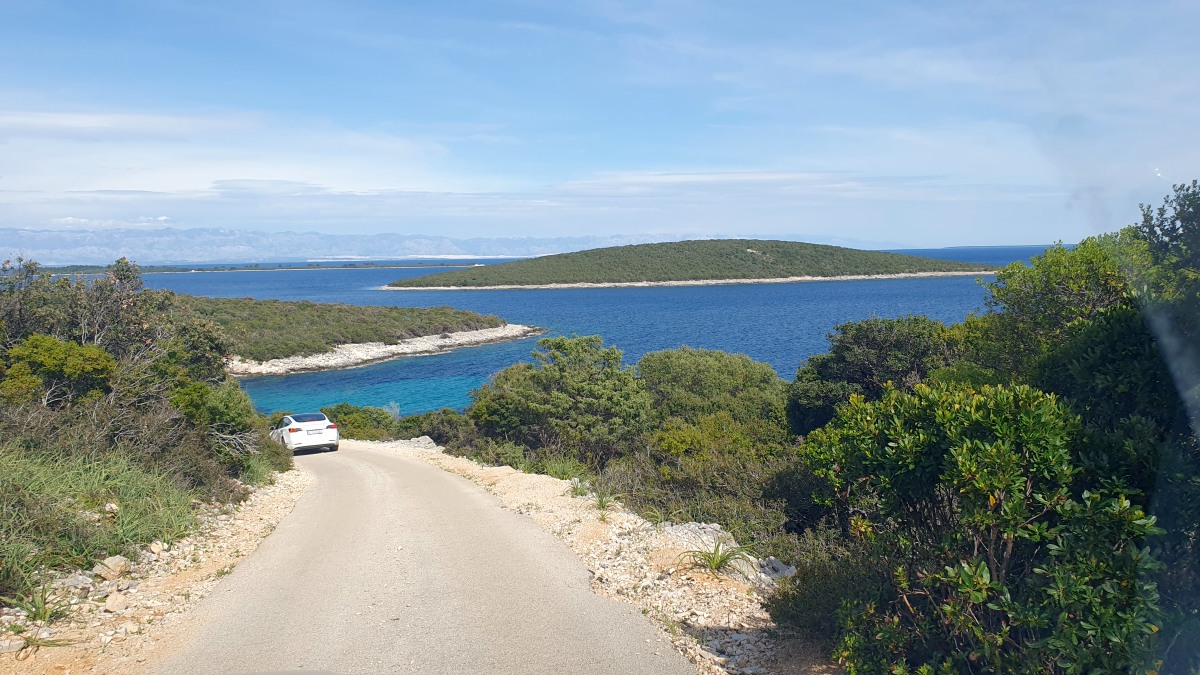 Eine einzige Straße führt von Mali Lošinj bis zur Südspitze der Insel. Der Weg ist sehr malerisch und bietet schöne Rundum-Aussichten bis zum Festland mit der hohen Gebirgskette und den Gletscherspitzen. Eine kleine Kirche ist Ausflugsziel, ebenso ein - noch geschlossenes - Restaurant und eine Aufsichtsplattform mit Gehrampen, wie wir sie noch nie gesehen haben... . Die schmale s.g. Hauptstraße ist sehr abenterlich und bietet meist nur eineinhalb Autos Platz, so dass sich begegnende Wagen nur durch Ausweichen und meist Anhalten eines Autos aneinander vorbeischlängeln können. Zum Ende dann extrem steile Serpentinen mit heftigen Schlaglöchern. Ich mag solche steilen Hänge ja gar nicht! Aufpassen muss man auch auf die Tiere. Ein Mutterschaf säugte tatsächlich mitten auf der Straße ihre Lämmer.