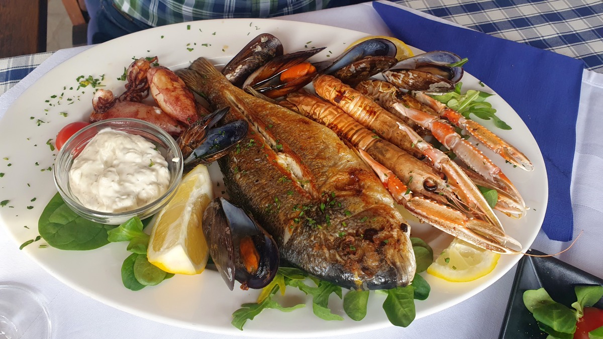 Am heutigen Montag hat es geregnet. So haben wir auf dem Fischmarkt in Mali Lošinj für wenig Geld Jacobsmuscheln, Garnelen und Krebse erstanden und uns eine Fischpfanne mit Spaghetti und Pesto zubereitet.