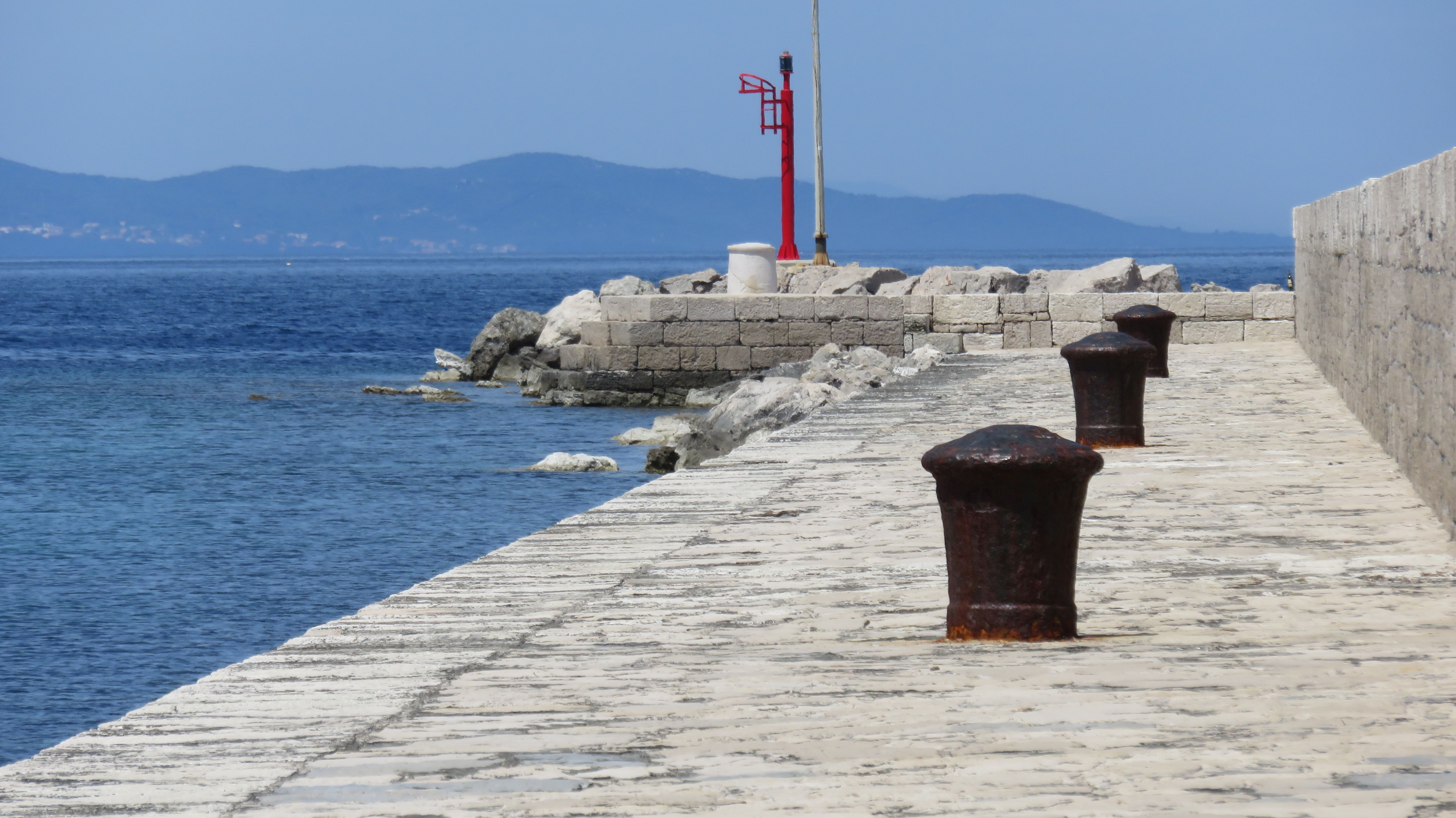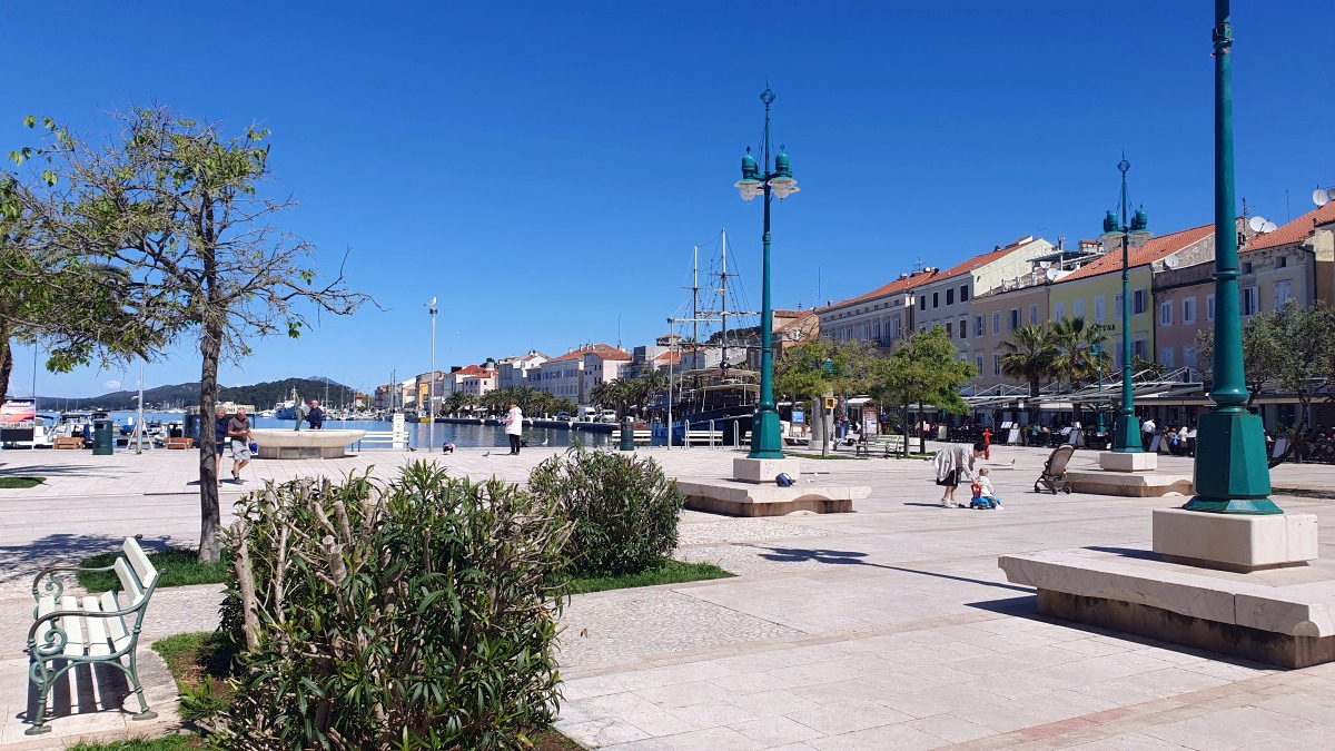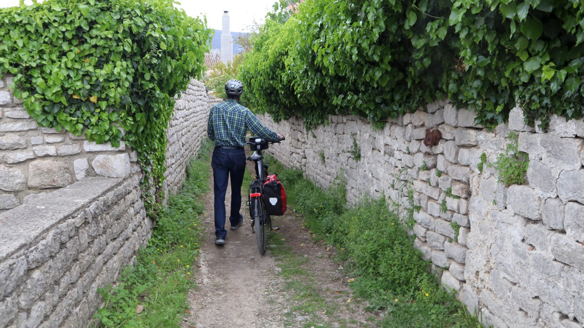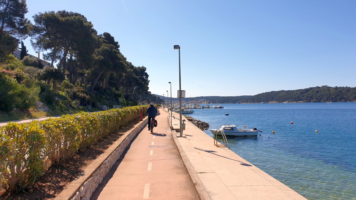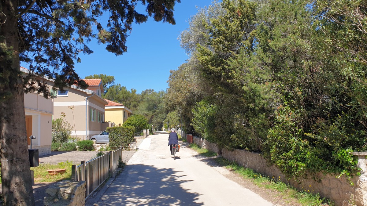 Die Straßen und Radwege sind entweder neu & perfekt oder alt, sehr steinig & holperig. Radwege sind oft nicht durchgehend an den Straßen vorhanden und da an der Hauptstraße nur wenig Fußgänger unterwegs sind, fahren wir oft auf dem Gehweg. Inzwischen kennen wir auch die wenigen Absenkungen der sehr hohen Bordsteinkanten und schlängeln uns sozusagen routiniert nach Mali Lošinj.