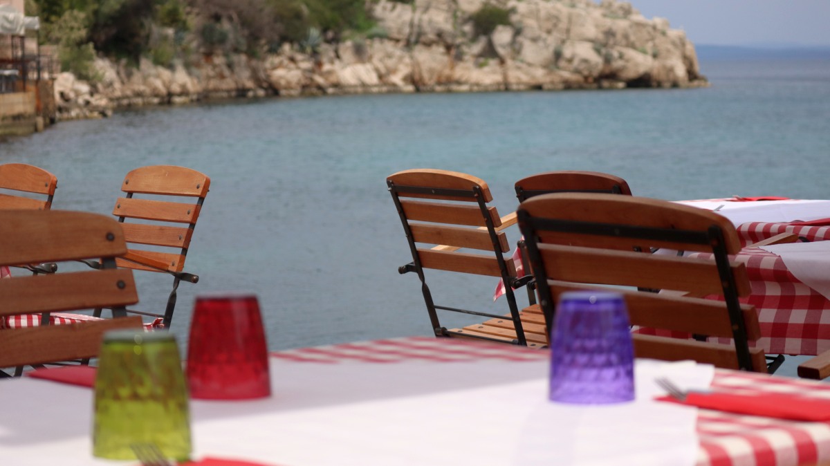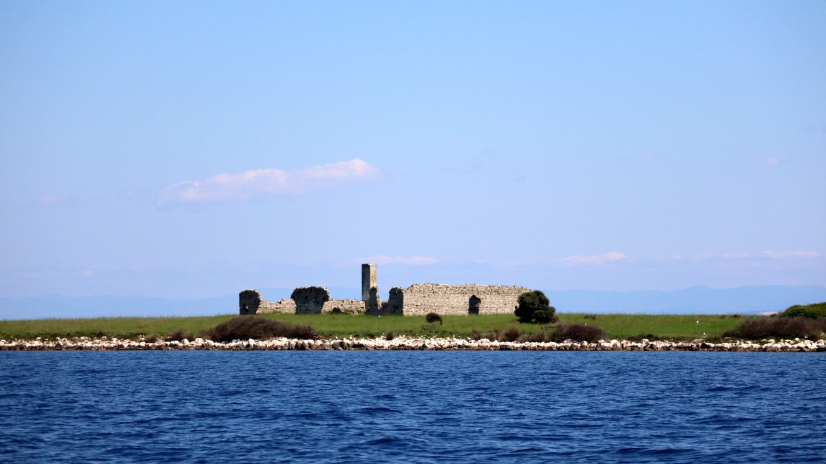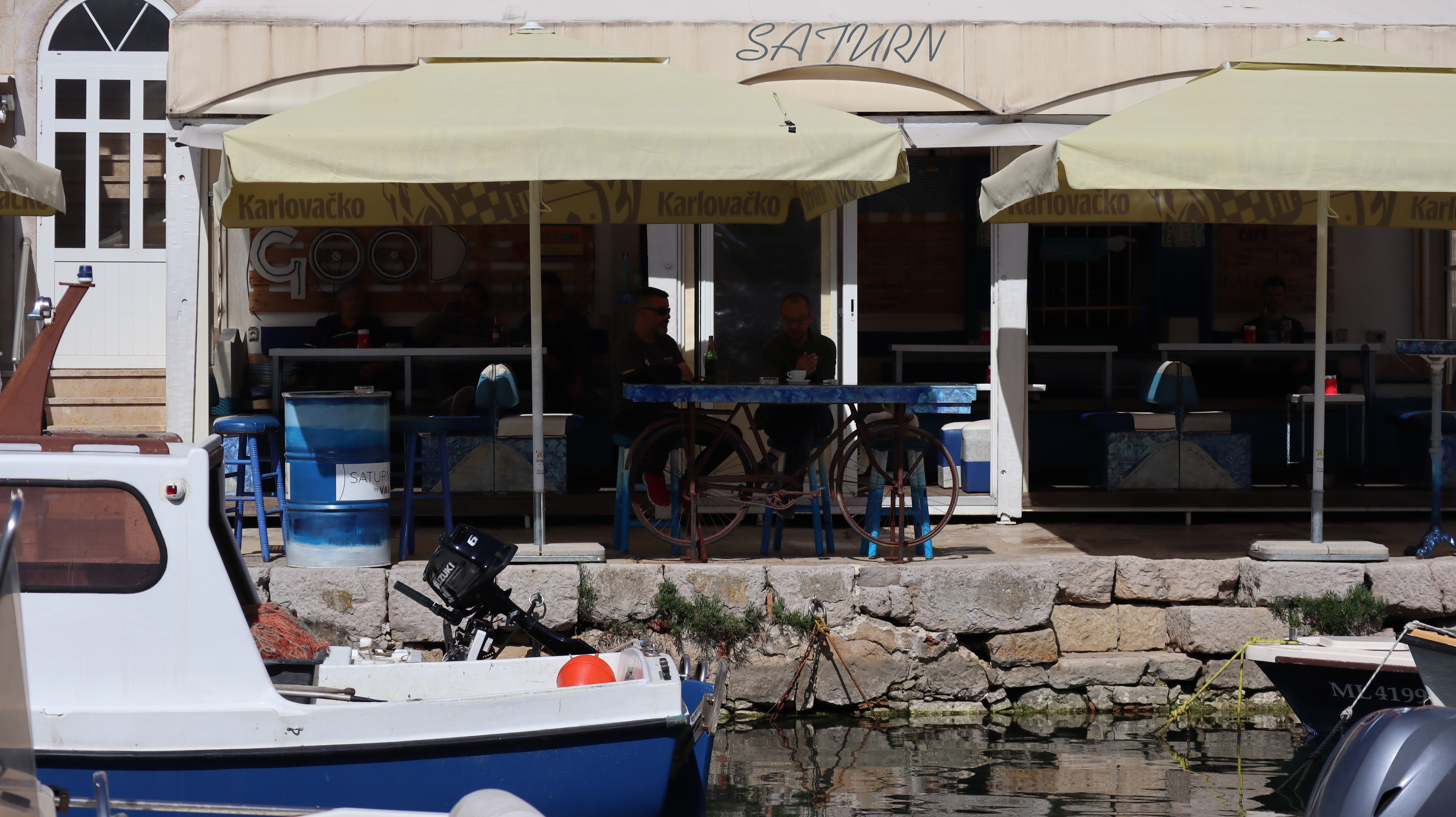 Heute ist Radlertag und wir steuern als erstes den kleinen Hafen bei der Kirche des Heiligen St. Martin an, den wir gestern nachmittag entdeckt hatten. Luca Sveti Martin ist sein Name, alles sieht ein wenig unordentlich aus, aber das kleine Kneipenbistro ist bereits wieder gut gefüllt