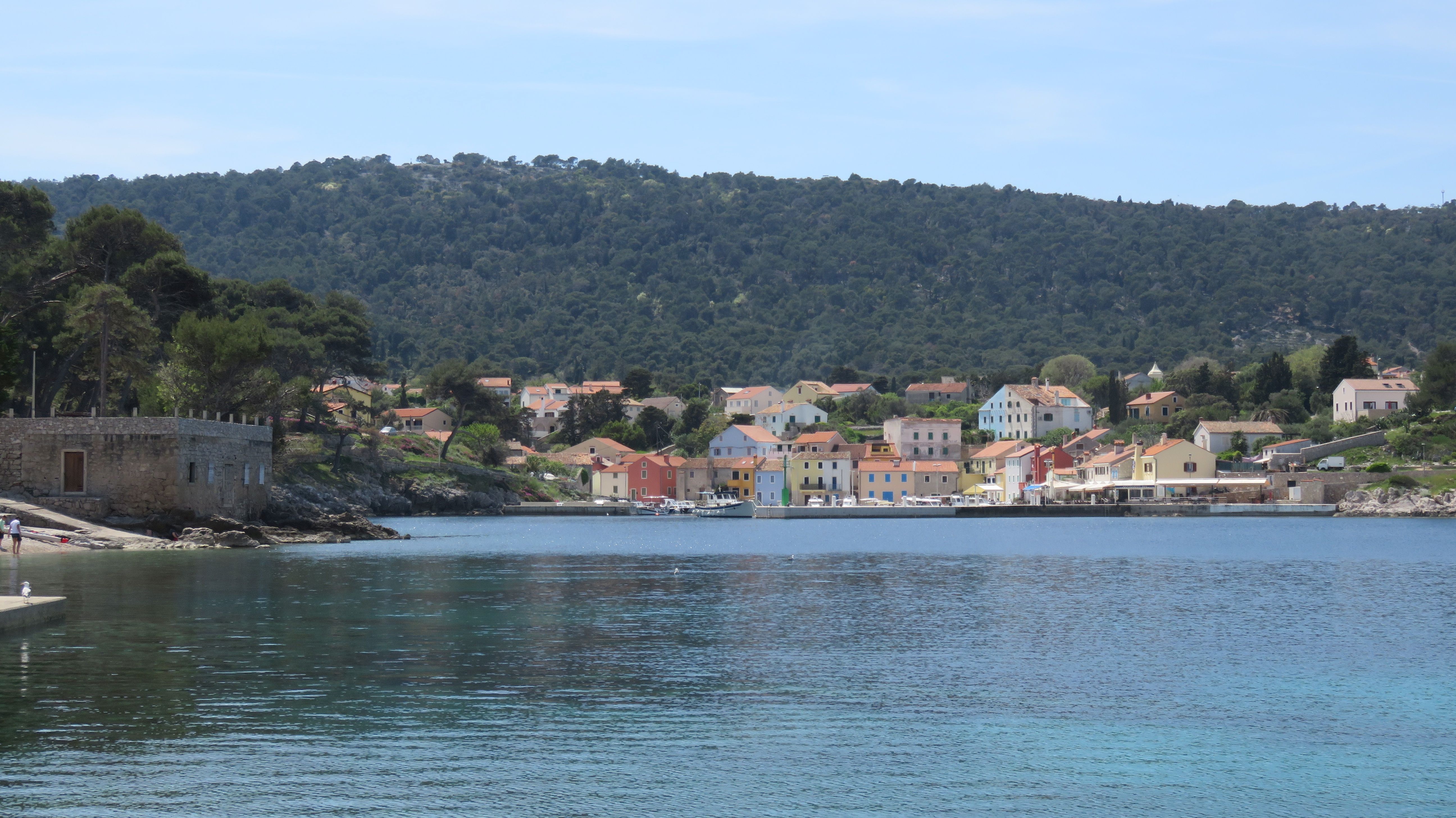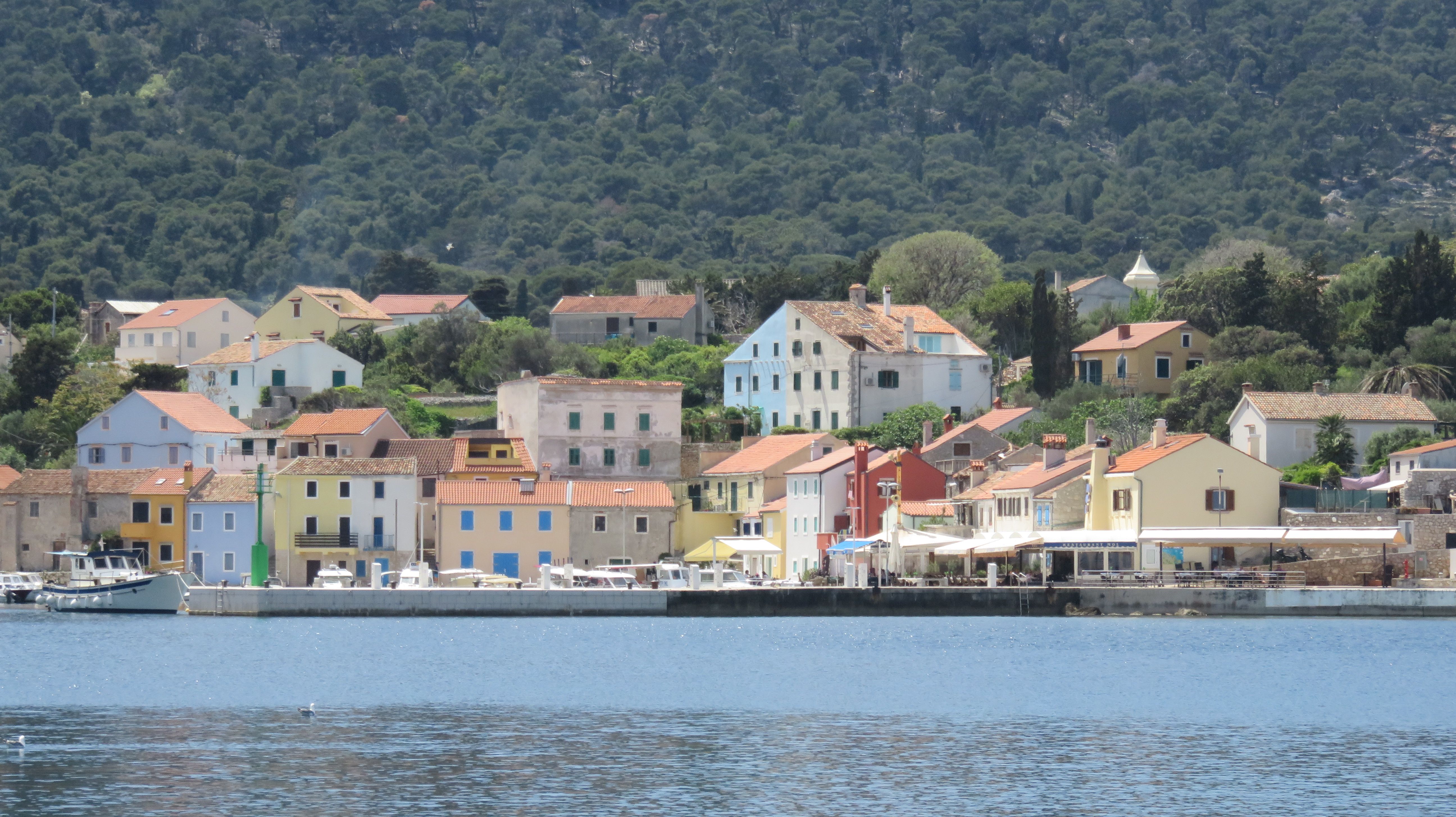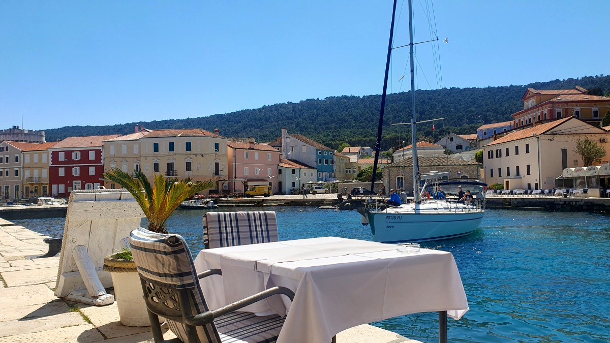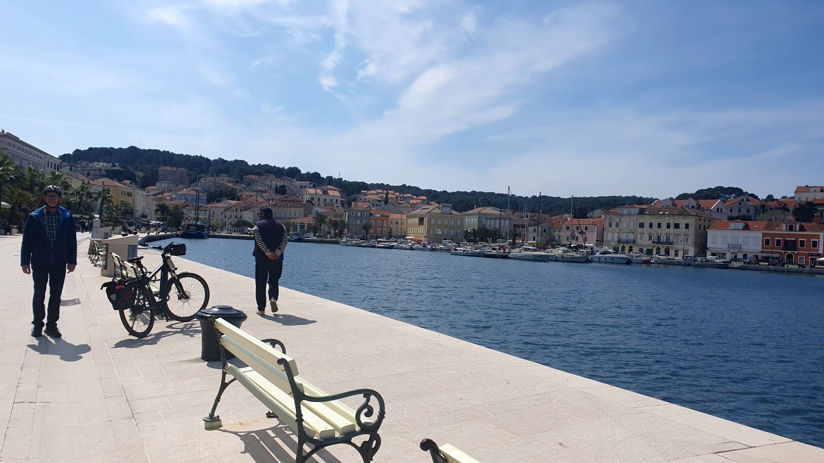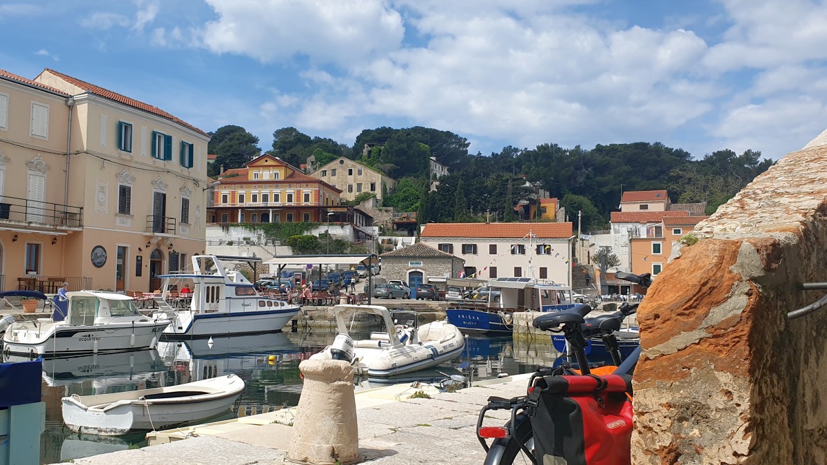 Am Sonntag erkunden wir Ort und Umgebung mit dem Rad. Mali Lošinj und Hafen bieten das typische Mittelmeerflair, einen leckeren Fischteller, sehr guten regionalen Weißwein von der Nachbarinsel Krk und ebenso gutes Wetter.