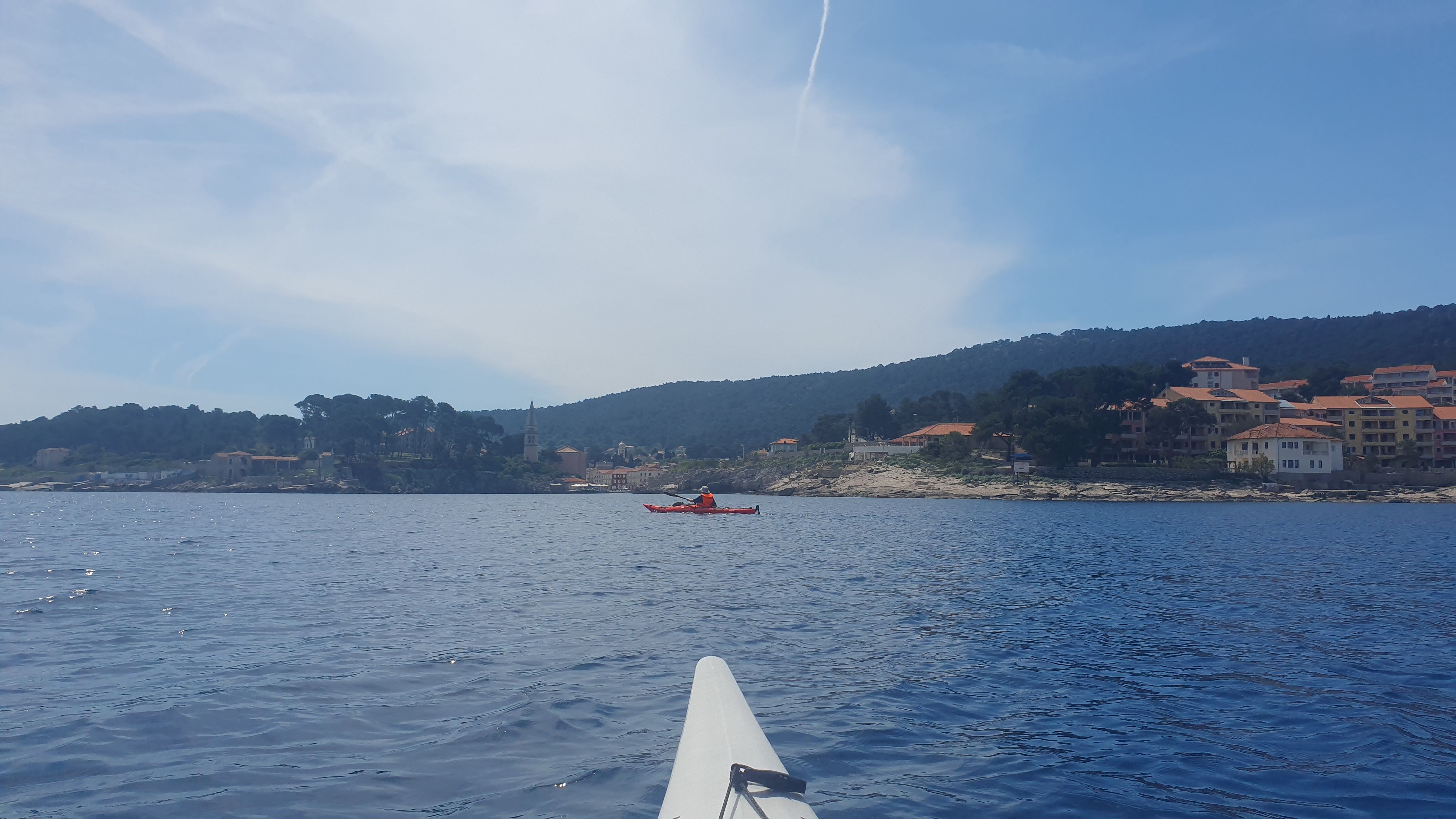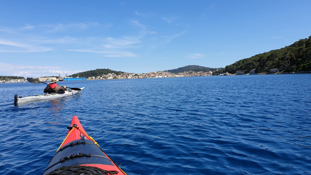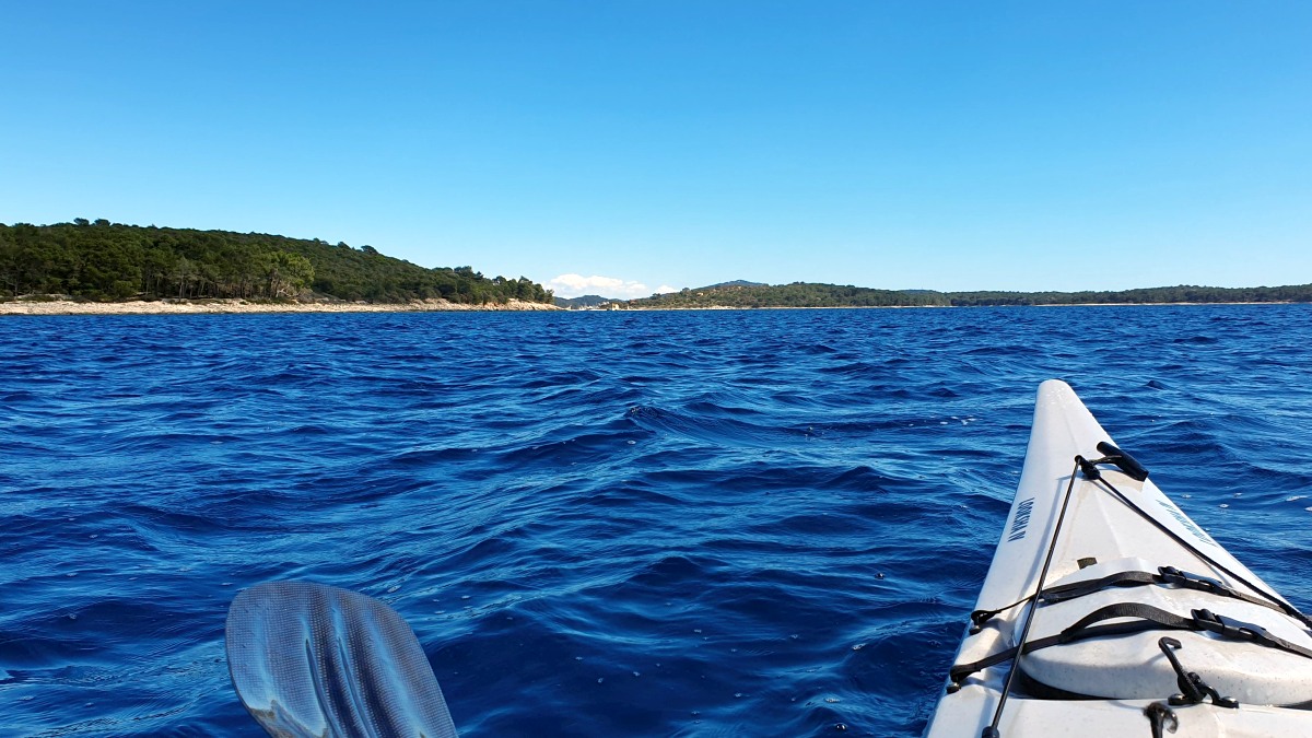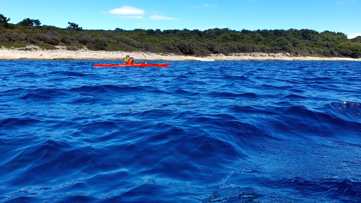 Gestern sind wir dort durchgepaddelt, nachdem wir eine größere Runde seewärts um die vor Mali Lošinj liegenden Inseln gedreht haben. Am Tag zuvor war das nicht möglich. Es zog während dieser ersten Paddeltour plötzlich Wind auf und die Wellen wurden - trotz der vorgelagerten schützenden Inseln - so hoch, dass wir wieder umdrehen mussten.